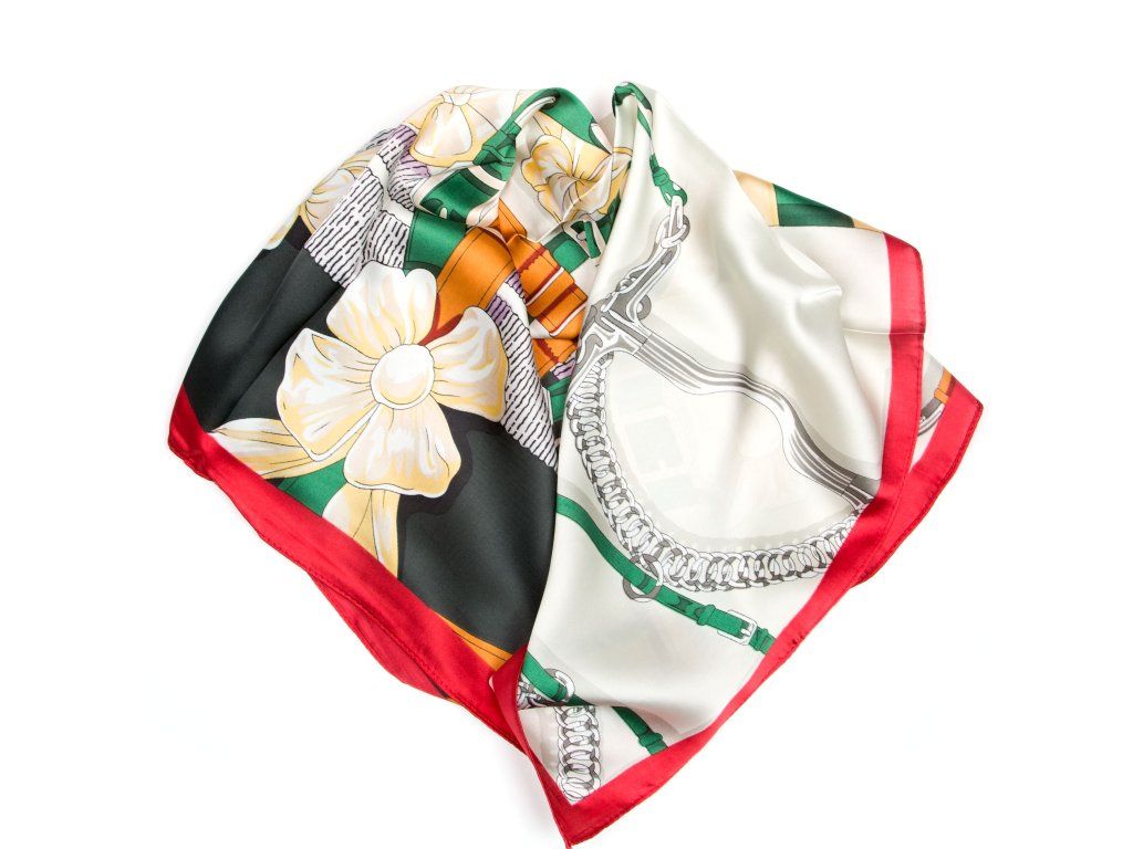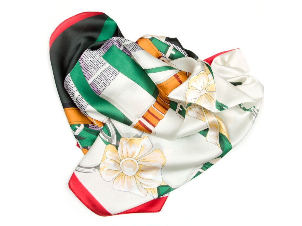 Dámska šatka v béžovej farbe s motívom. Šatku je možné nosiť klasicky na krku, skvele však bude vyzerať aj na kabelke či vo vlasoch.