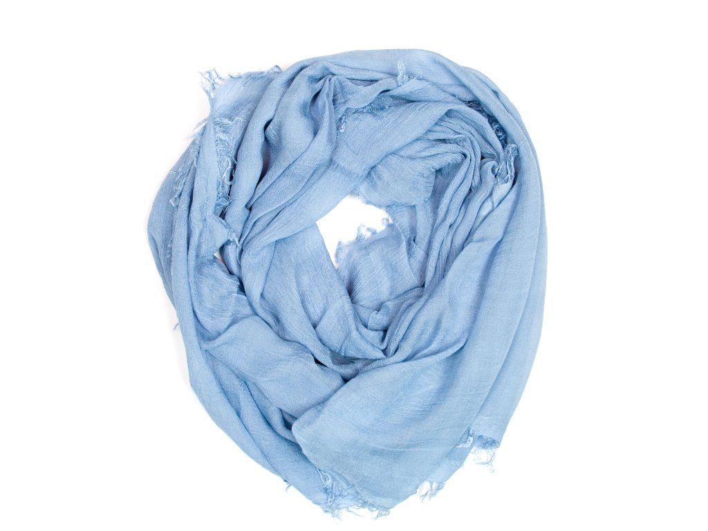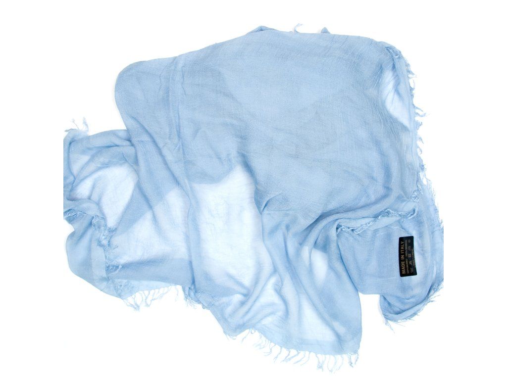 Ľahká dámska šatka vyrobená z bambusového vlákna vo svetlo modrej farbe. Šatka je po obvode zdobená krátkymi strapcami. Šatka môže slúžiť ako pléd na letné večery aj spoločenské udalosti.