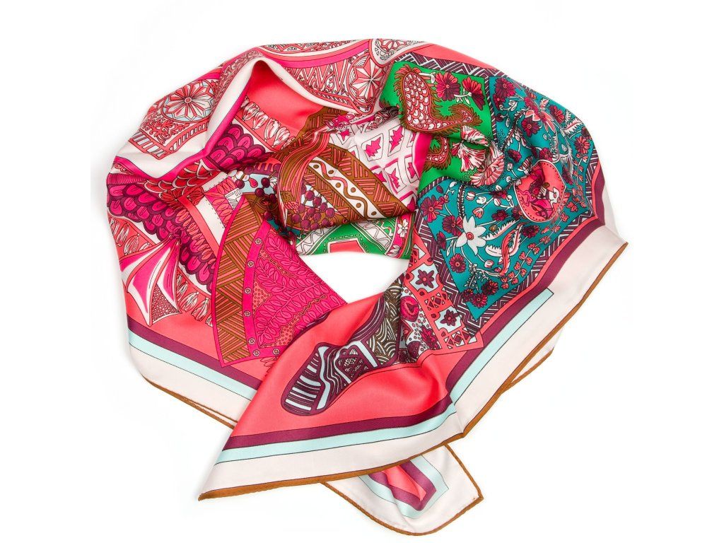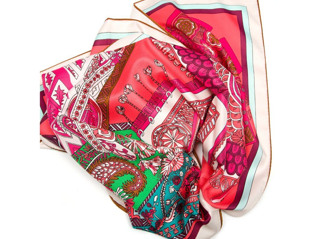 Dámska šatka v multicolor farbe s motívom. Šatku je možné nosiť klasicky na krku, skvele však bude vyzerať aj na kabelke či vo vlasoch.