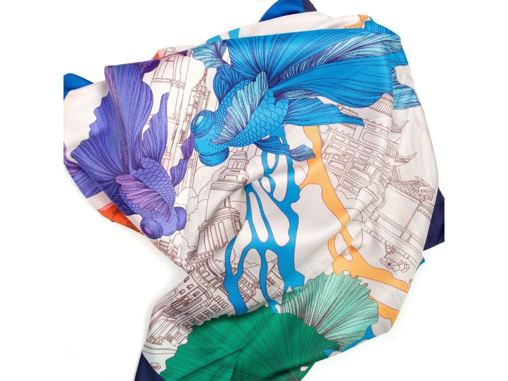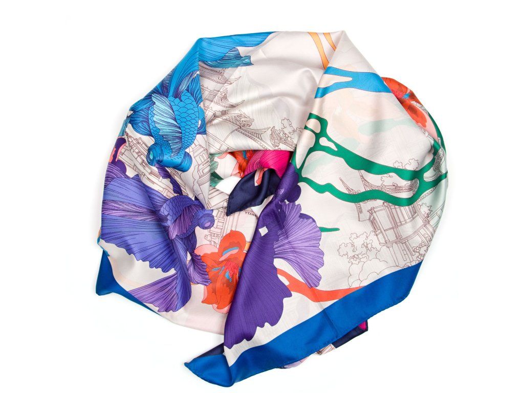Dámska šatka v modrej farbe s motívom. Šatku je možné nosiť klasicky na krku, skvele však bude vyzerať aj na kabelke či vo vlasoch.