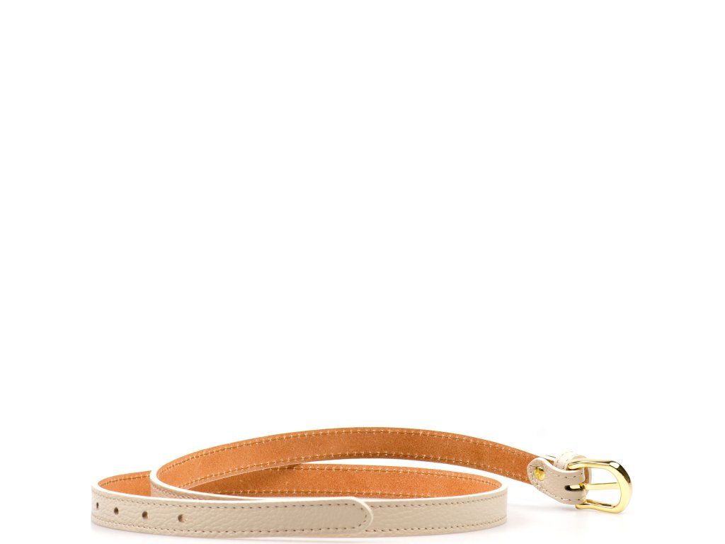 Dámsky kožený opasok v béžovej farbe. Opasok má sponu v zlatej farbe. Dĺžku pásky je možné jednoducho upraviť povolením nitu so skrutkou.