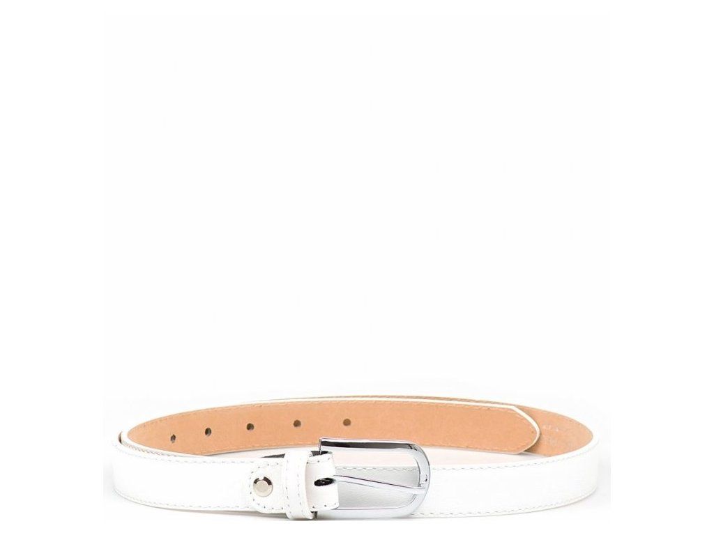 Dámsky kožený opasok v bielej farbe. Opasok má lesklú sponu striebornej farby. Dĺžku je možné jednoducho upraviť povolením nitu so skrutkou.