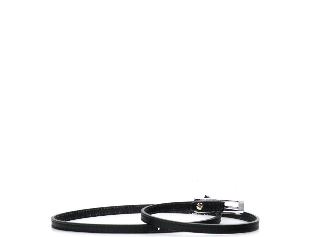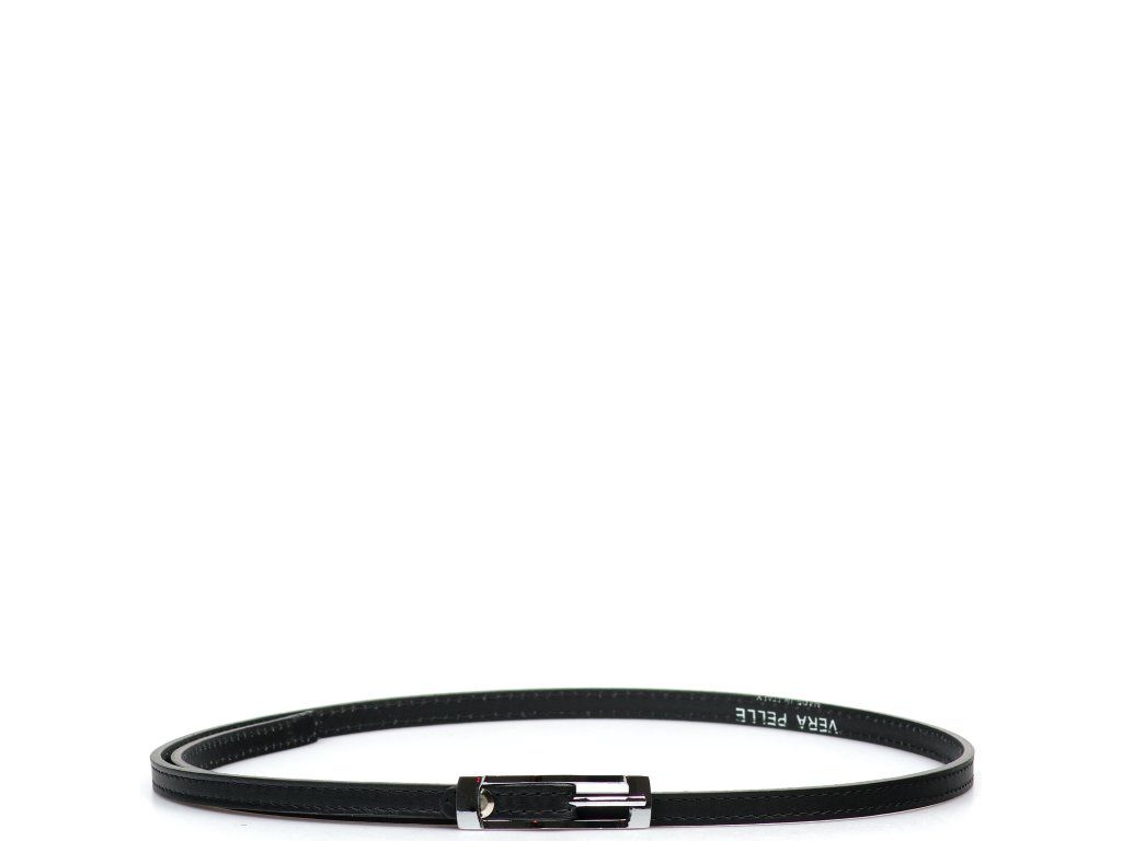 Dámsky kožený opasok v čiernej farbe. Opasok má lesklú hranatú sponu v striebornej farbe. Dĺžku pásky je možné jednoducho upraviť.