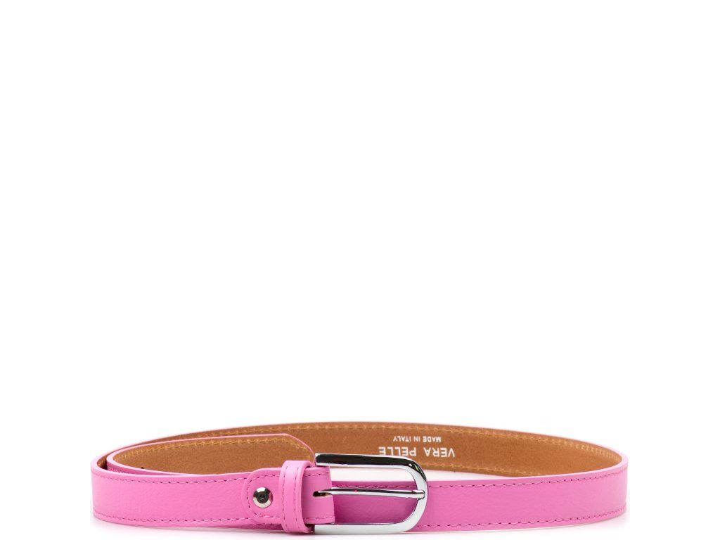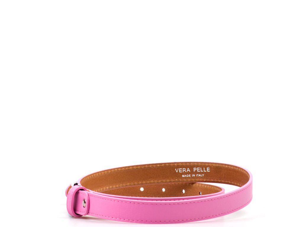 Dámsky kožený opasok v ružovej farbe. Opasok má lesklú sponu striebornej farby. Dĺžku je možné jednoducho upraviť povolením nitu so skrutkou.