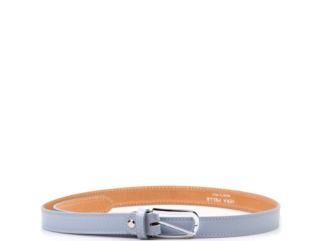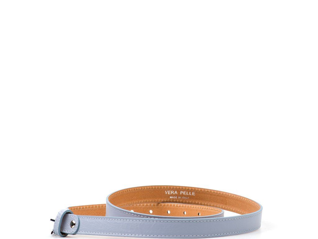 Dámsky kožený opasok vo svetlo modrej farbe. Opasok má lesklú sponu striebornej farby. Dĺžku je možné jednoducho upraviť povolením nitu so skrutkou.