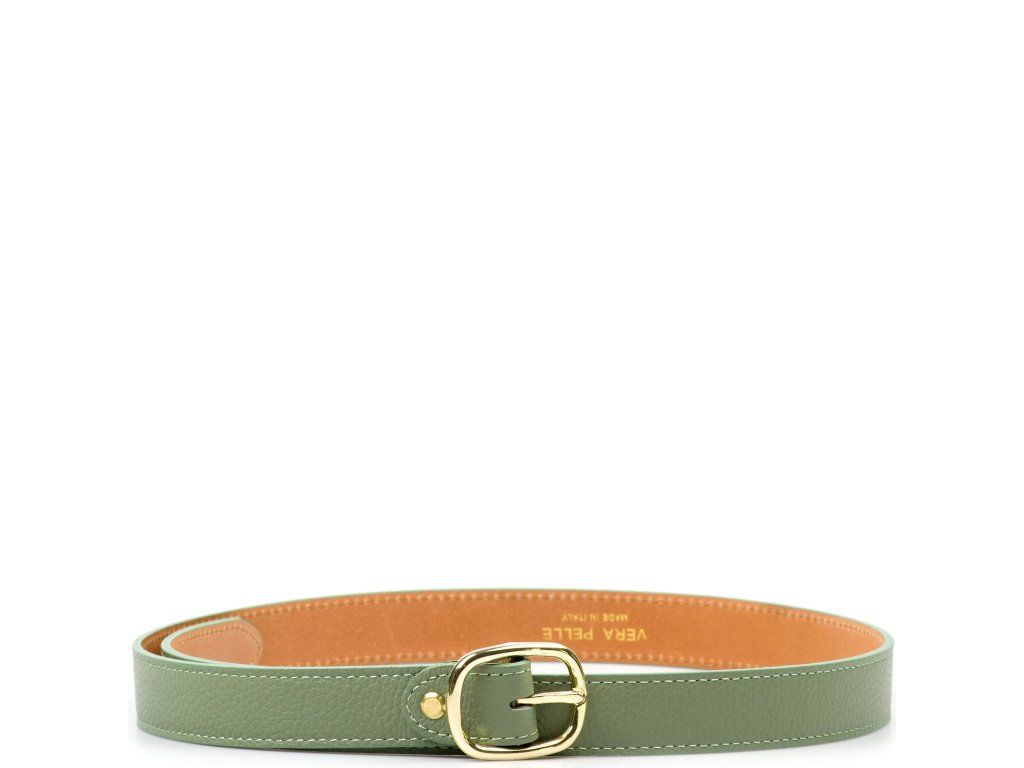Dámsky kožený opasok v zelenej farbe. Opasok má sponu v zlatej farbe. Dĺžku pásky je možné jednoducho upraviť povolením nitu so skrutkou.