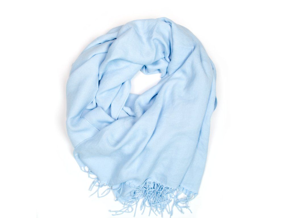 Dámsky pašmínový šál vo svetlo modrej farbe zdobený dlhými strapcami.