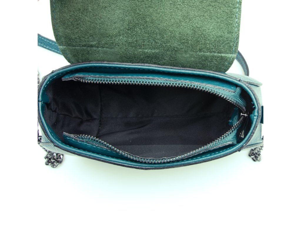 Malá kožená crossbody kabelka s retiazkovým popruhom v petrolejovej farbe. Súčasťou kabelky je popruh s karabínami v kombinácii retiazok a kože. Interiér kabelky disponuje jedným úložným vreckom. Kabelka sa uzatvára zipsom a klopou na cvoček.