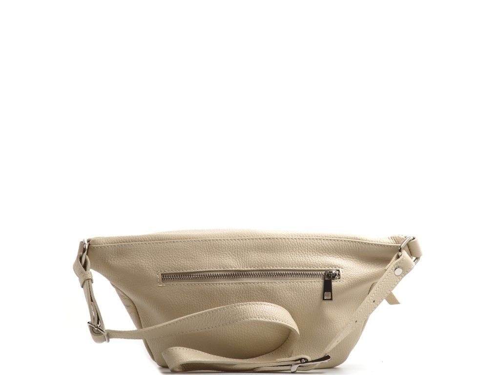 Veľká kožená crossbody oblička v béžovej farbe. Ľadvinka má fixný popruh so zapínaním na pracku. Interiér kabelky má jedno hlavné úložné vrecko a malé bočné na zips. Zadná strana obličky je vybavená malým funkčným vreckom na zips. Ľadvinka sa uzatvára zipsom.