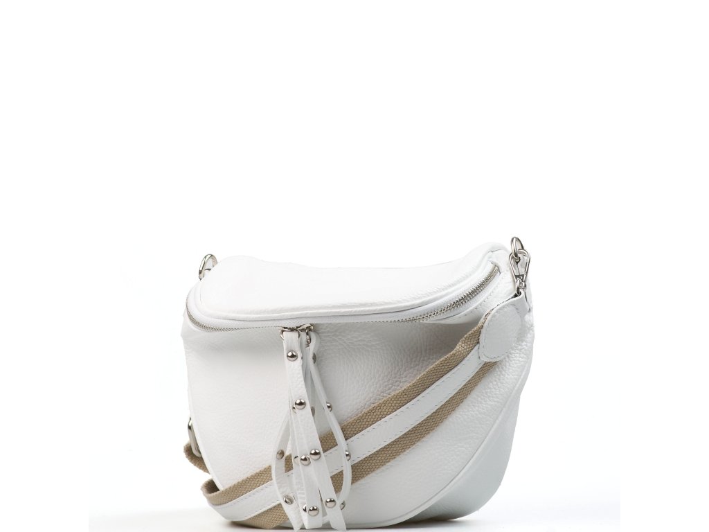 Dámska kožená crossbody ľadvinka v bielej farbe. Ľadvinka doslova crossbody (cez telo) je ďalším spôsobom, ako obličku nosiť ako master. Kabelka štýlu veľká oblička sa nosí nakrátko cez telo. Interiér má k dispozícii jedno hlavné úložné vrecko. Uzatvára sa zipsom.