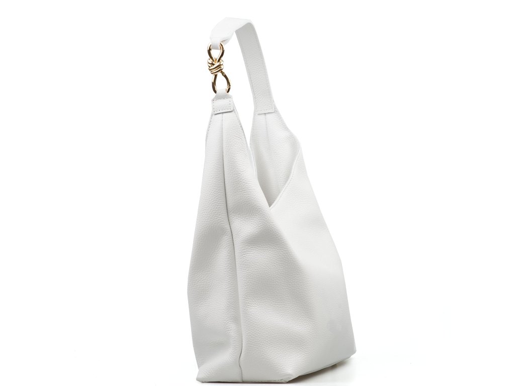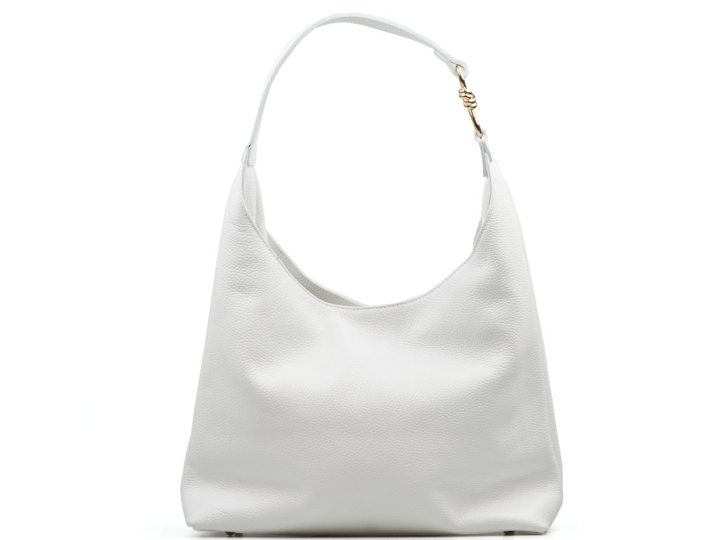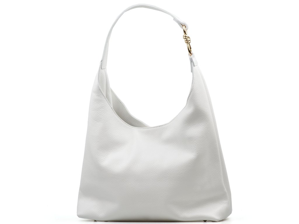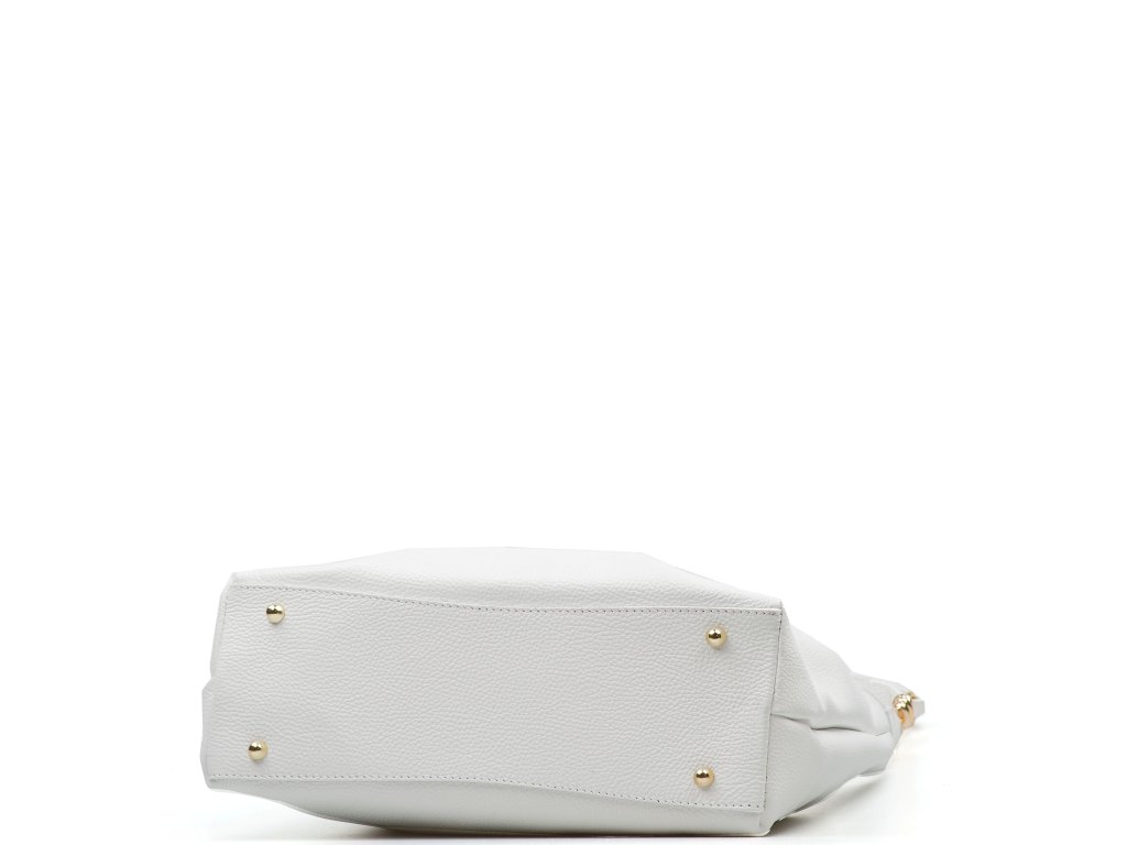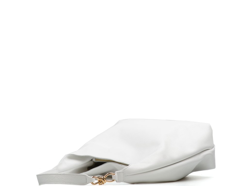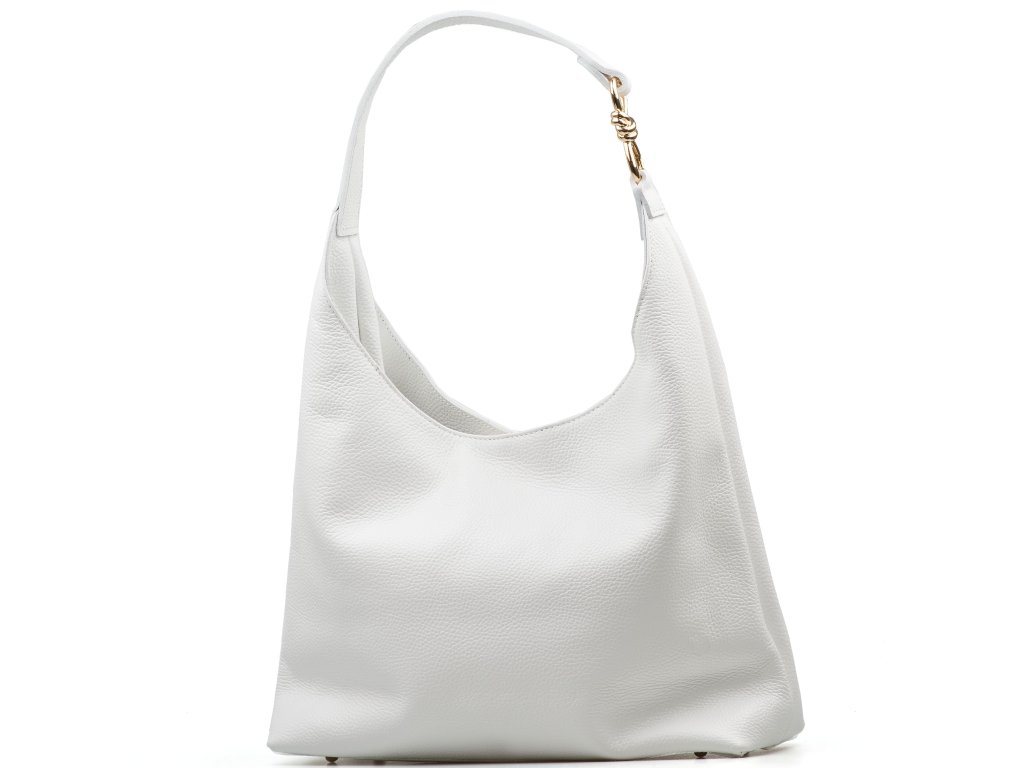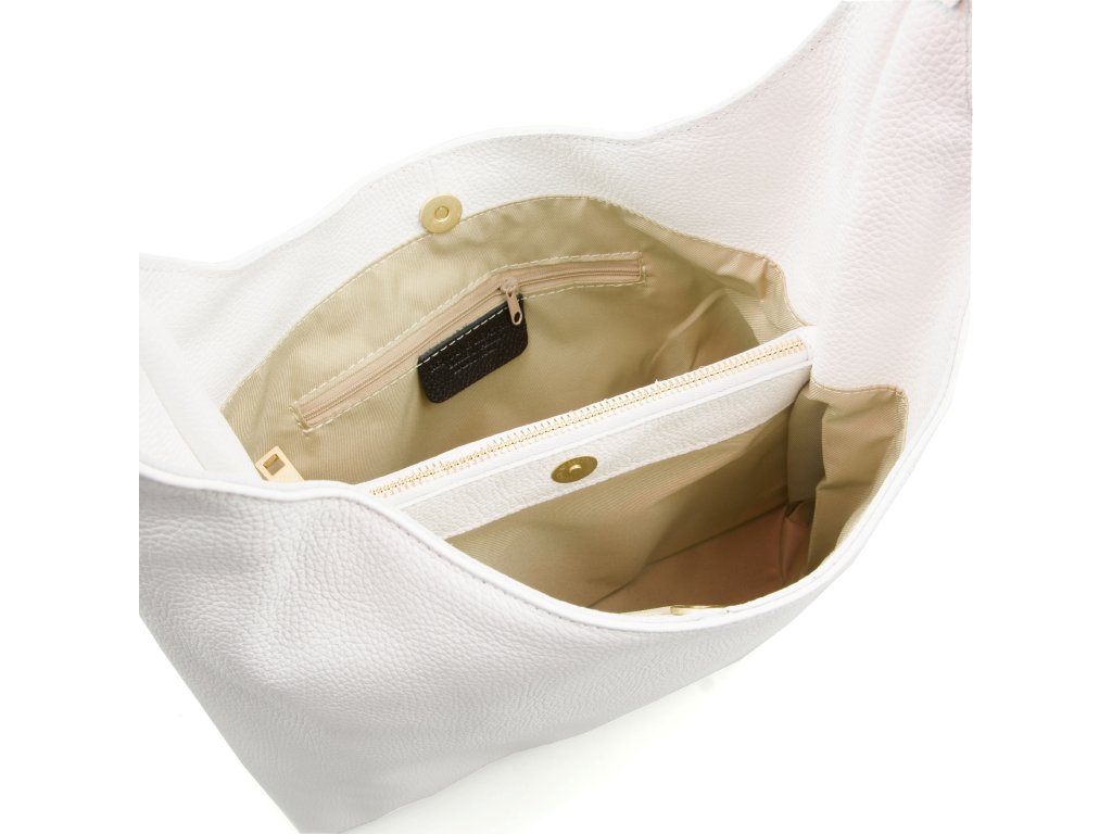 Minimalistická kožená kabelka cez rameno v bielej farbe pôsobí elegantne a nadčasovo. Jej interiér ponúka tri praktické úložné vrecká, z ktorých prostredné sa uzatvára zipsom pre bezpečné uloženie cenností. Jemným detailom, ktorý kabelke dodáva ženský šarm, je zlatá mašľa umiestnená na uchu. Kabelka sa uzatvára cvokom.