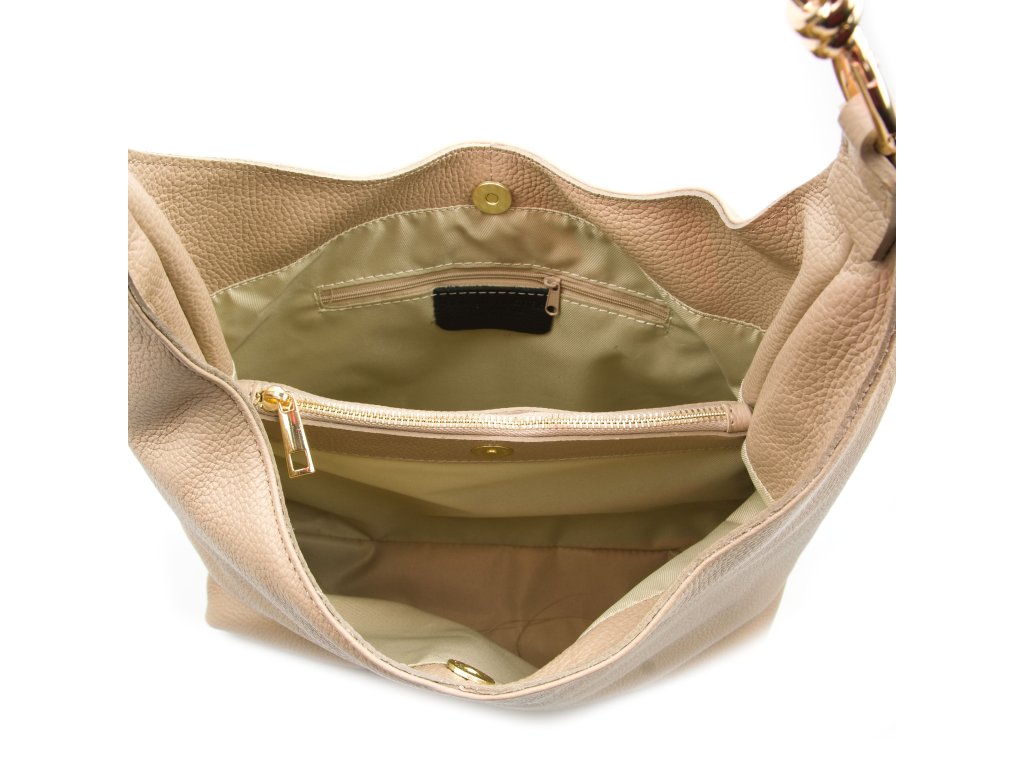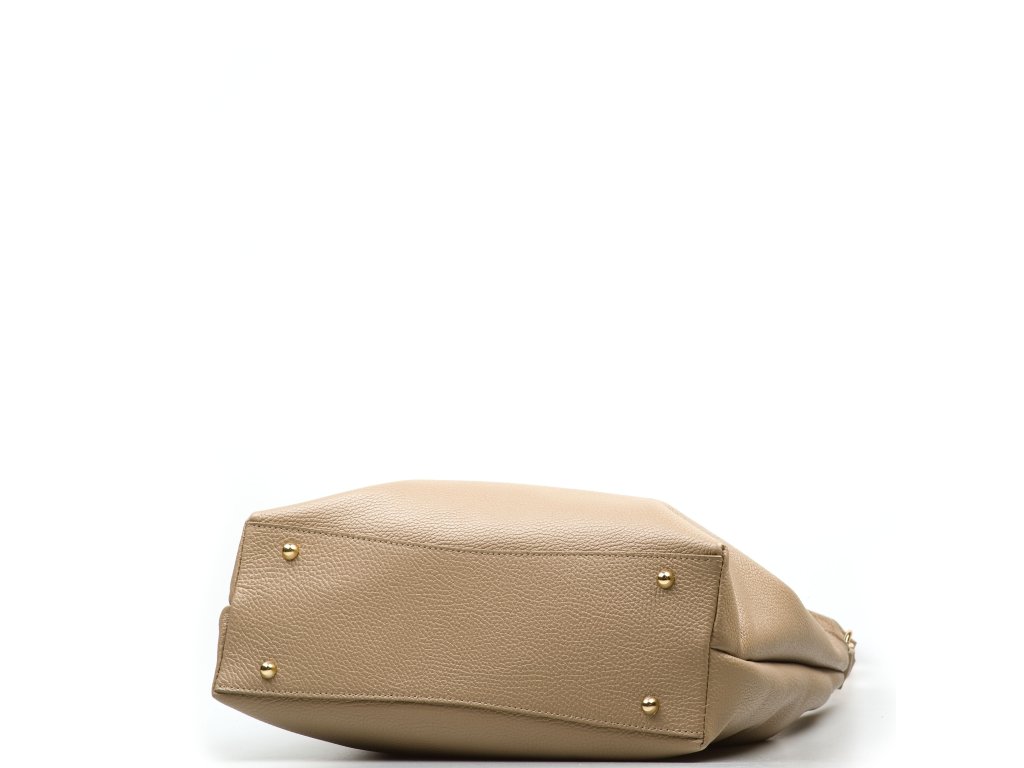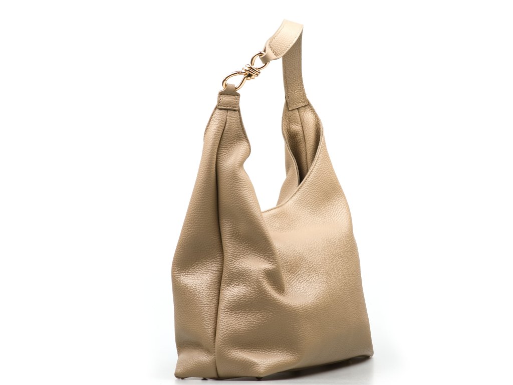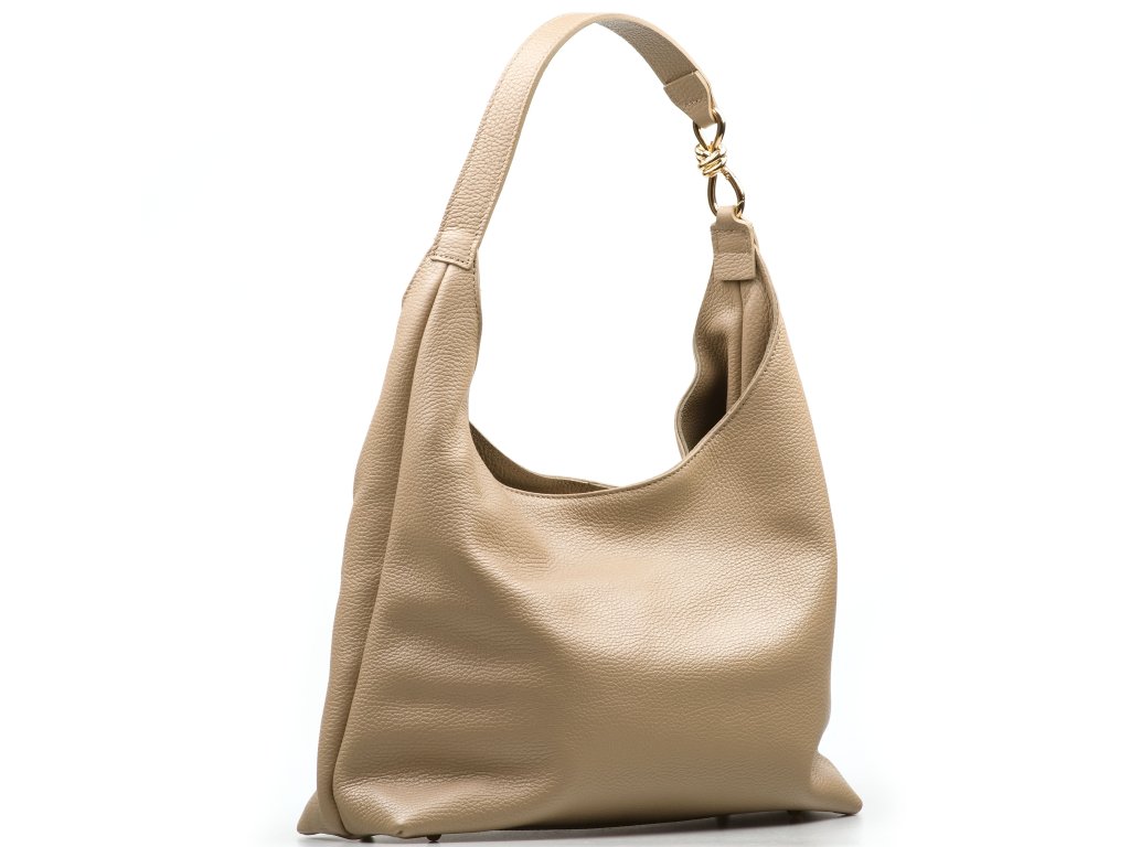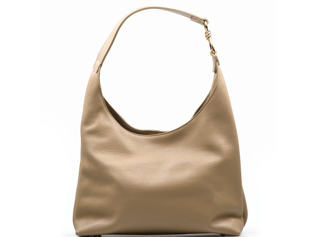 Minimalistická kožená kabelka cez rameno v taupe farbe pôsobí elegantne a nadčasovo. Jej interiér ponúka tri praktické úložné vrecká, z ktorých prostredné sa uzatvára zipsom pre bezpečné uloženie cenností. Jemným detailom, ktorý kabelke dodáva ženský šarm, je zlatá mašľa umiestnená na uchu. Kabelka sa uzatvára cvokom.