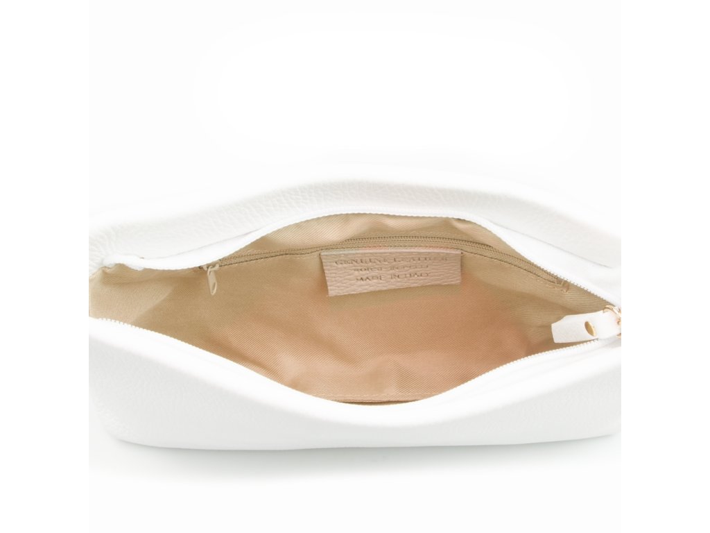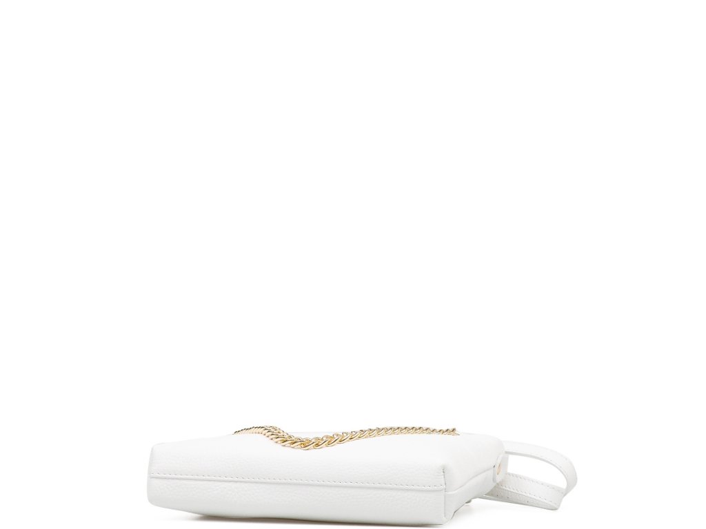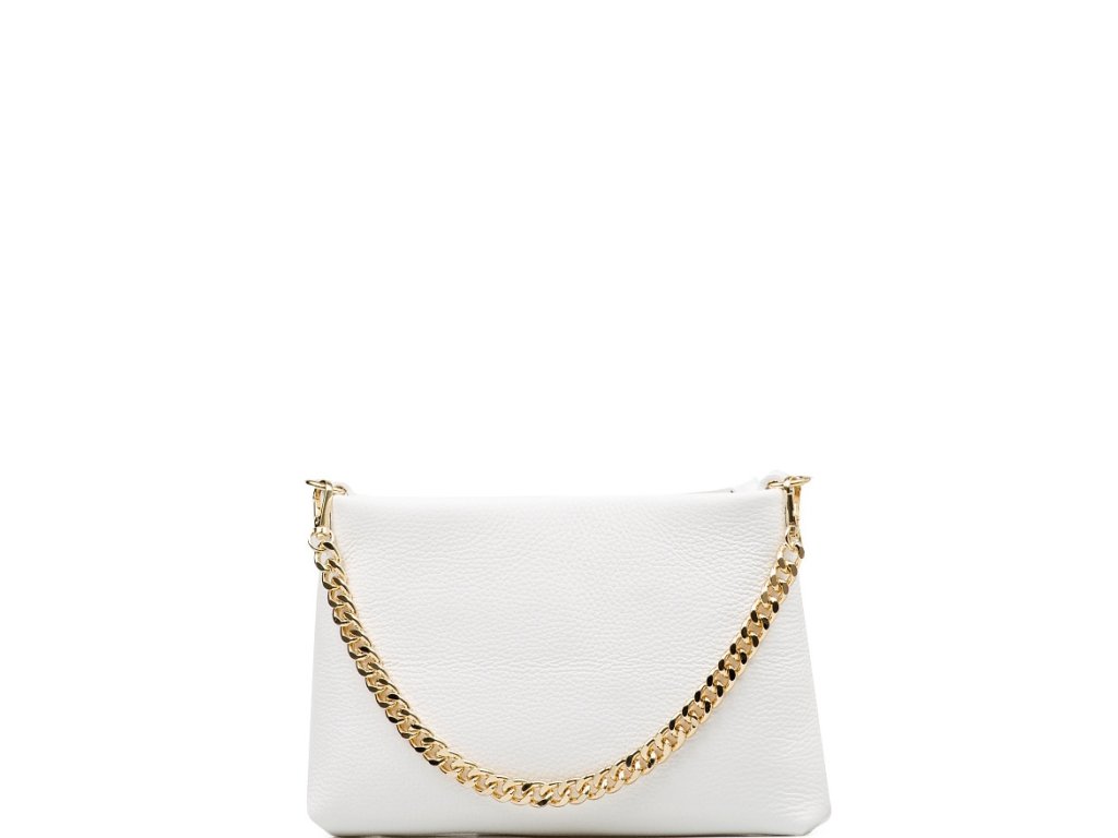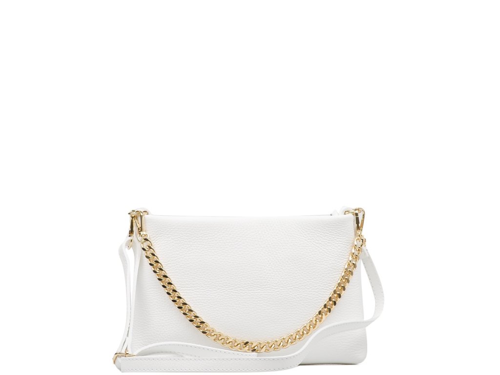 Kožená crossbody kabelka s retiazkovým popruhom v bielej farbe. Kabelka má dva odnímateľné popruhy, jeden krátky retiazkový a jeden dlhý kožený. Interiér kabelky má k dispozícii jedno hlavné úložné vrecko a malé bočné. Kabelka sa uzatvára zipsom.