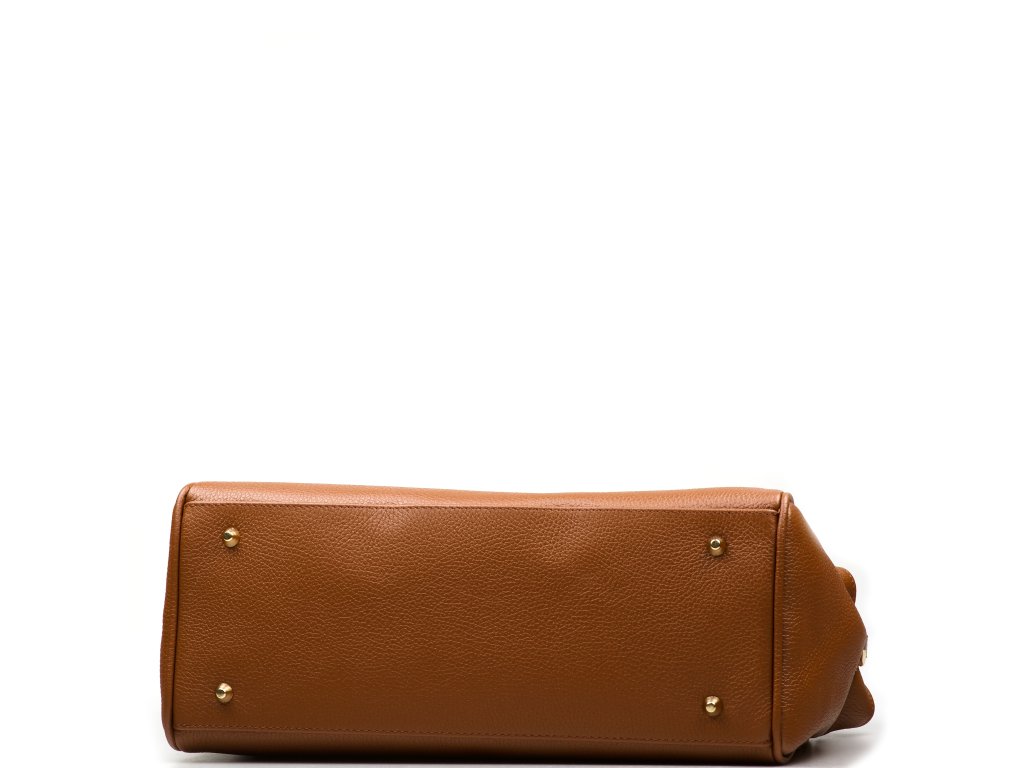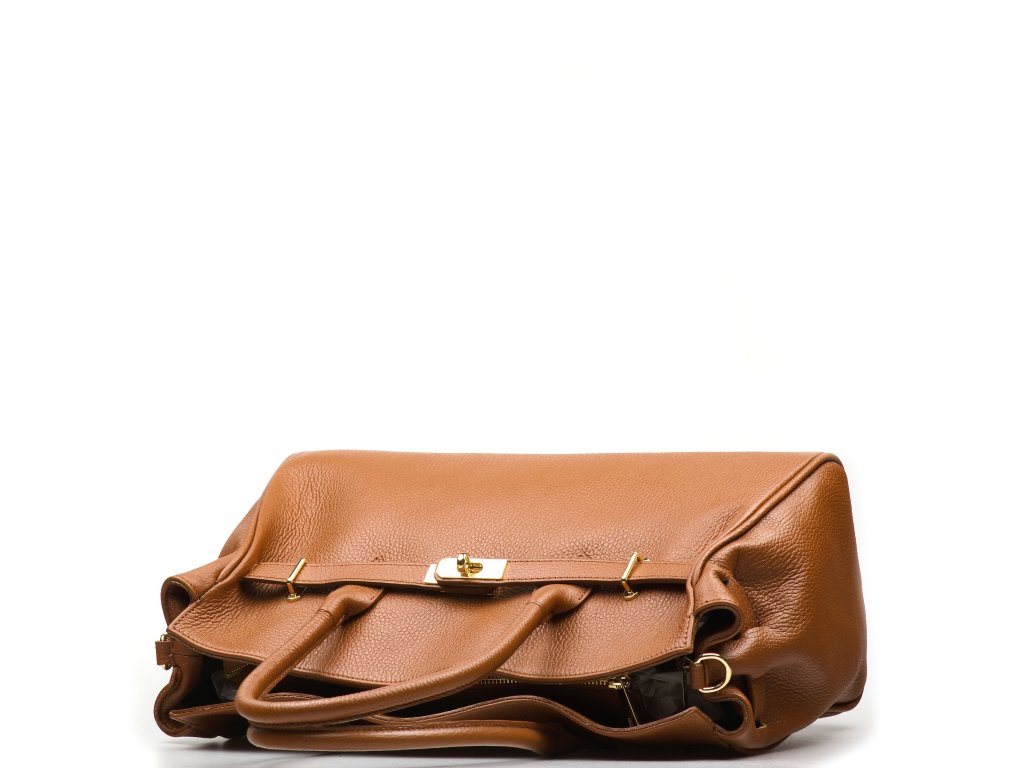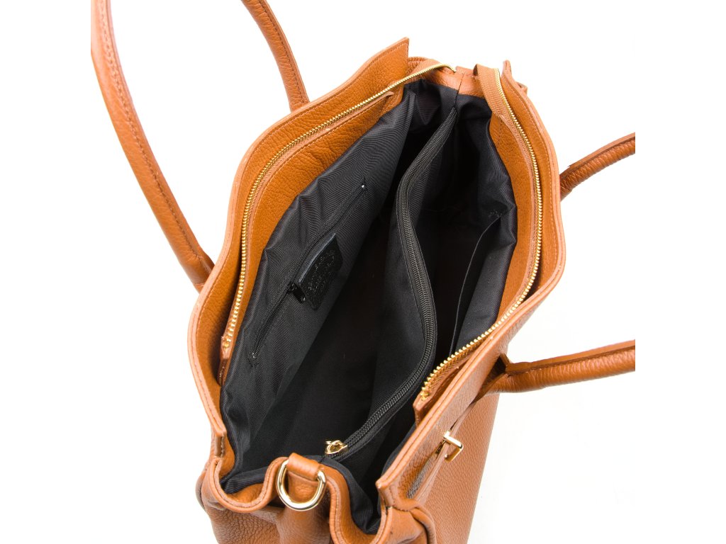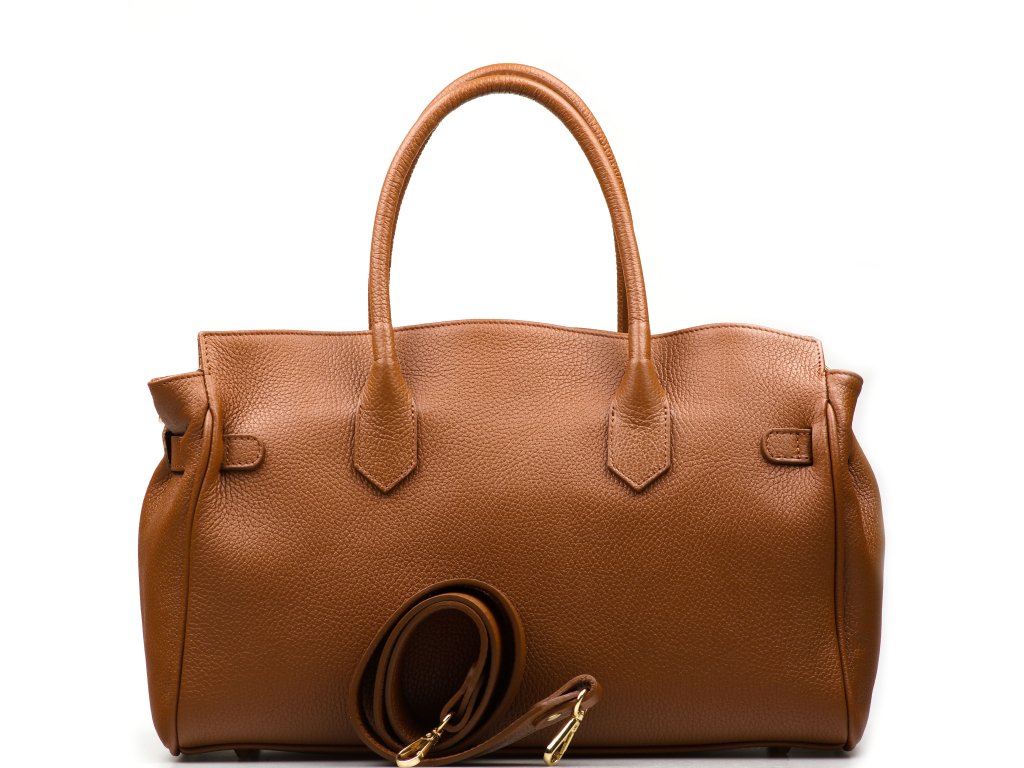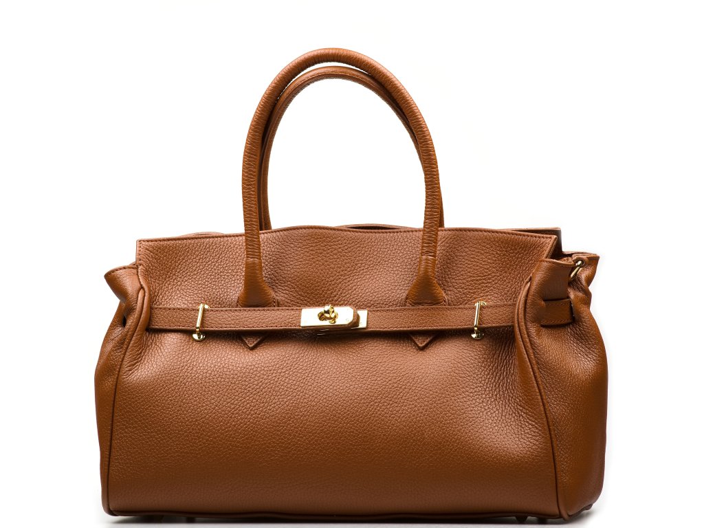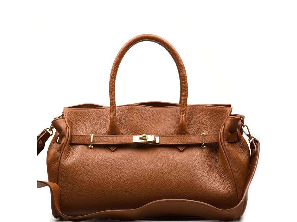 Kožená kabelka do ruky aj cez rameno v koňakovo hnedej farbe. Interiér kabelky disponuje troma vreckami, pričom jedno je uzatvárateľné zipsom. Kabelka má aj malé bočné vrecká. Súčasťou kabelky je prídavný popruh s karabínami. Hornú časť kabelky zdobí kožený popruh so zlatými sponami.