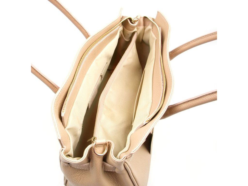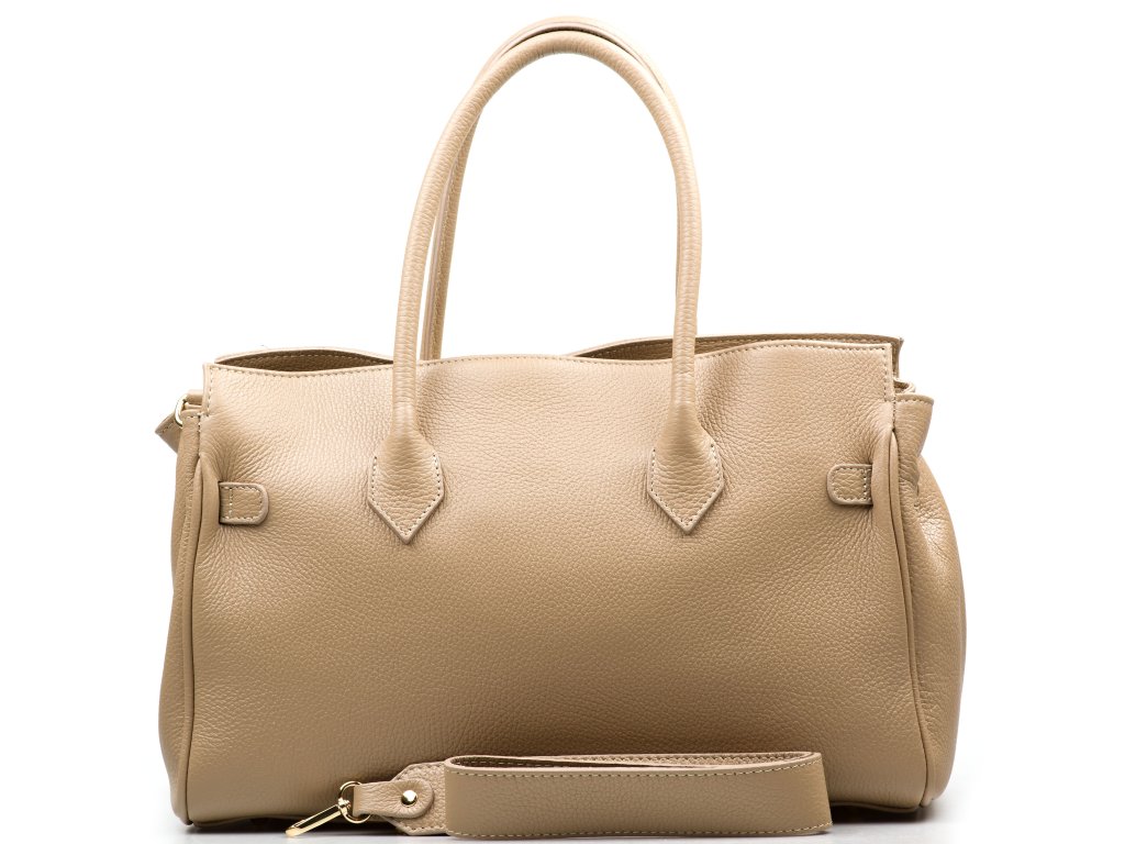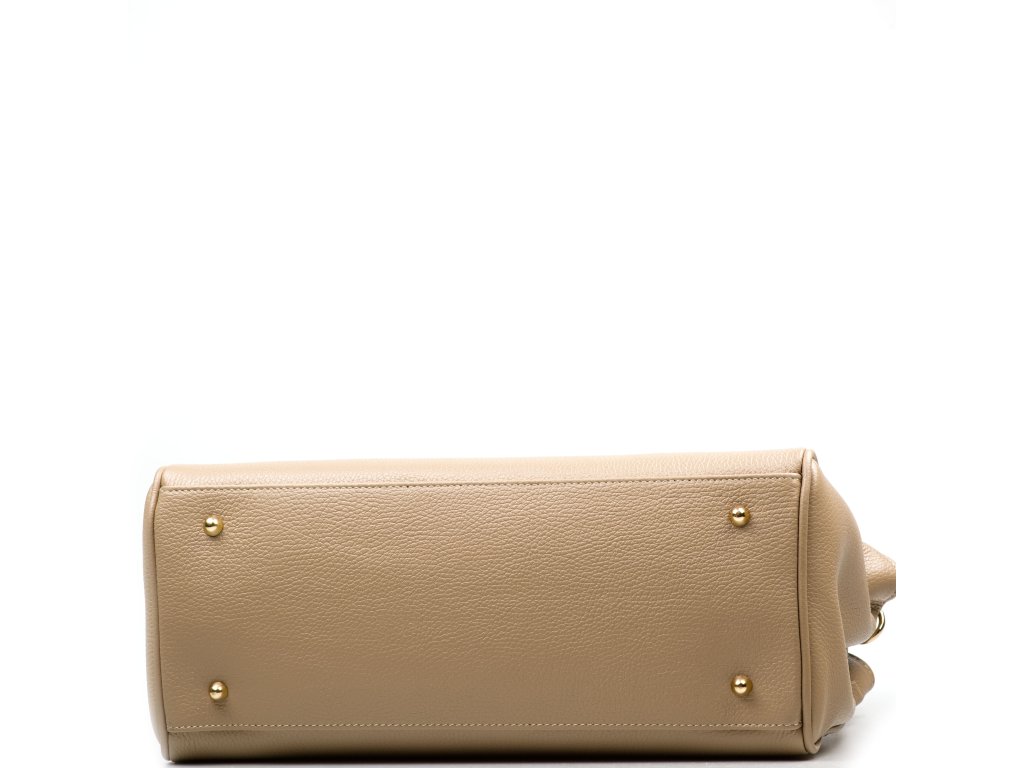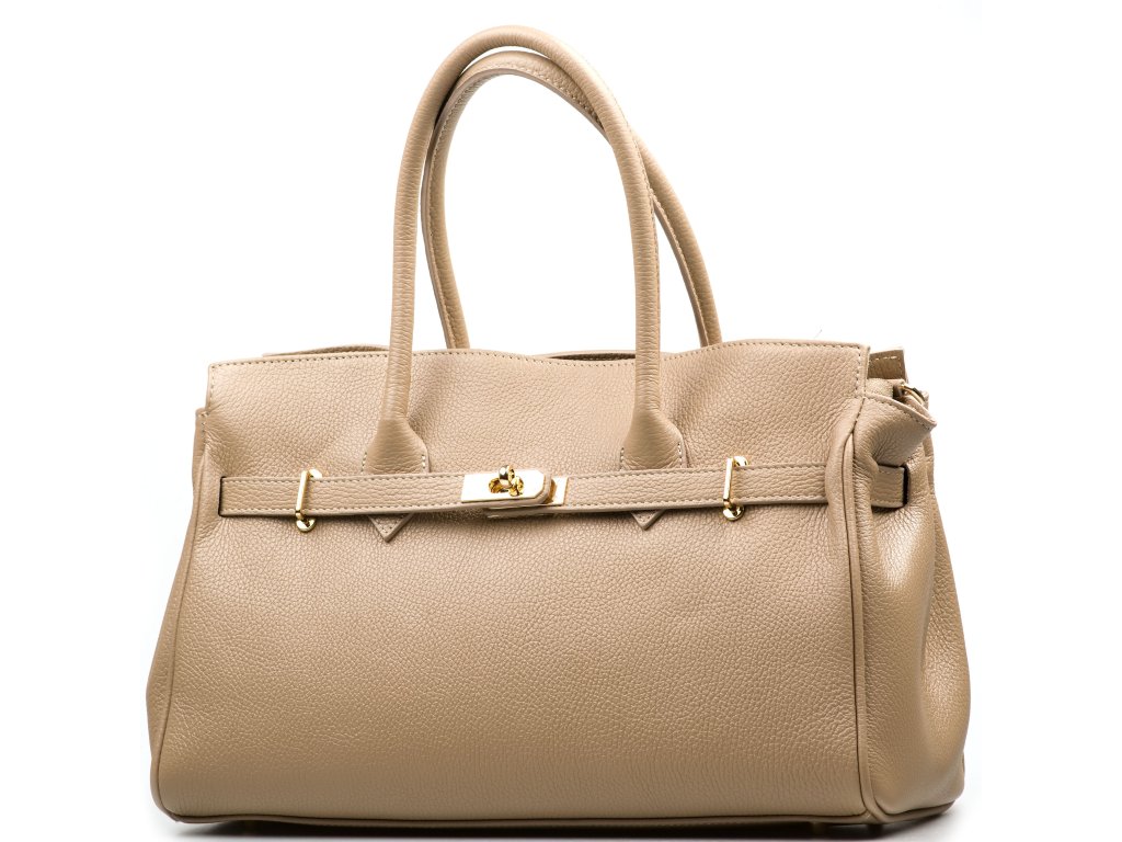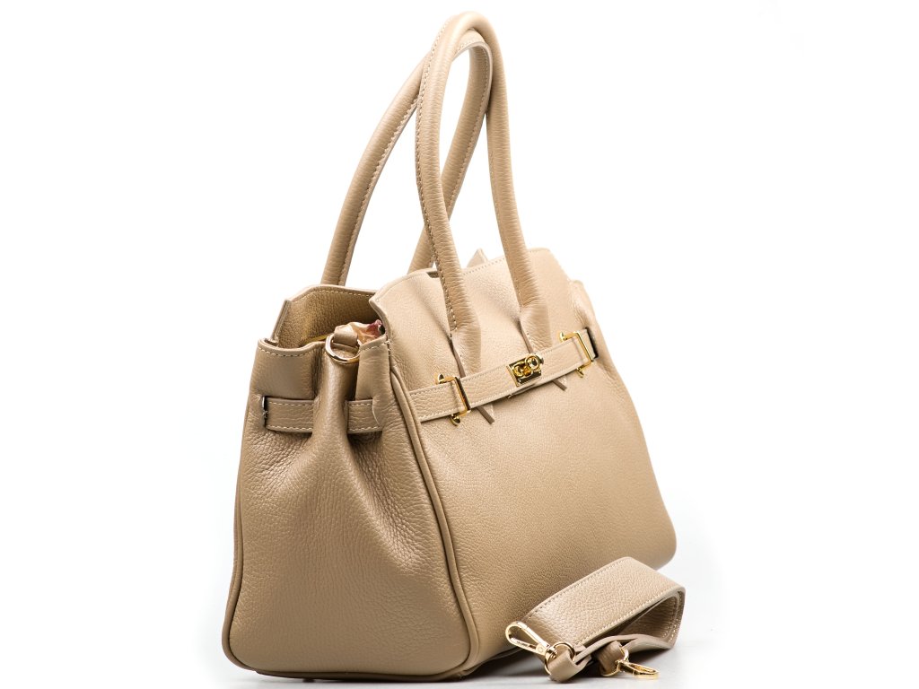 Kožená kabelka do ruky aj cez rameno v taupe farbe. Interiér kabelky disponuje troma vreckami, pričom jedno je uzatvárateľné zipsom. Kabelka má aj malé bočné vrecká. Súčasťou kabelky je prídavný popruh s karabínami. Hornú časť kabelky zdobí kožený popruh so zlatými sponami.