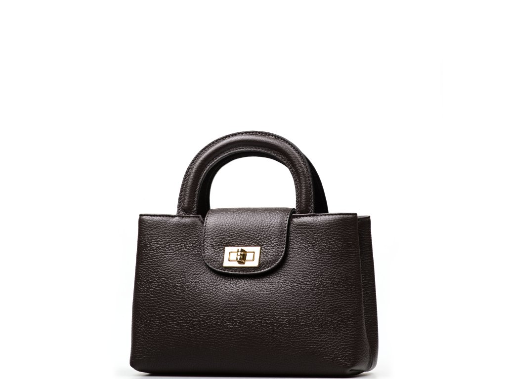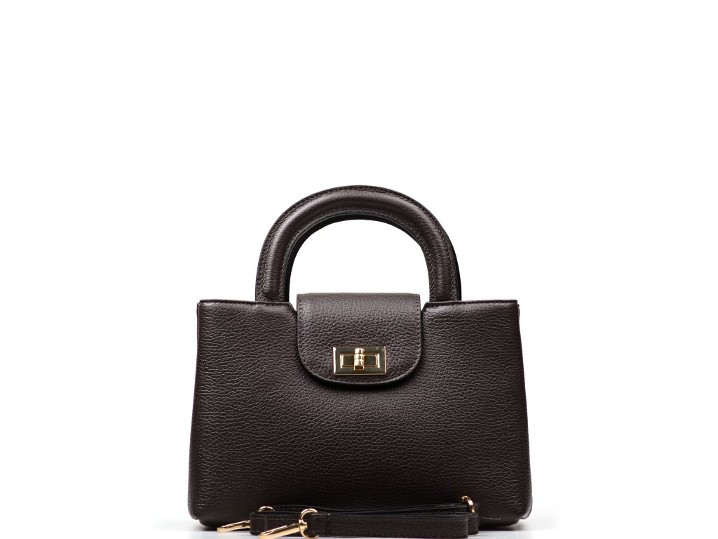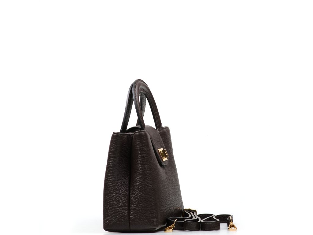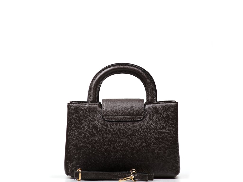 Minimalistická kožená kabelka v tmavo hnedej farbe. Interiér kabelky disponuje troma hlavnými vreckami, pričom prostredné je uzatvárateľné zipsom. Kabelku môžete nosiť v ruke alebo cez rameno, vďaka nastaviteľnému prídavného popruhu. Kabelku zdobí zlaté kovanie, ktorým sa kabelka zapína. Kabelka je uzatvárateľná chlopňou.