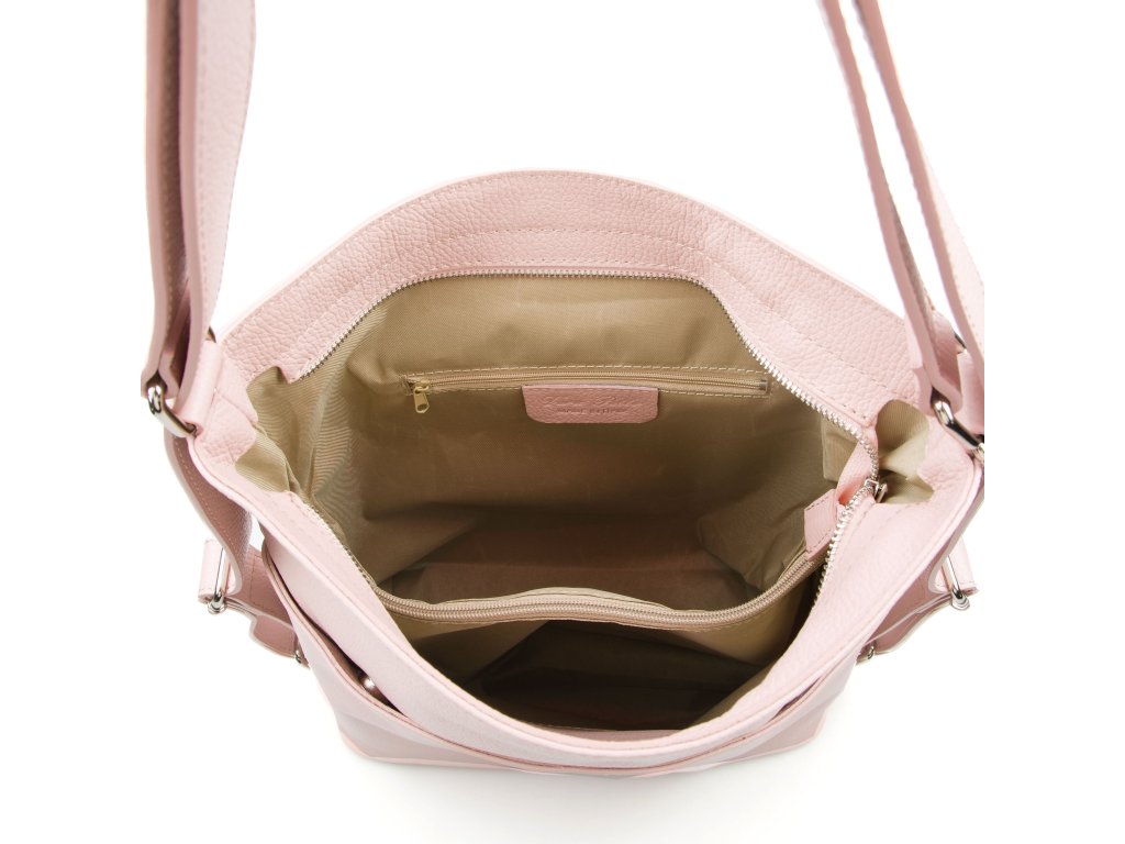Dámska kožená kabelka v ružovej farbe, ktorá sa behom chvíle premení na batôžtek – ideálna, keď chcete mať voľné ruky, ale nechcete robiť kompromisy v štýle. Vďaka nastaviteľnému popruhu si ju ľahko predĺžite alebo skrátite presne podľa potreby. Na prednej strane nájdete dve praktické vrecká na cvok pre veci, ktoré potrebujete mať rýchlo po ruke (napr. telefón, vreckovky alebo kľúče). Vnútri kabelka ponúka tri úložné vrecká, z ktorých jedno je uzatvárateľné zipsom pre bezpečné uloženie cenností. Hlavný priestor sa zapína na zips, takže obsah zostane spoľahlivo chránený aj na cestách.