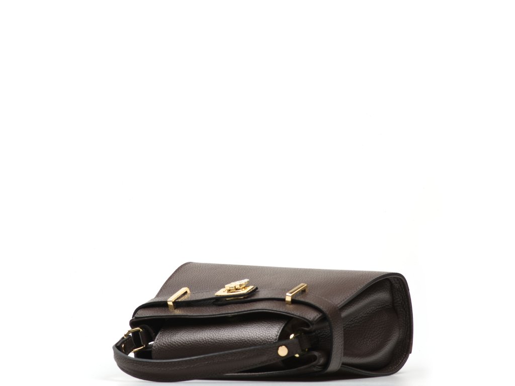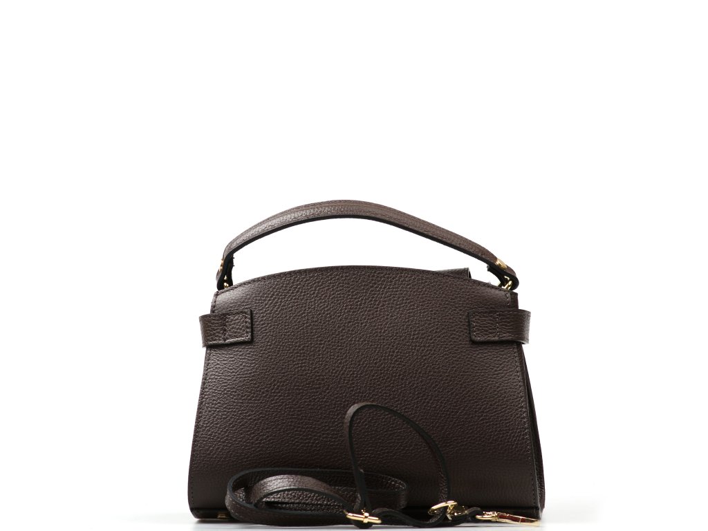 Minimalistická kožená kabelka v tmavo hnedej farbe. Interiér kabelky disponuje jedným hlavným vreckom a jedným malým zadným, ktoré je uzatvárateľné zipsom. Kabelku môžete nosiť v ruke alebo cez rameno. Kabelku zdobí zlaté kovanie, ktorým sa kabelka zapína. Kabelka je uzatvárateľná zipsom a chlopňou.