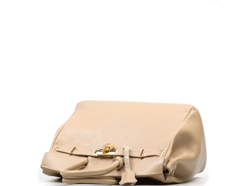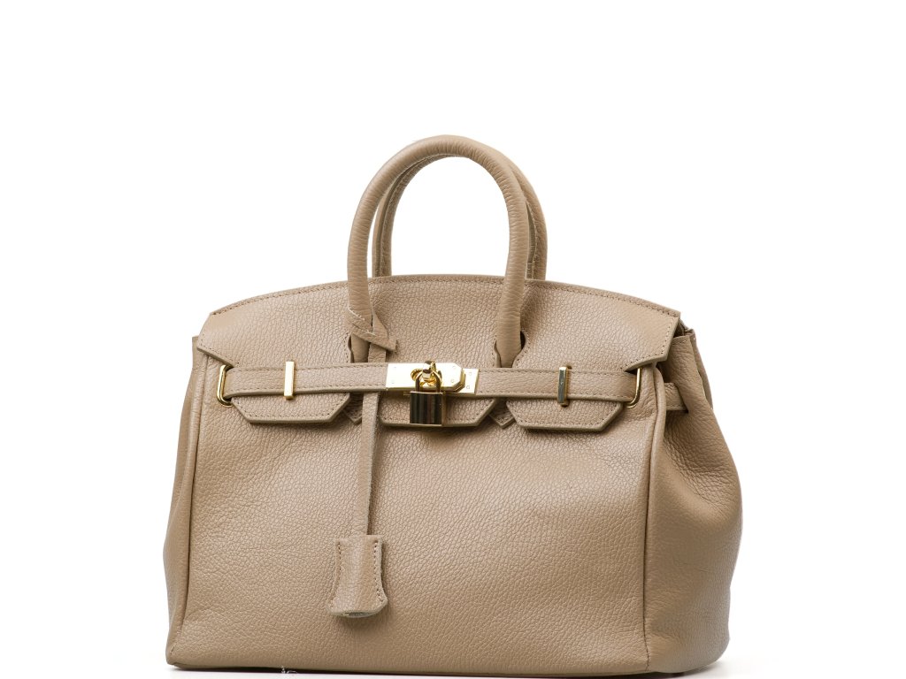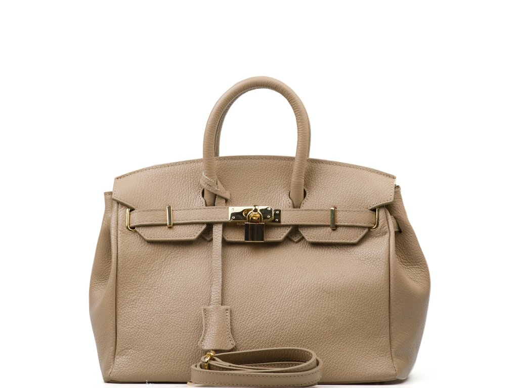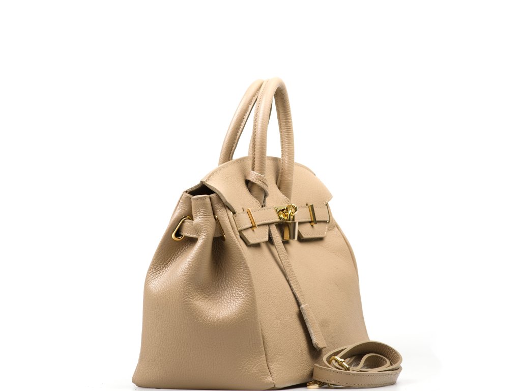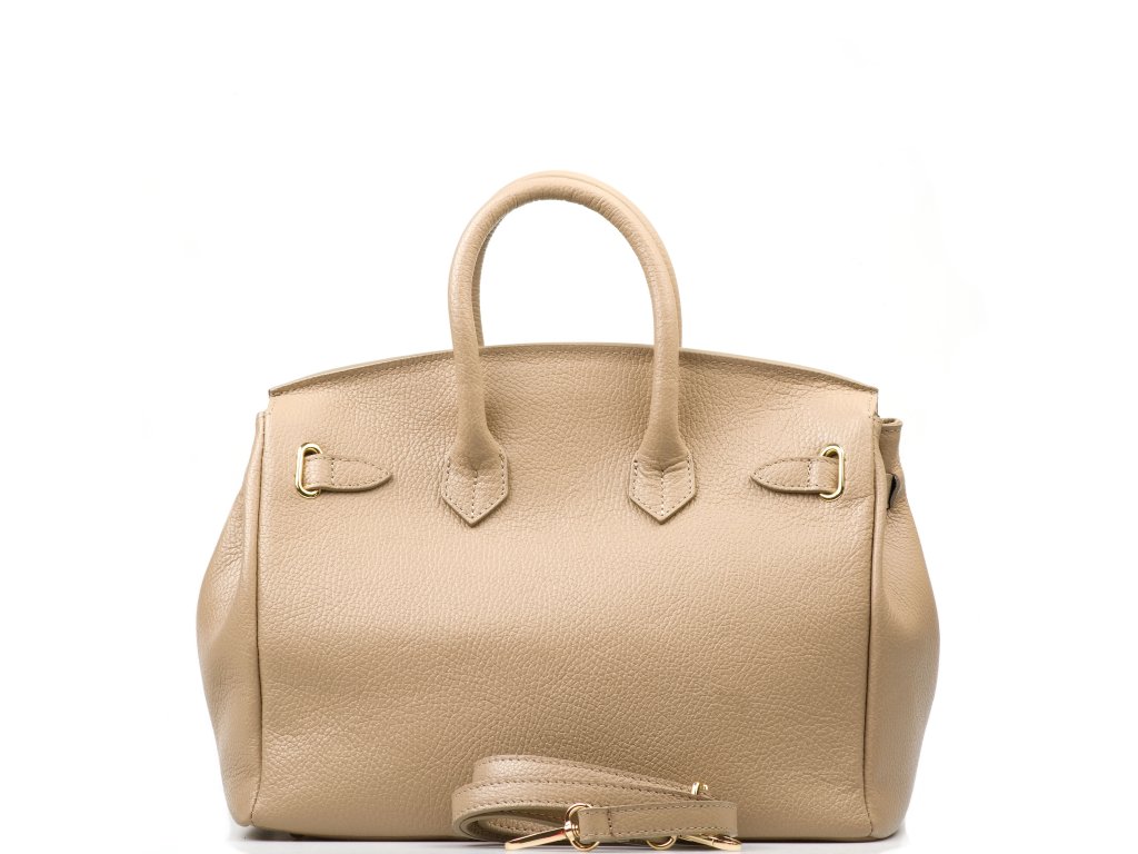 Kožená kabelka v taupe farbe, ktorú môžete nosiť elegantne v ruke aj pohodlne cez rameno. Vnútri ponúka jedno hlavné úložné vrecko na všetko podstatné a jedno menšie bočné vrecko na drobnosti, ktoré chcete mať hneď po ruke. Hornú časť zdobí kožený popruh so zlatými sponami, ktorý kabelke dodáva výrazný, nadčasový detail. Kabelka sa uzatvára chlopňou so zámkom, takže vaše veci zostanú bezpečne uložené aj na cestách.