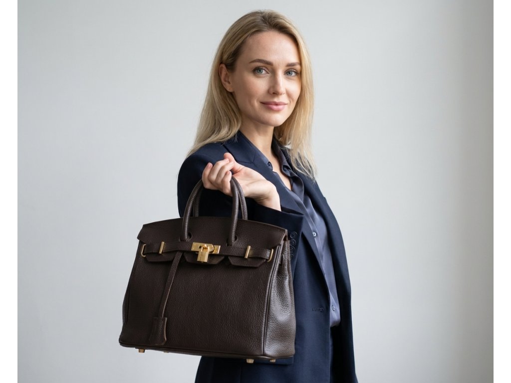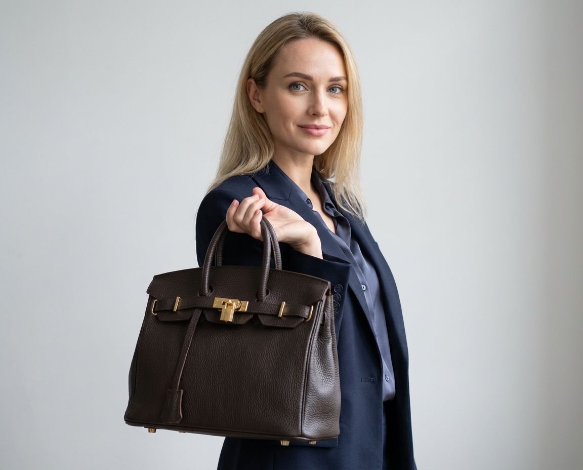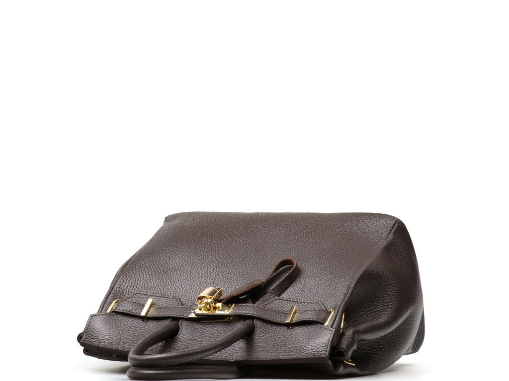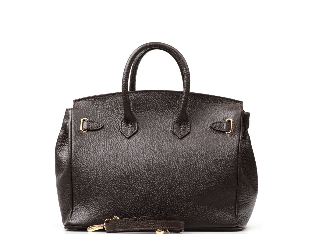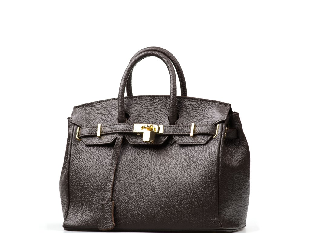 Kožená kabelka v hnedej farbe, ktorú môžete nosiť elegantne v ruke aj pohodlne cez rameno. Vnútri ponúka jedno hlavné úložné vrecko na všetko podstatné a jedno menšie bočné vrecko na drobnosti, ktoré chcete mať hneď po ruke. Hornú časť zdobí kožený popruh so zlatými sponami, ktorý kabelke dodáva výrazný, nadčasový detail. Kabelka sa uzatvára chlopňou so zámkom, takže vaše veci zostanú bezpečne uložené aj na cestách.
