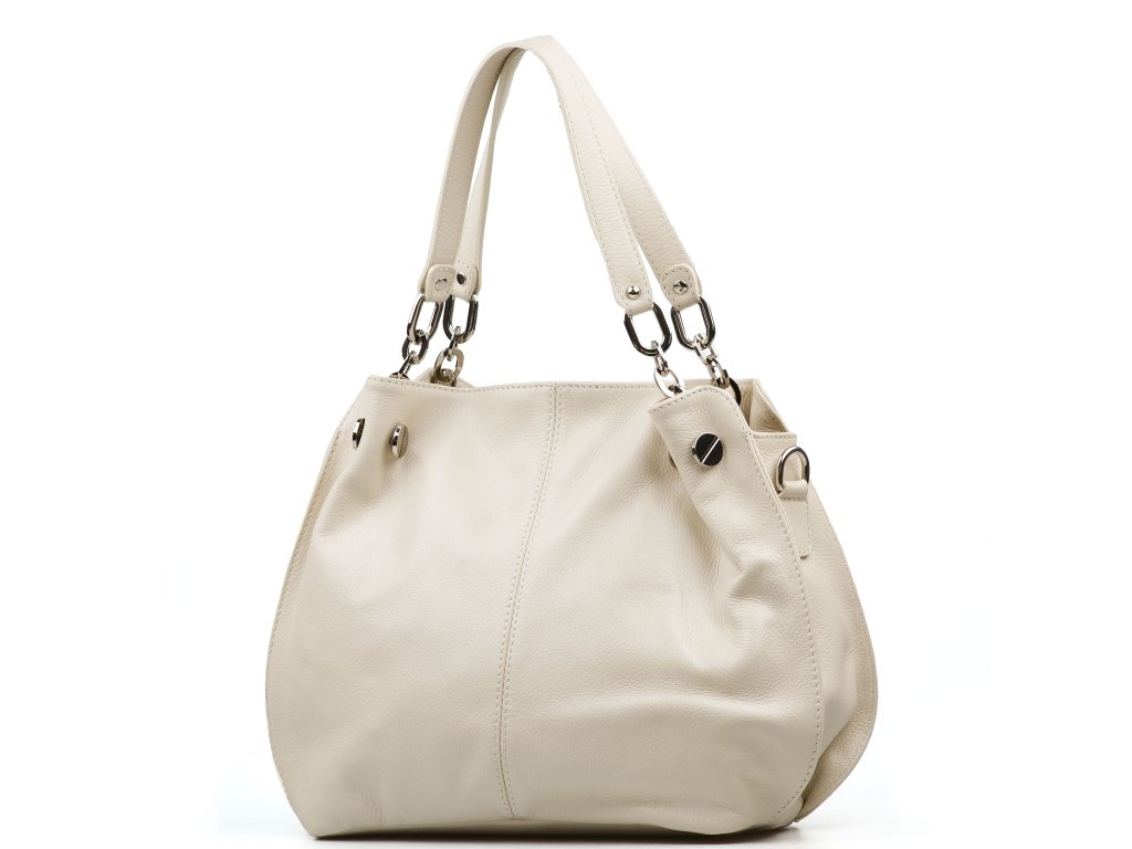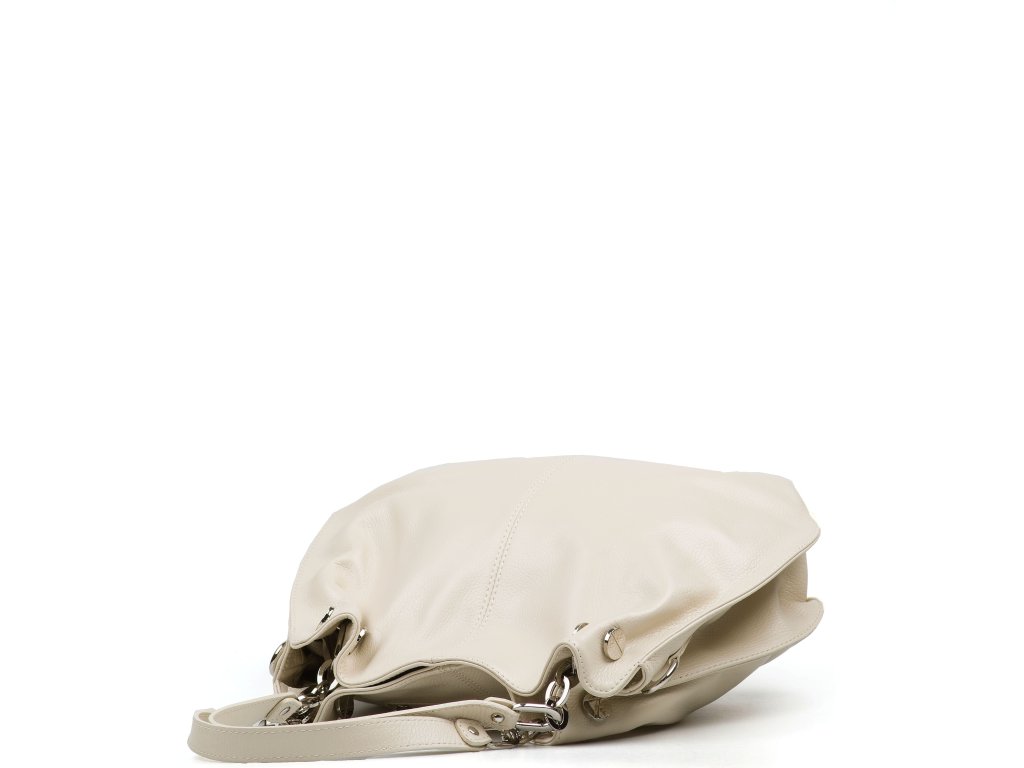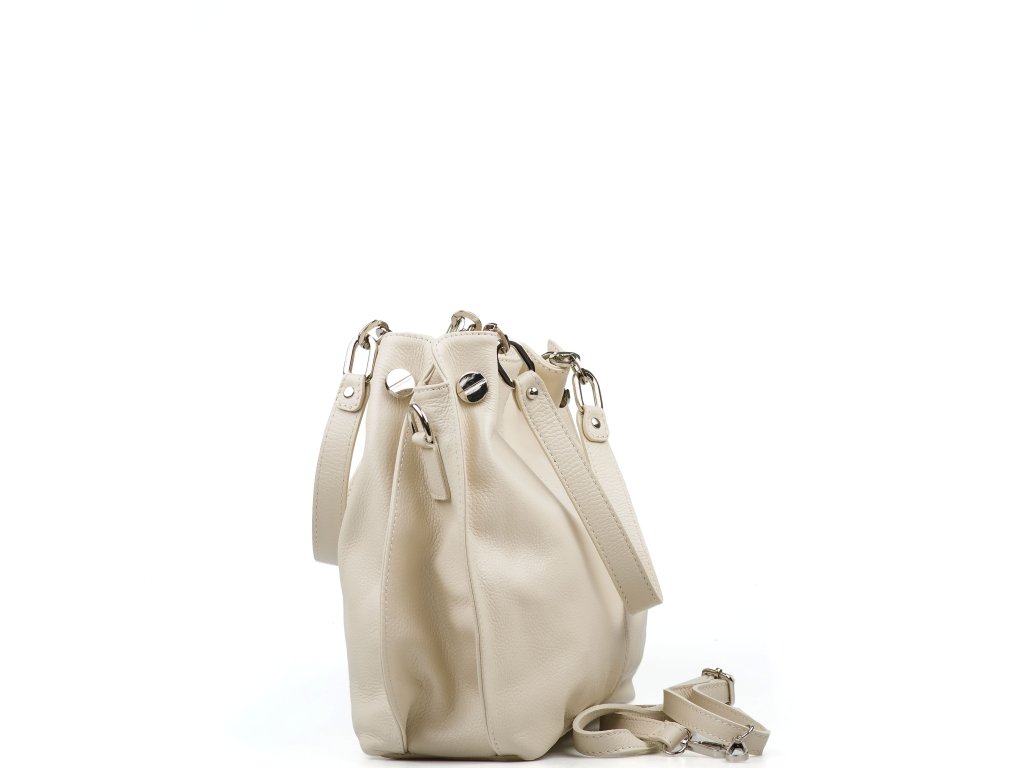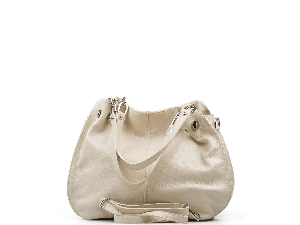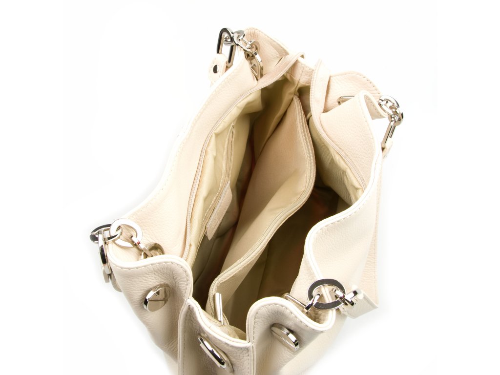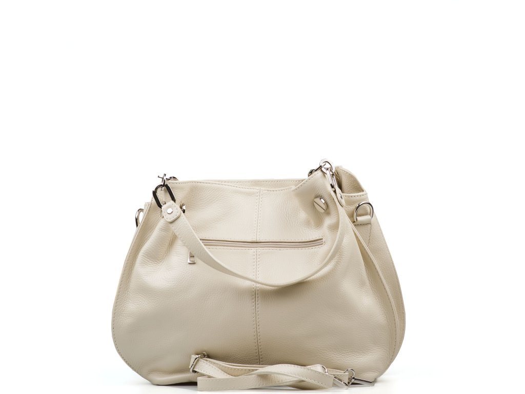 Kožená kabelka na voľný čas v béžovej farbe. Kabelka má k dispozícii dlhý popruh na nosenie cez telo. Interiér kabelky disponuje troma úložnými vreckami, ktoré prostredné uzatvárateľné zipsom. Kabelka sa uzatvára zipsom.