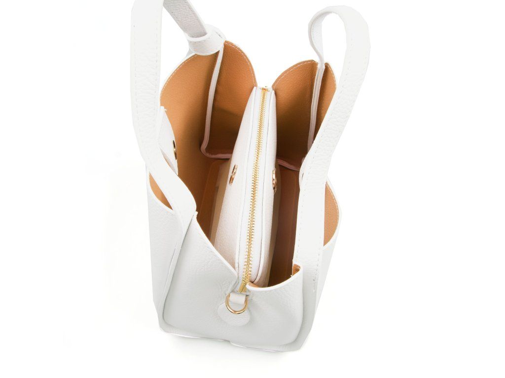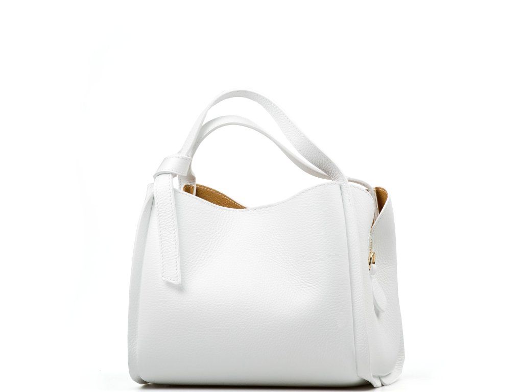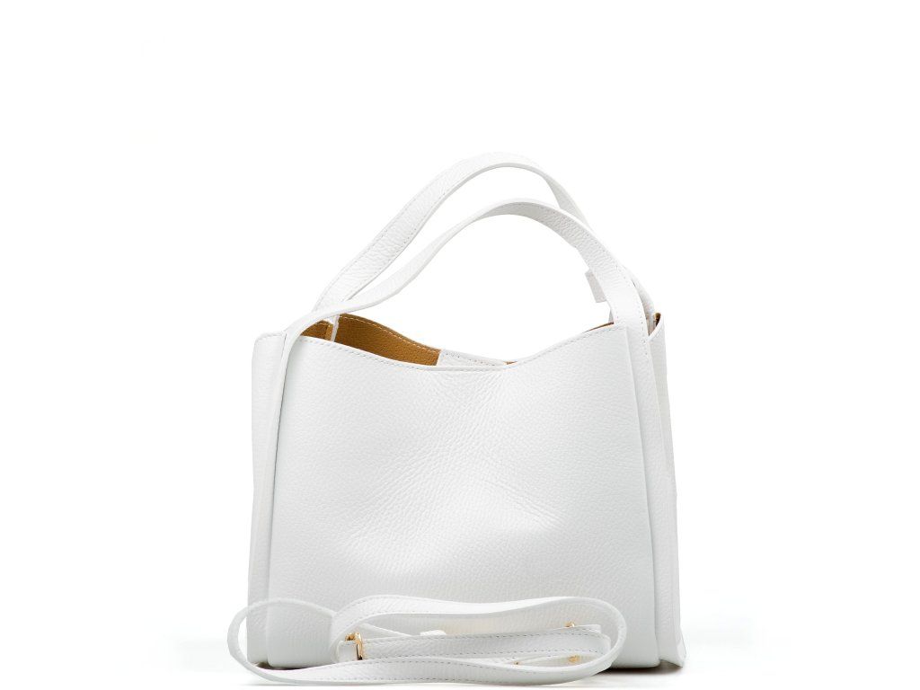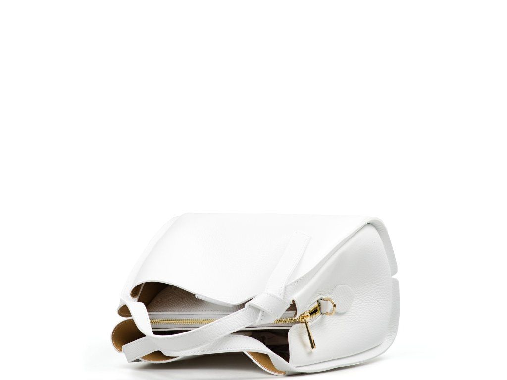 Minimalistická biela kožená kabelka so zlatým kovaním na elegantné každodenné nosenie. Vnútri ponúka tri hlavné priehradky, pričom prostredné je na zips - ideálne na cennosti. Nosiť ju môžete v ruke aj cez rameno vďaka nastaviteľnému prídavnému popruhu. Kabelka sa uzatvára chlopňou so zapínaním na kovanie.