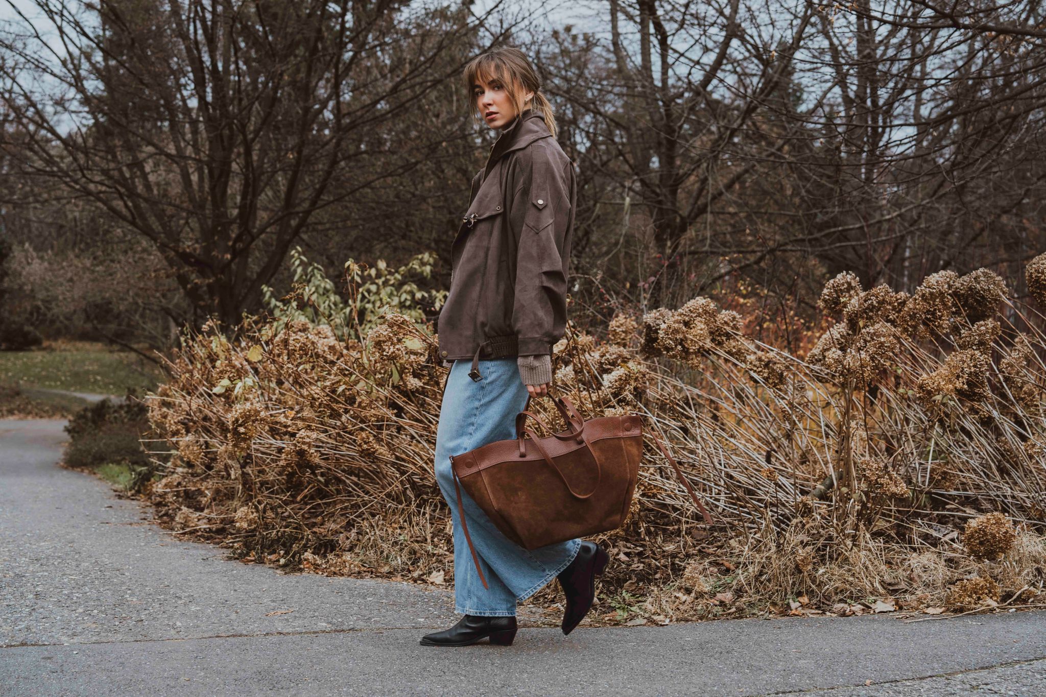 Kožená kabelka do ruky alebo cez rameno v tmavo hnedej farbe. Povrch kabelky má matnú semišovú úpravu, ktorá podčiarkuje jej sofistikovaný vzhľad. Kabelku je možné nosiť v dvoch tvarových variantách. Interiér disponuje jedným veľkým úložným vreckom a prídavným voľným vreckom. Kabelka sa uzatvára cvokom.