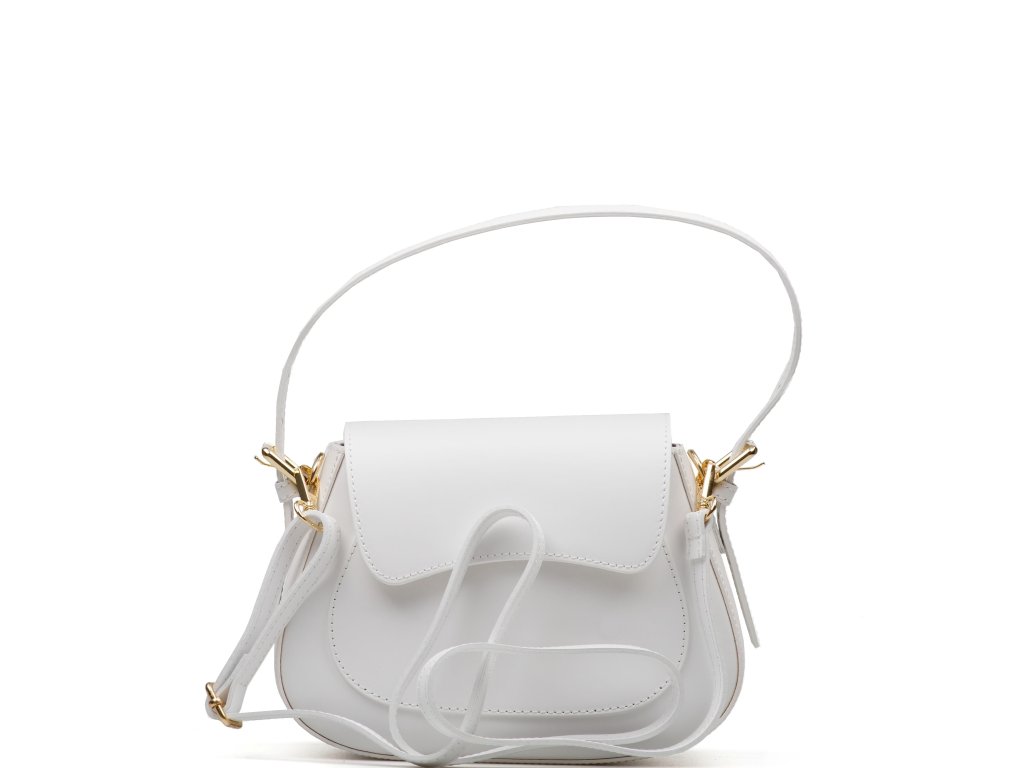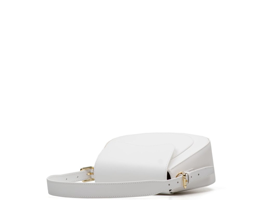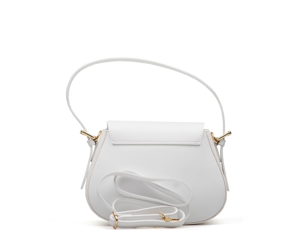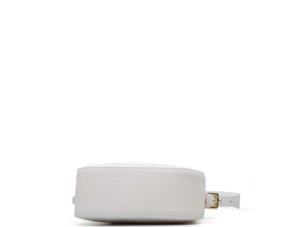 Elegantná kožená kabelka do ruky v bielej farbe. Kabelka je vyrobená z hladkej kože a má špecifický tvar. Interiér kabelky disponuje jedným hlavným vreckom a jedným zadným malým. Kabelka ich uzatvára zipsom a ozdobnou chlopňou. Súčasťou kabelky je prídavný popruh s karabínami, na použitie kabelky ako crossbody.