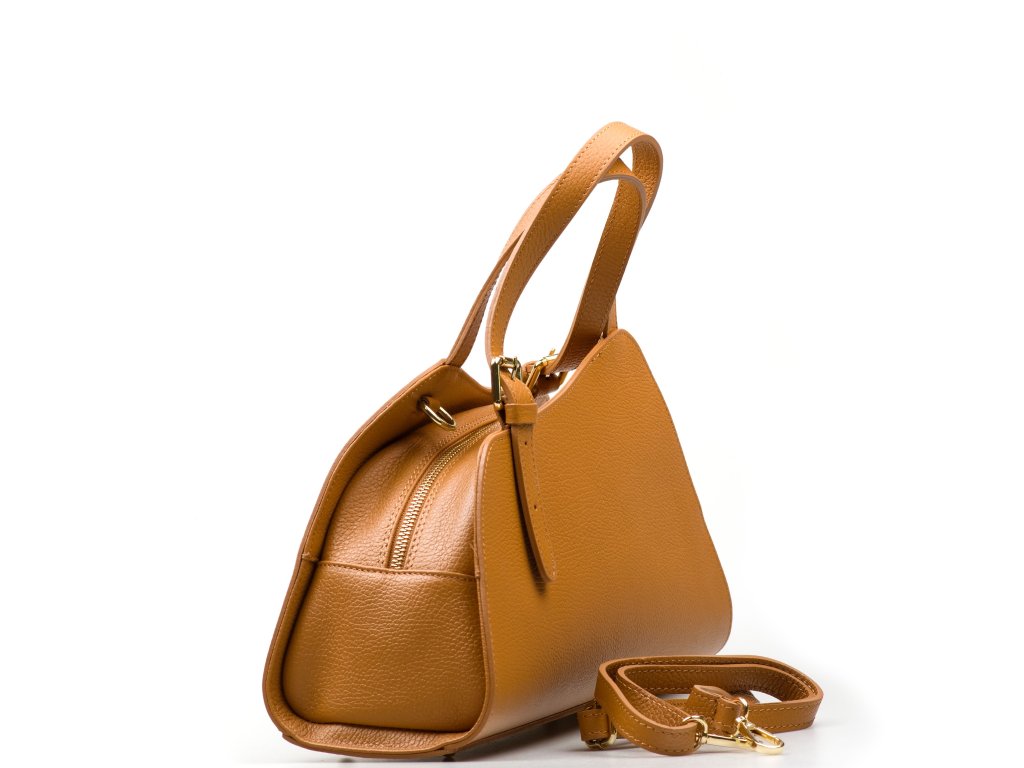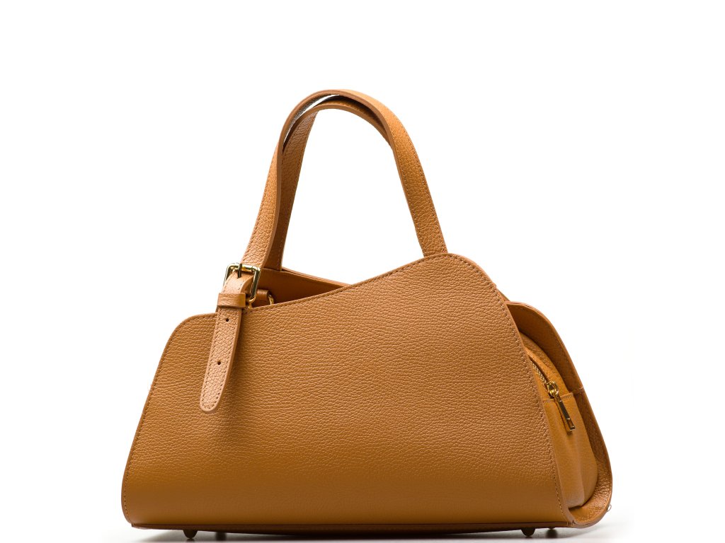 Minimalistická kožená kabelka do ruky v koňakovo hnedej farbe. Kabelka je ojedinelá pre svoj asymetrický. Interiér kabelky disponuje jedným hlavným vreckom a jedným zadným malým. Kabelka ich uzatvára zipsom. Súčasťou kabelky je prídavný popruh s karabínami, na použitie kabelky ako crossbody.