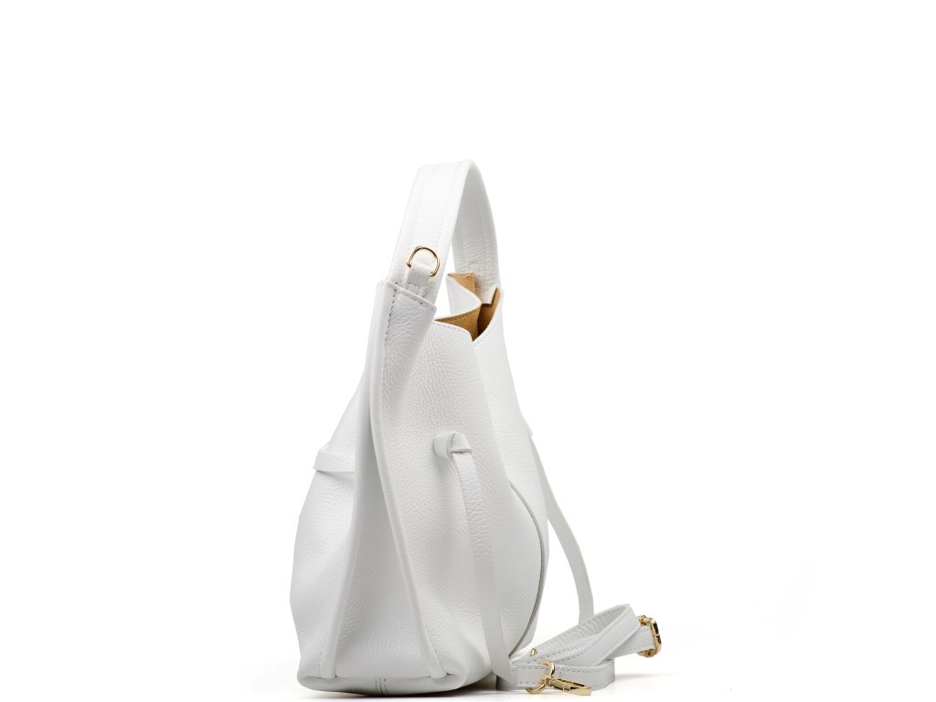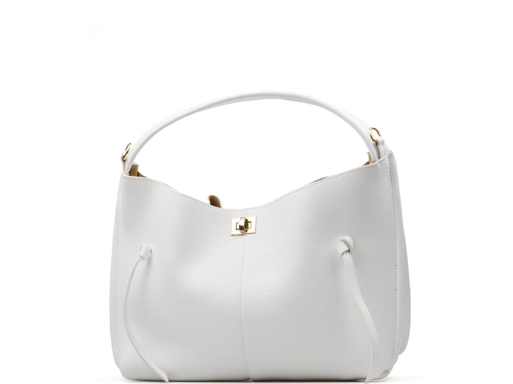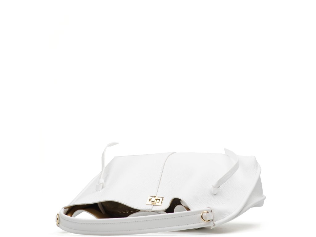 Minimalistická kožená kabelka v bielej farbe, ktorú môžete nosiť v ruke, cez rameno aj ako crossbody vďaka prídavnému popruhu. Vnútri nájdete jedno veľké úložné vrecko a ďalšie voľné vrecko na drobnosti, ktoré chcete mať hneď po ruke. Kabelka sa uzatvára zlatým kovaním, ktoré jej dodáva jemný, sofistikovaný šmrnc. Prednú stranu zdobí kožený opasok, ktorý podčiarkuje čistý, minimalistický dizajn.