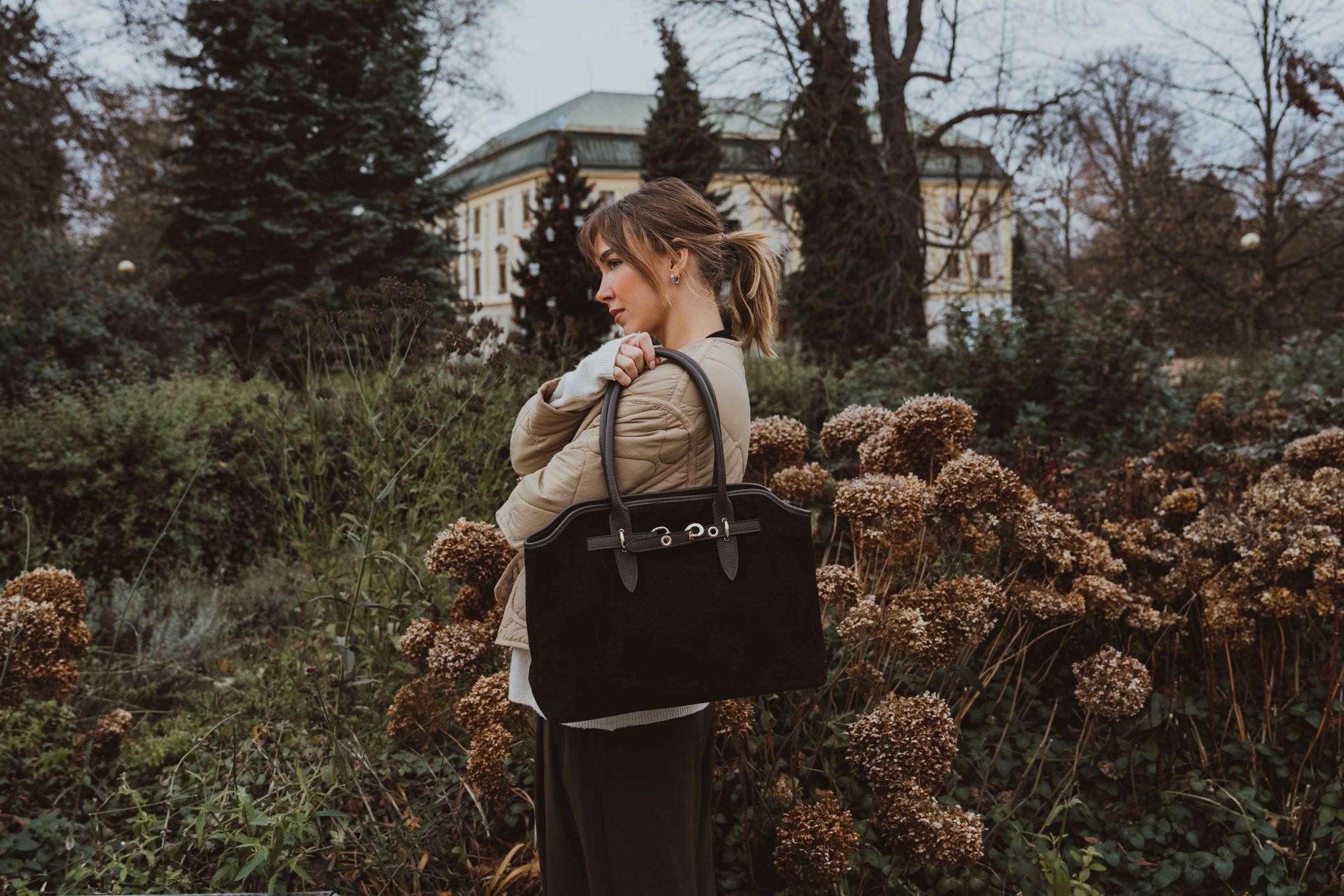 Elegantná semišová kožená kabelka v bordovej farbe je stelesnením nadčasového štýlu a sofistikovanosti. Jej matný semišový povrch dopĺňa jemné kožené zdobenie a zlaté kovanie, ktoré podčiarkuje jej luxusný vzhľad. Kabelku je možné nosiť v ruke alebo cez rameno. Interiér ponúka jedno priestranné hlavné vrecko a malé vrecká po bokoch pre lepšie usporiadanie vecí. Uzatvára sa zipsom.