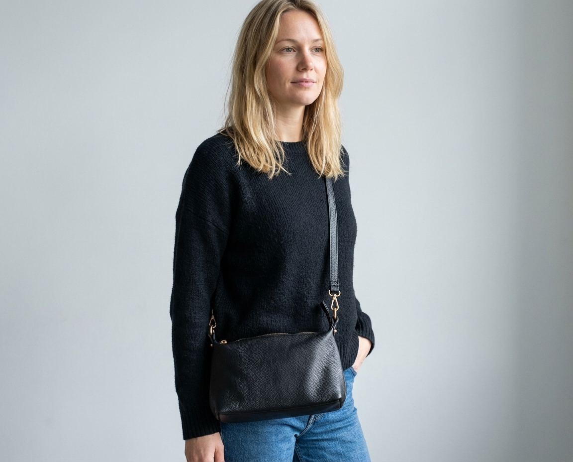 Elegantná čierna kožená kabelka, ktorá sa ľahko zladí s každým outfitom. Vnútri nájdete jednu hlavnú priehradku a menšie bočné vrecko na zips – ideálne na kľúče, telefón alebo drobnosti, ktoré chcete mať hneď po ruke. Kabelka sa zapína na zips, takže vaše veci budú bezpečne uložené. Súčasťou sú dva prídavné popruhy: kratšie na nosenie v ruke alebo cez rameno a druhý, nastaviteľný, na pohodlné nosenie cez telo.