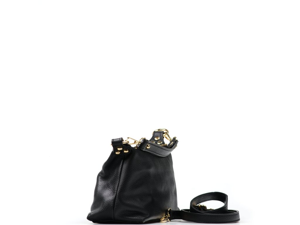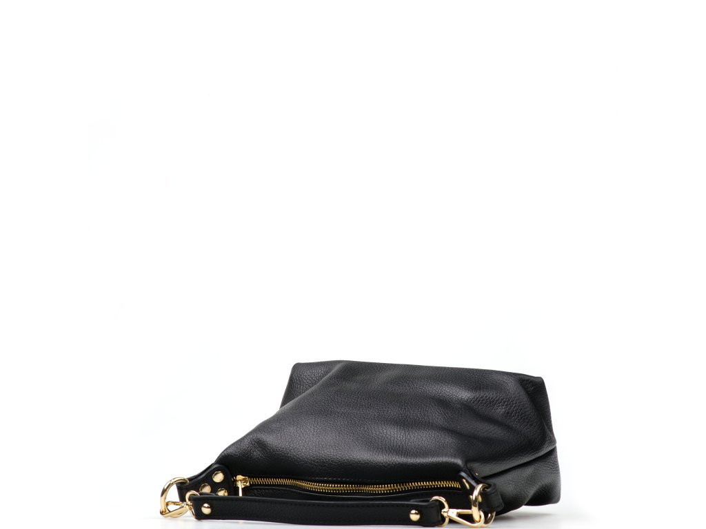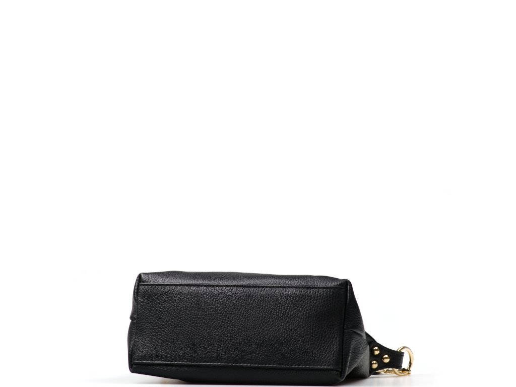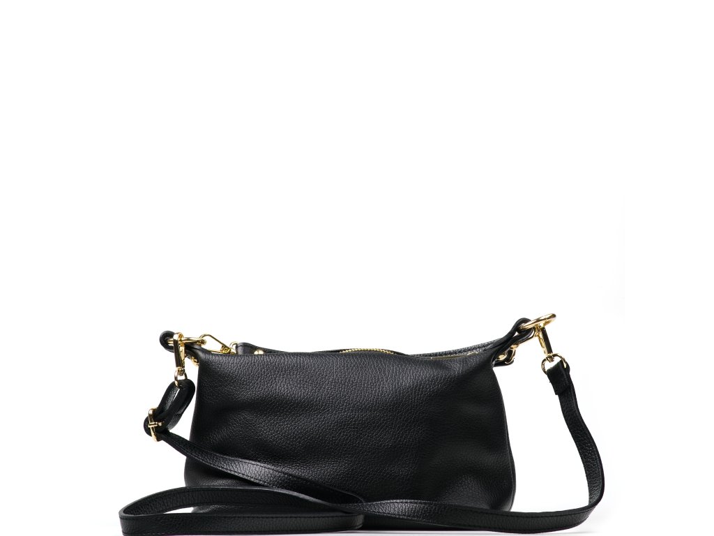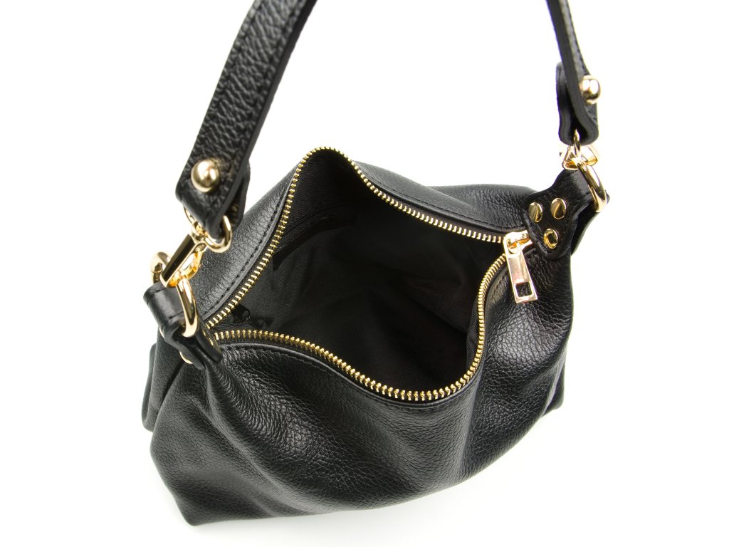 Elegantná čierna kožená kabelka, ktorá sa ľahko zladí s každým outfitom. Vnútri nájdete jednu hlavnú priehradku a menšie bočné vrecko na zips – ideálne na kľúče, telefón alebo drobnosti, ktoré chcete mať hneď po ruke. Kabelka sa zapína na zips, takže vaše veci budú bezpečne uložené. Súčasťou sú dva prídavné popruhy: kratšie na nosenie v ruke alebo cez rameno a druhý, nastaviteľný, na pohodlné nosenie cez telo.