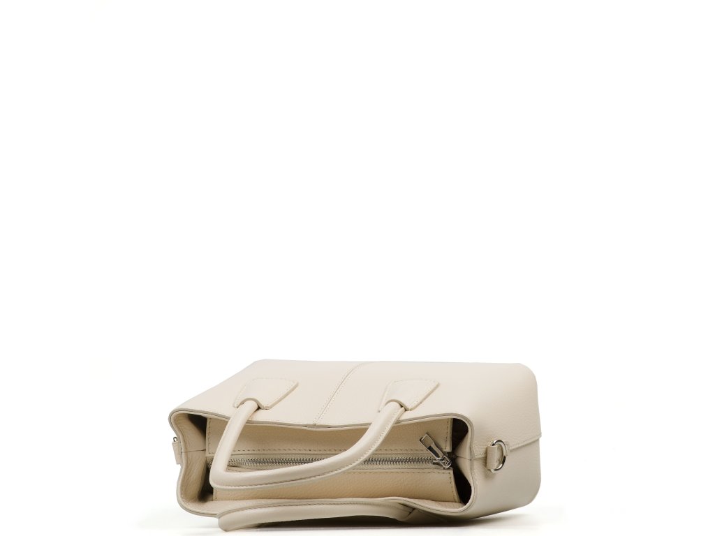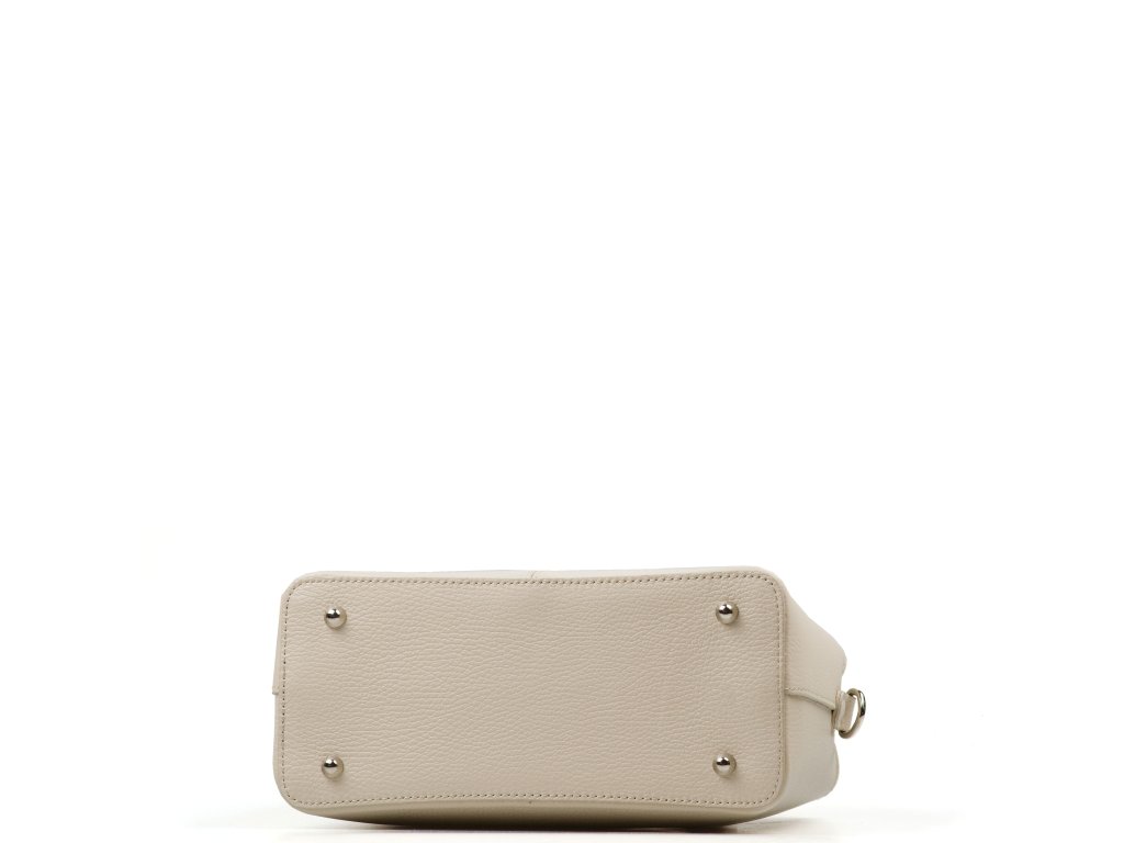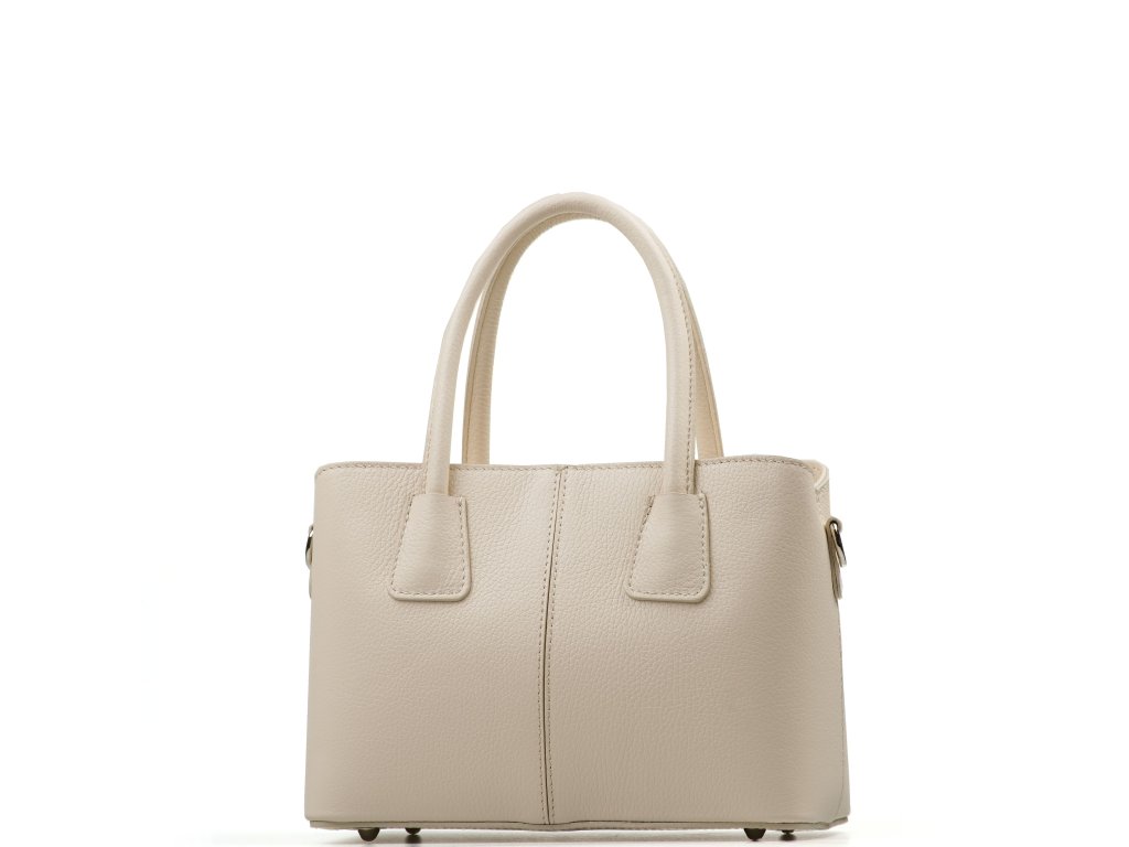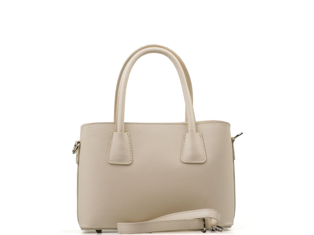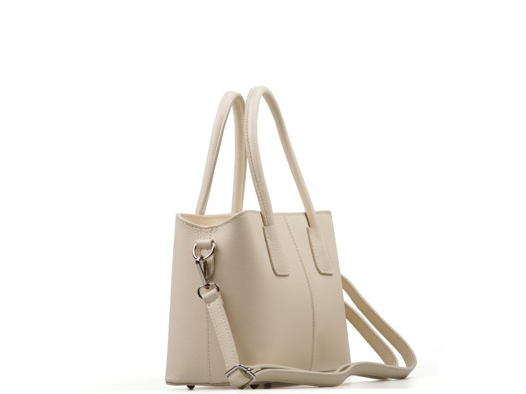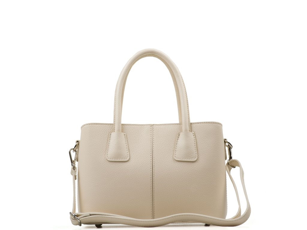 Kožená kabelka do ruky aj cez rameno v béžovej farbe. Interiér kabelky disponuje tromi úložnými vreckami, pričom jedno je uzatvárateľné na zips a dvoma malými bočnými. Súčasťou kabelky je prídavný popruh s karabínami s nastaviteľnou dĺžkou. Kabelka sa uzatvára zipsom.