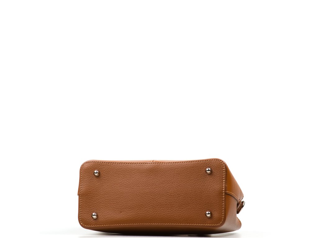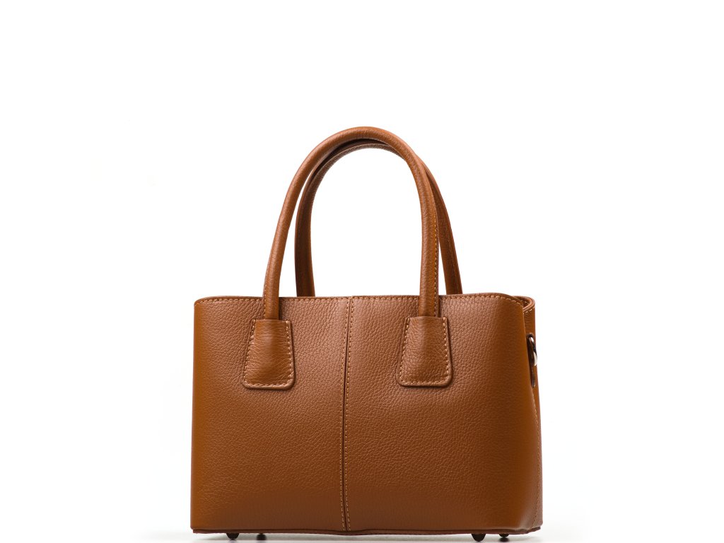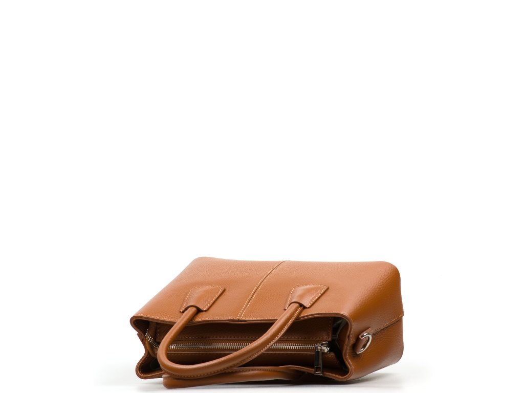 Kožená kabelka do ruky aj cez rameno v koňakovo hnedej farbe. Interiér kabelky disponuje tromi úložnými vreckami, pričom jedno je uzatvárateľné na zips a dvoma malými bočnými. Súčasťou kabelky je prídavný popruh s karabínami s nastaviteľnou dĺžkou. Kabelka sa uzatvára zipsom.