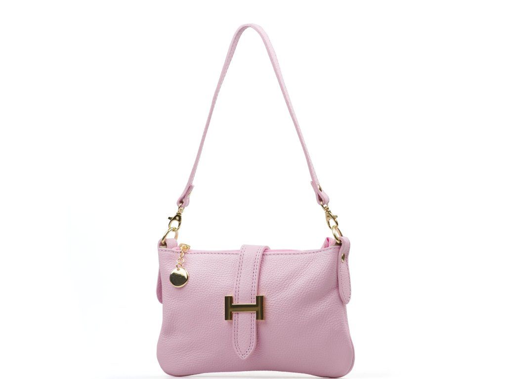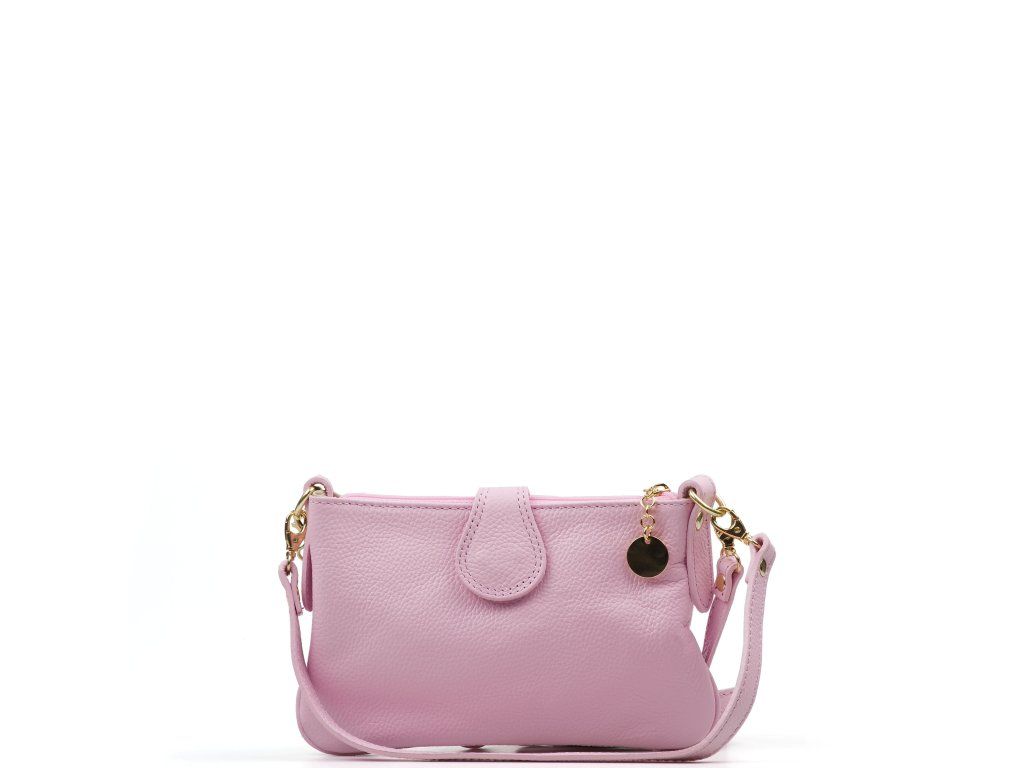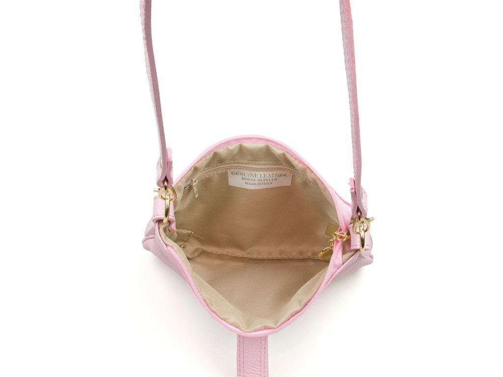 Dámska kožená kabelka na voľný čas v ružovej farbe. Súčasťou kabelky sú dva prídavné popruhy, jeden krátky na nosenie do ruky či cez rameno a jeden dlhý na crossbody nosenia. Interiér disponuje jedným hlavným úložným vreckom a jedným malým bočným vreckom na zips. Kabelka sa uzatvára zipsom a chlopňou.