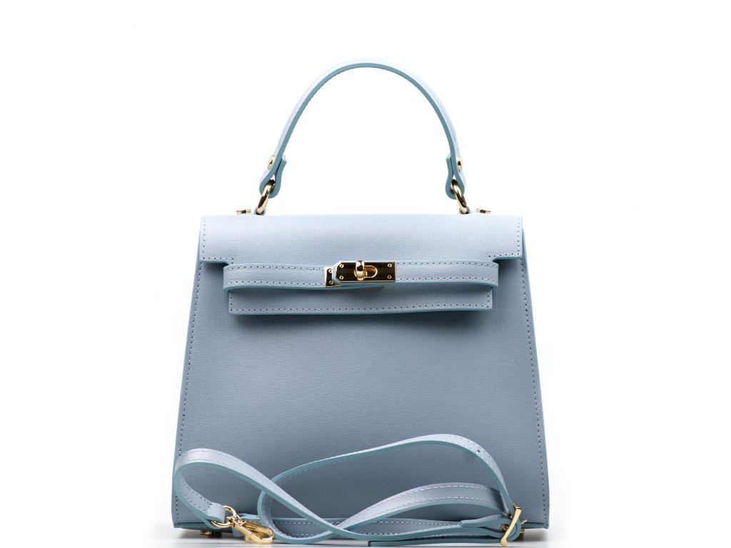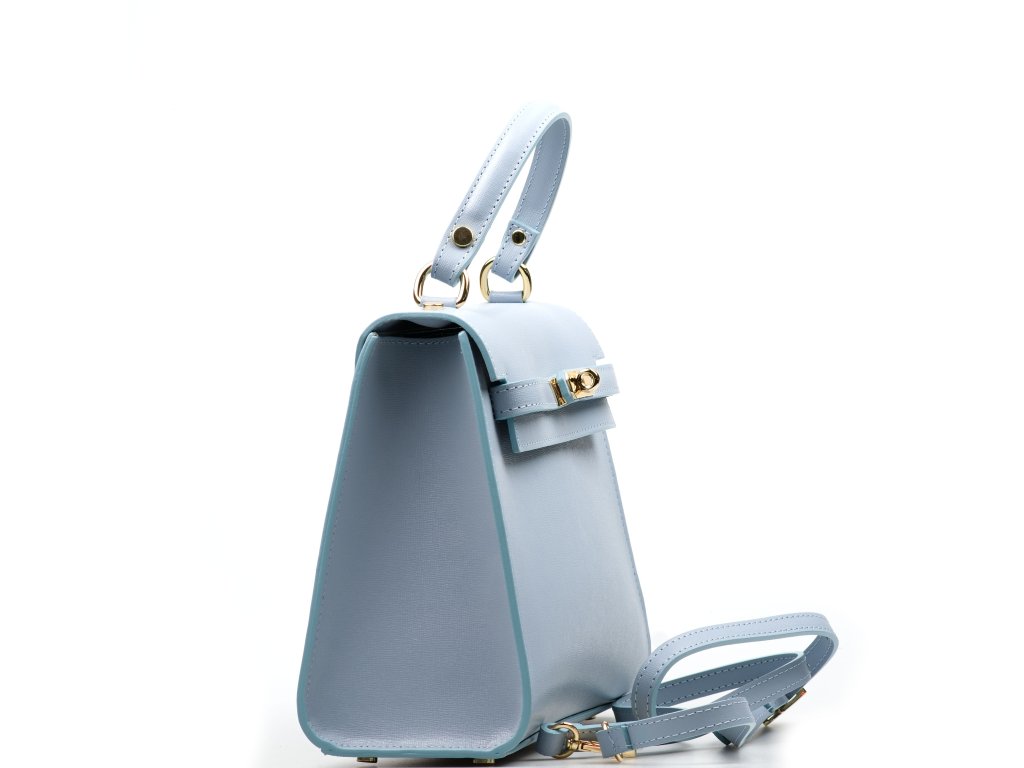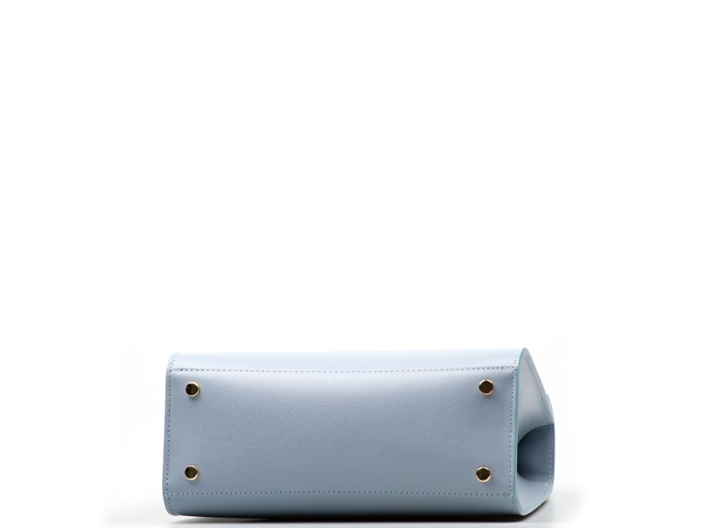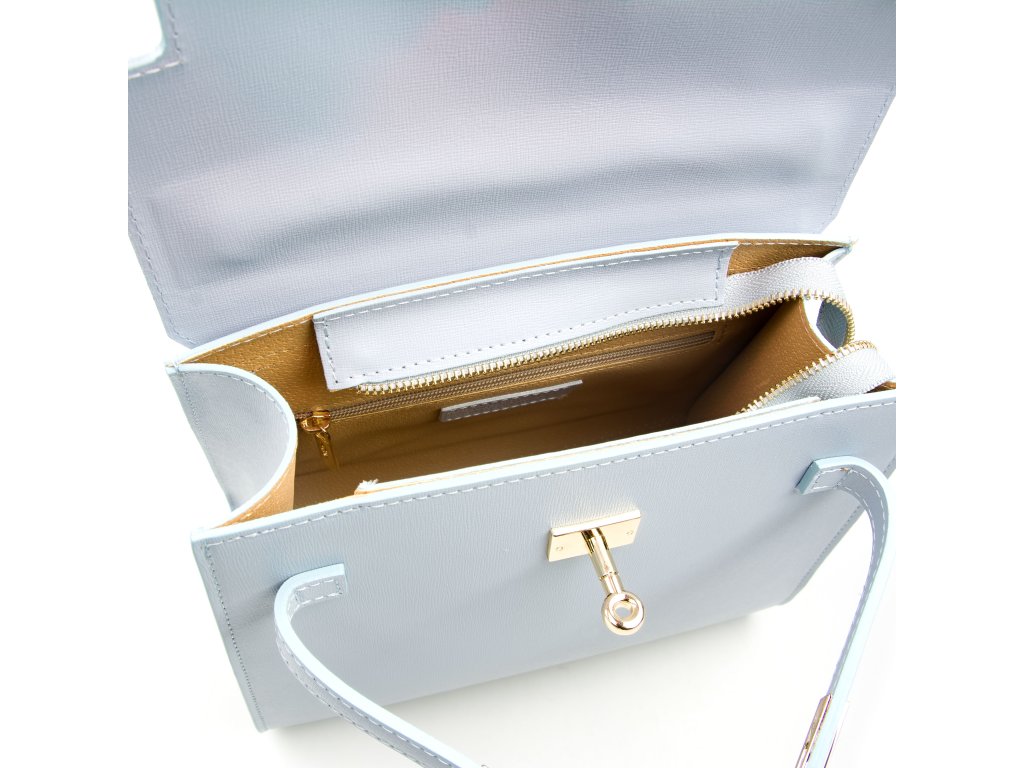 Minimalistická kožená kabelka vo svetlo modrej farbe. Interiér kabelky disponuje jedným hlavným vreckom a jedným malým zadným, ktoré je uzatvárateľné zipsom. Kabelku môžete nosiť v ruke alebo cez rameno. Kabelku zdobí zlaté kovanie, ktorým sa kabelka zapína. Kabelka je uzatvárateľná zipsom a chlopňou.