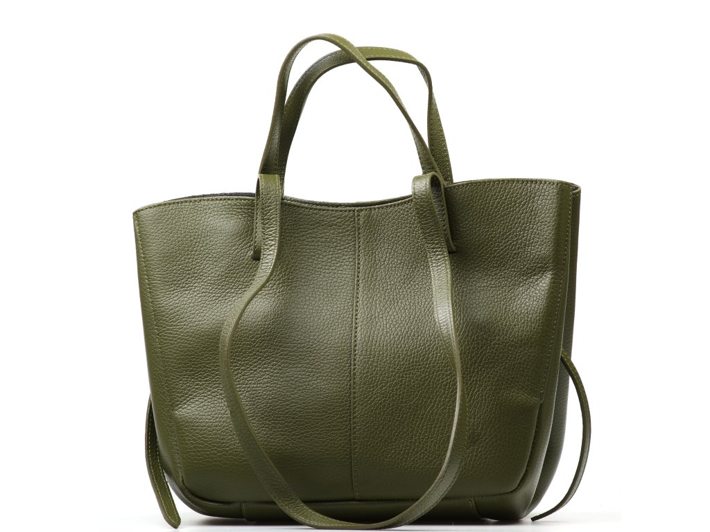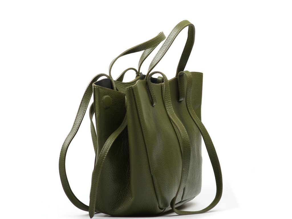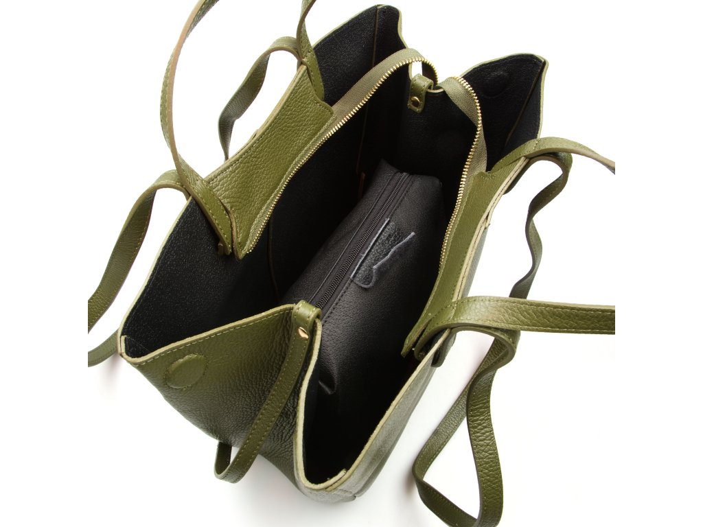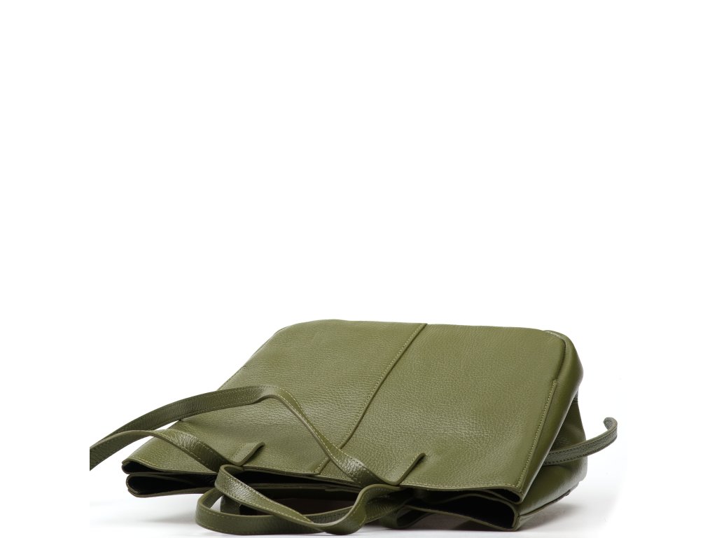 Minimalistická kožená kabelka do ruky alebo cez rameno v olivovo zelenej farbe. Kabelku je možné nosiť v dvoch tvarových variantách. Interiér disponuje jedným veľkým úložným vreckom a prídavným voľným vreckom. Kabelka sa uzatvára zipsom.