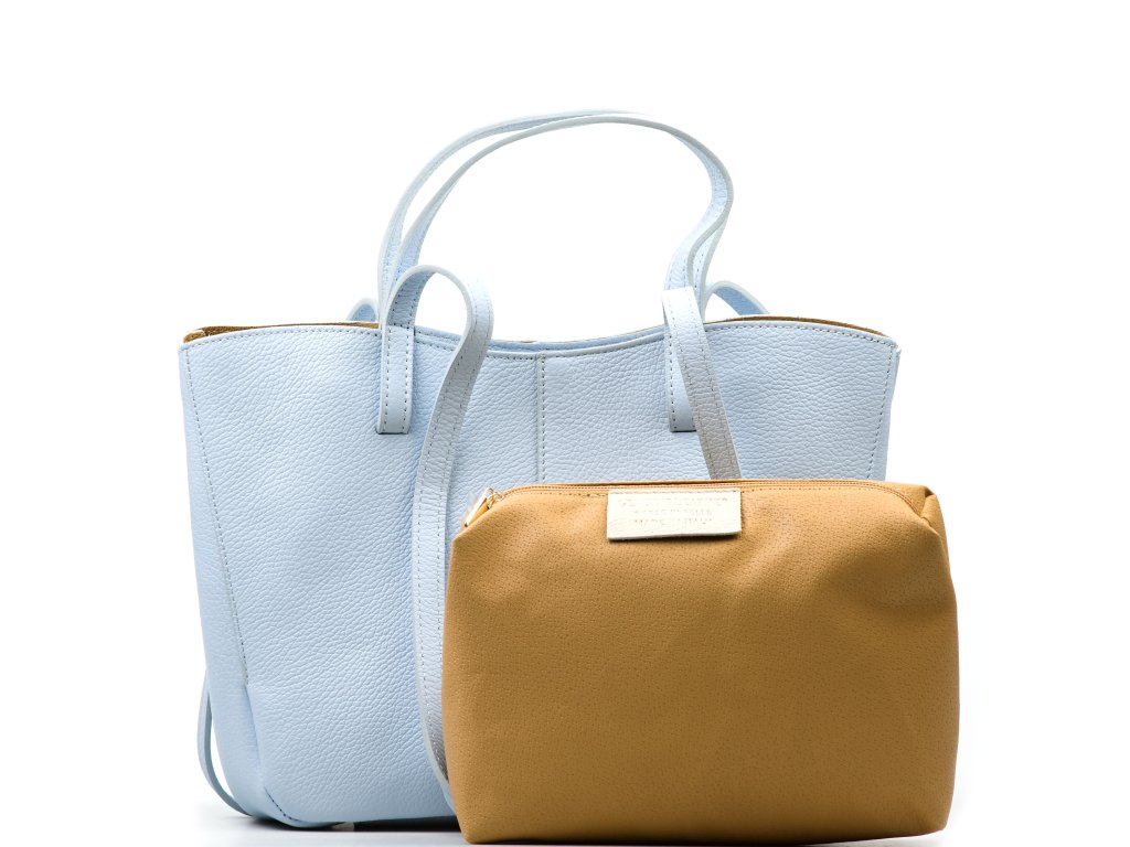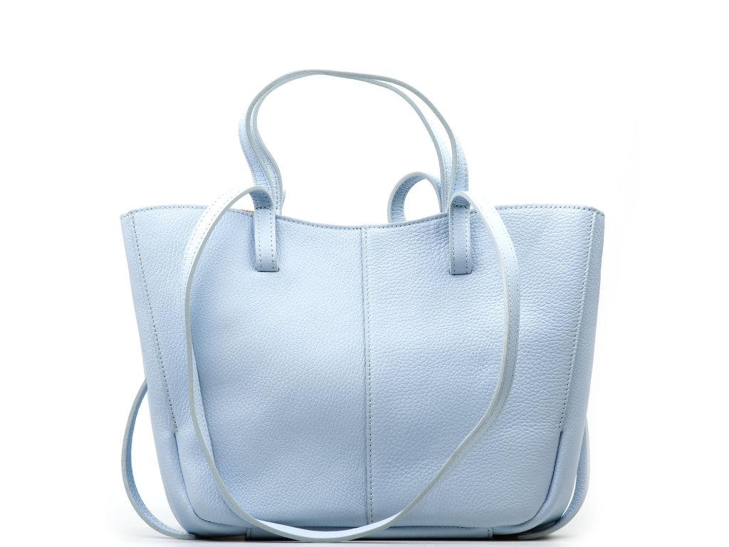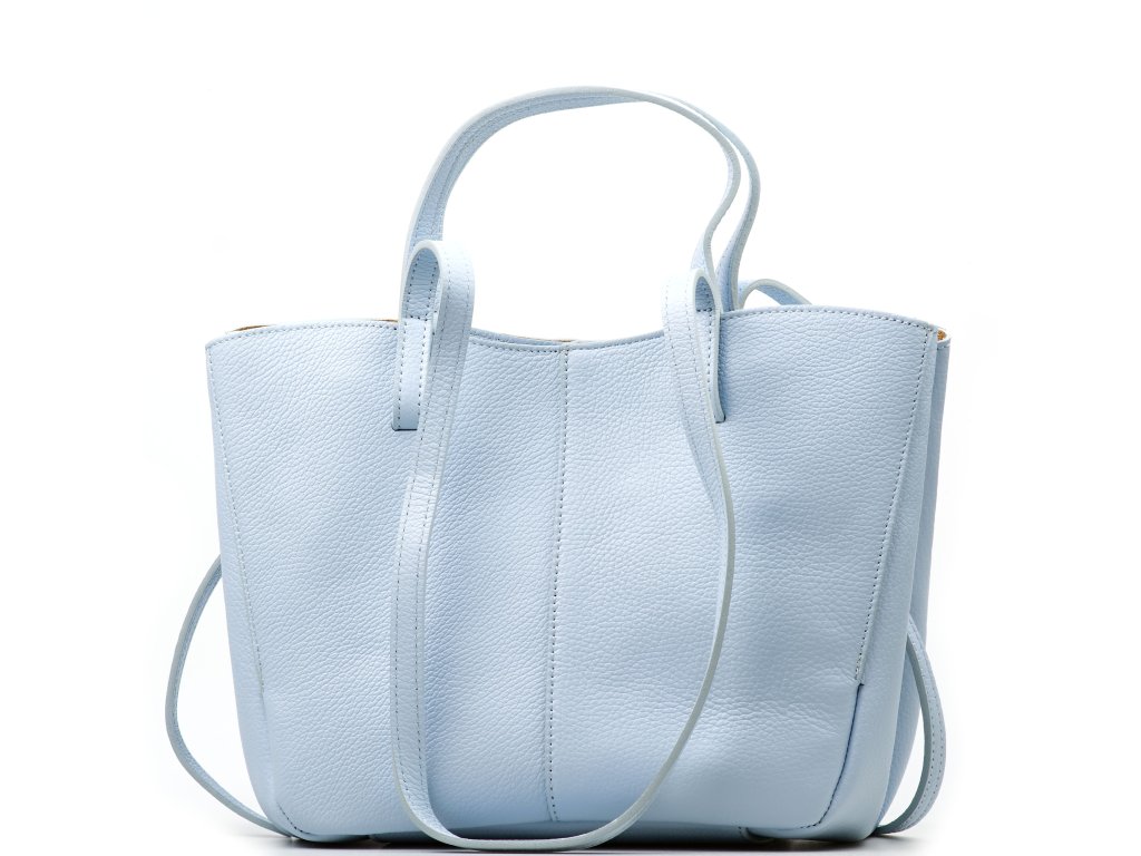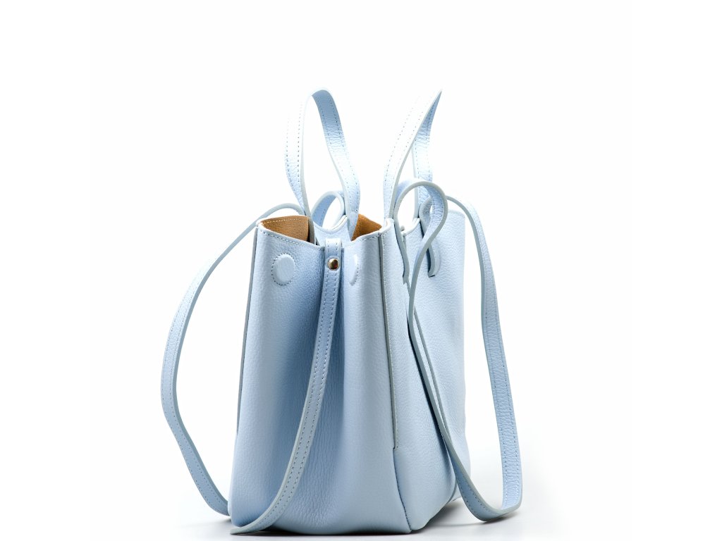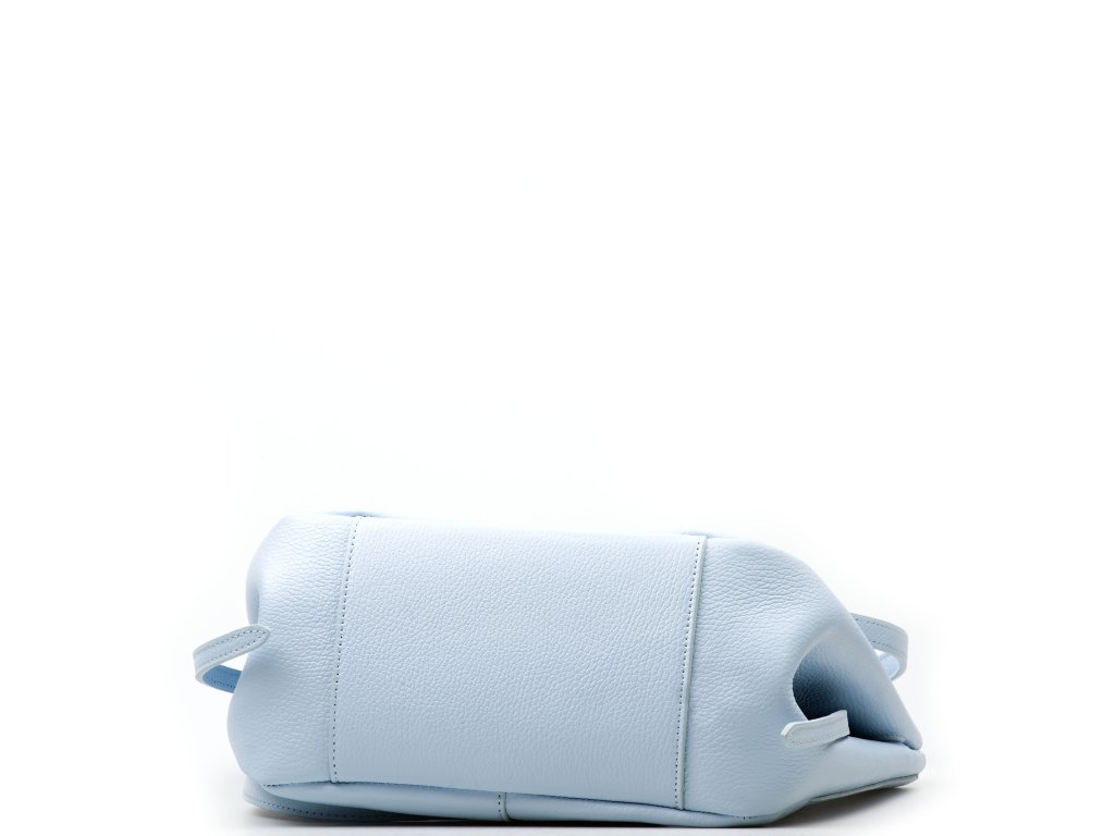 Minimalistická kožená kabelka do ruky alebo cez rameno vo svetlo modrej farbe. Kabelku je možné nosiť v dvoch tvarových variantách. Interiér disponuje jedným veľkým úložným vreckom a prídavným voľným vreckom. Kabelka sa uzatvára zipsom.
