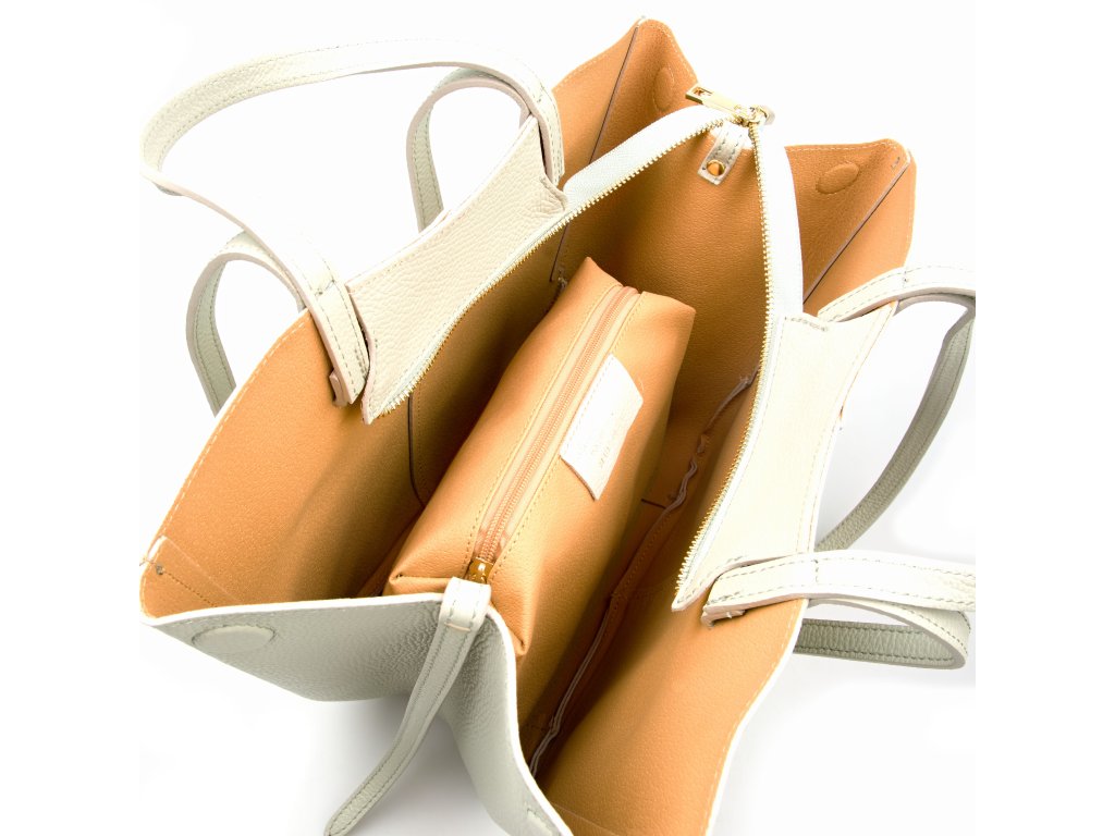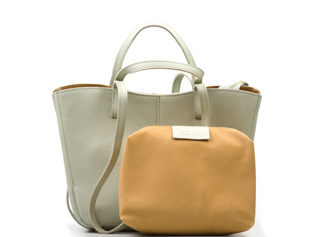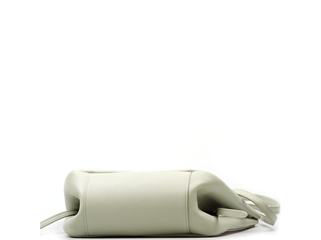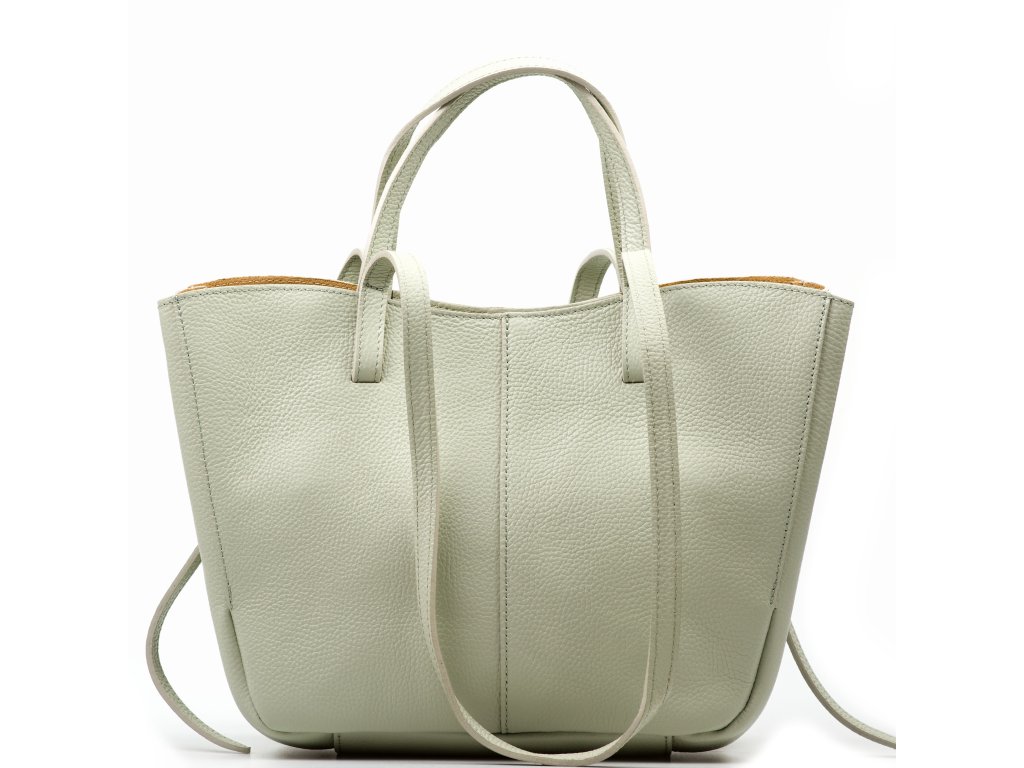 Minimalistická kožená kabelka do ruky alebo cez rameno vo svetlo zelenej farbe. Kabelku je možné nosiť v dvoch tvarových variantách. Interiér disponuje jedným veľkým úložným vreckom a prídavným voľným vreckom. Kabelka sa uzatvára zipsom.