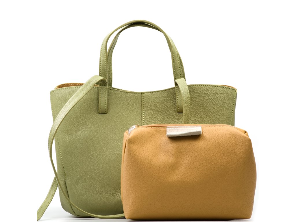 Minimalistická kožená kabelka do ruky alebo cez rameno v zelenej farbe. Kabelku je možné nosiť v dvoch tvarových variantách. Interiér disponuje jedným veľkým úložným vreckom a prídavným voľným vreckom. Kabelka sa uzatvára zipsom.