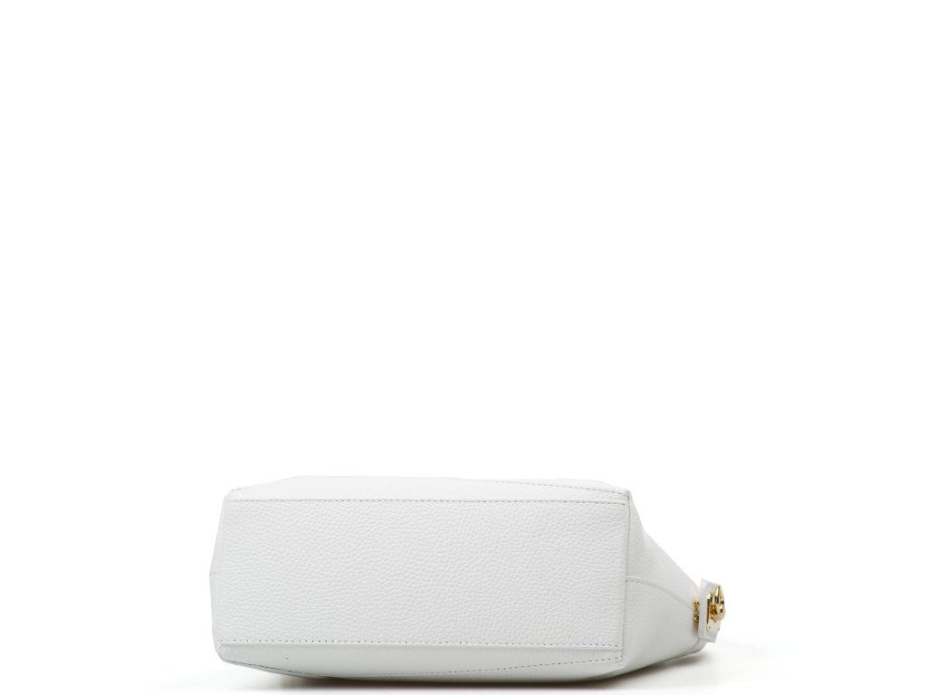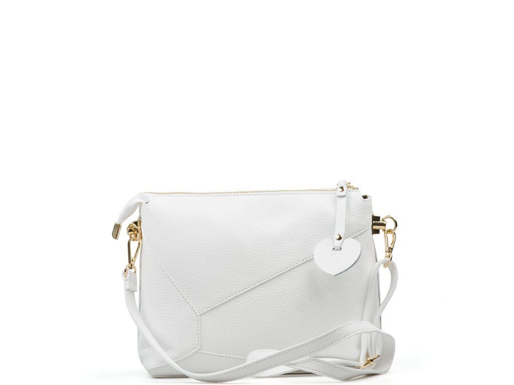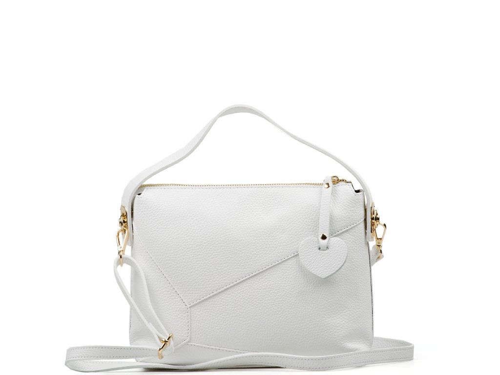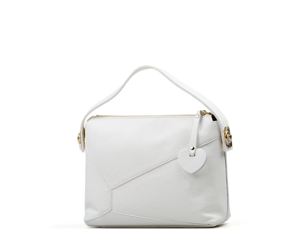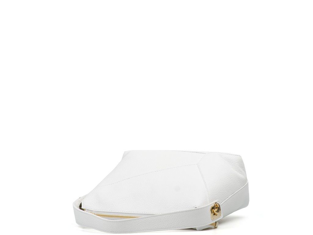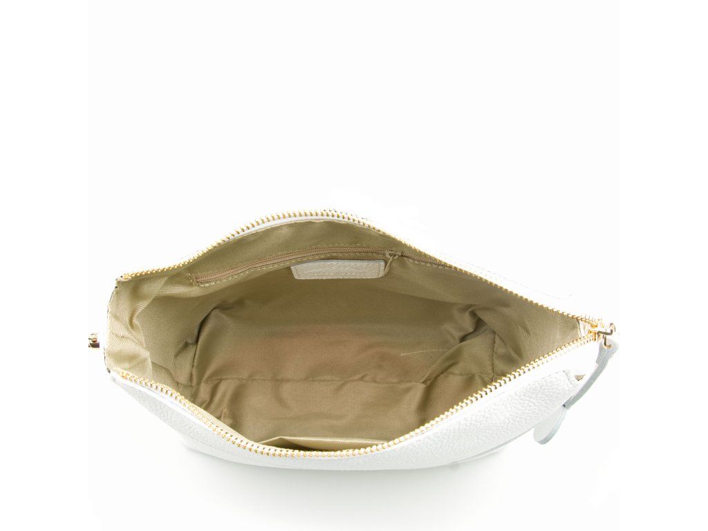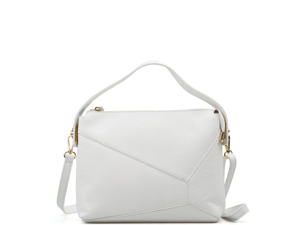 Elegantná kožená kabelka v bielej farbe. Interiér kabelky disponuje jedným hlavným vreckom a jedným malým bočným, ktoré je uzatvárateľné zipsom. Kabelka má pevný popruh, ktorý je možné nastaviť na nosenie v ruke, cez rameno či ako crossbody. Kabelka je uzatvárateľná zipsom.