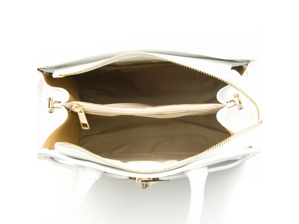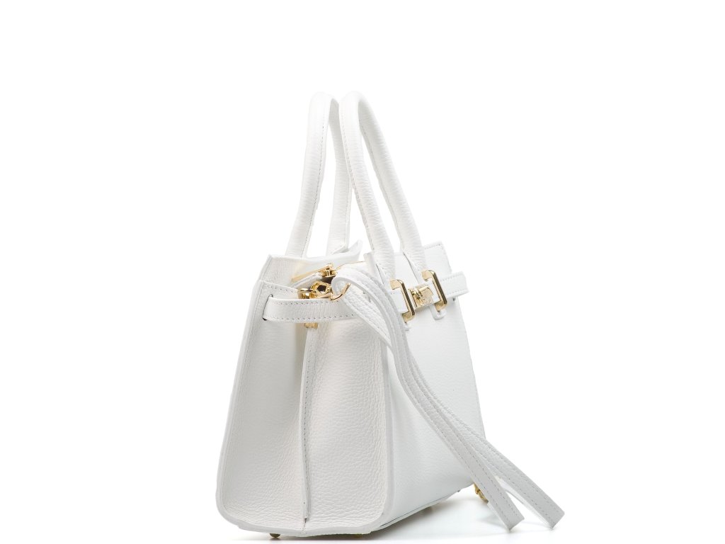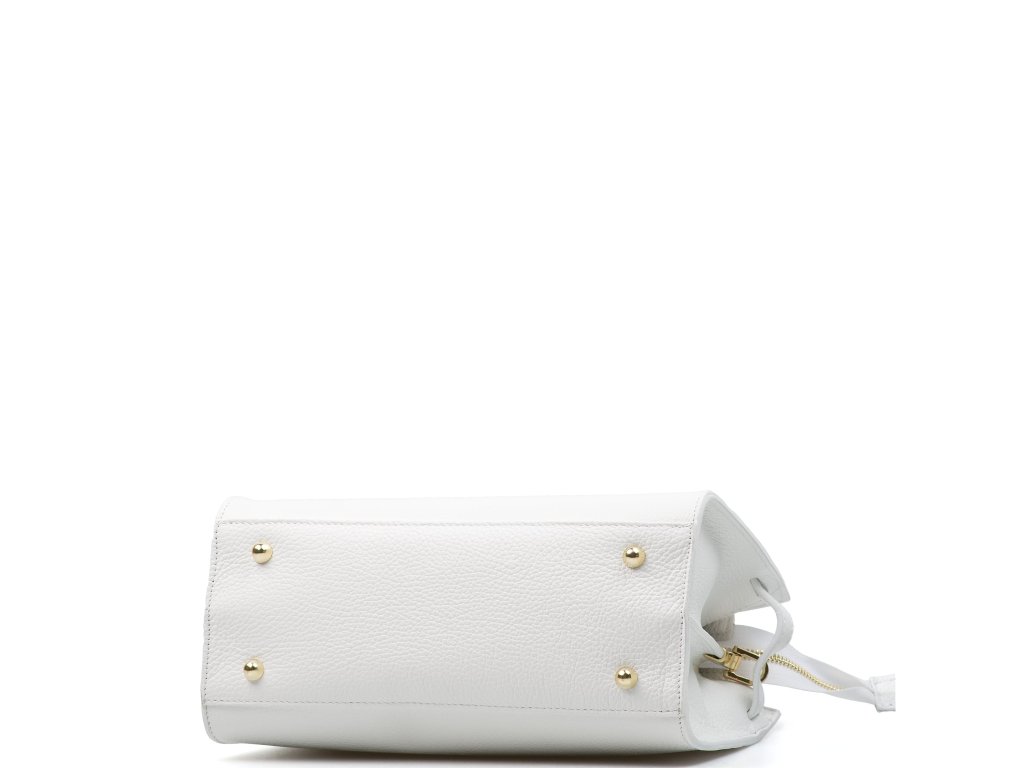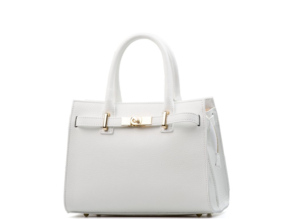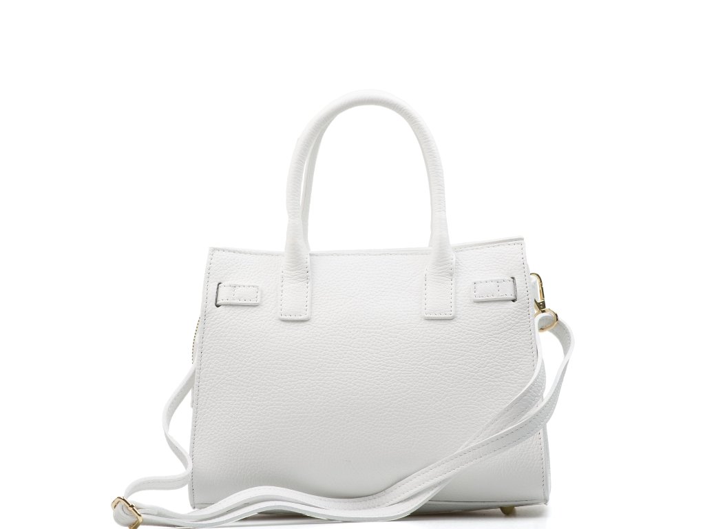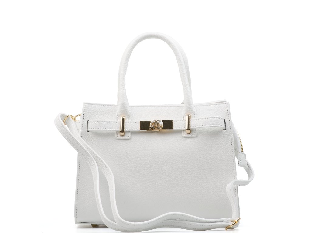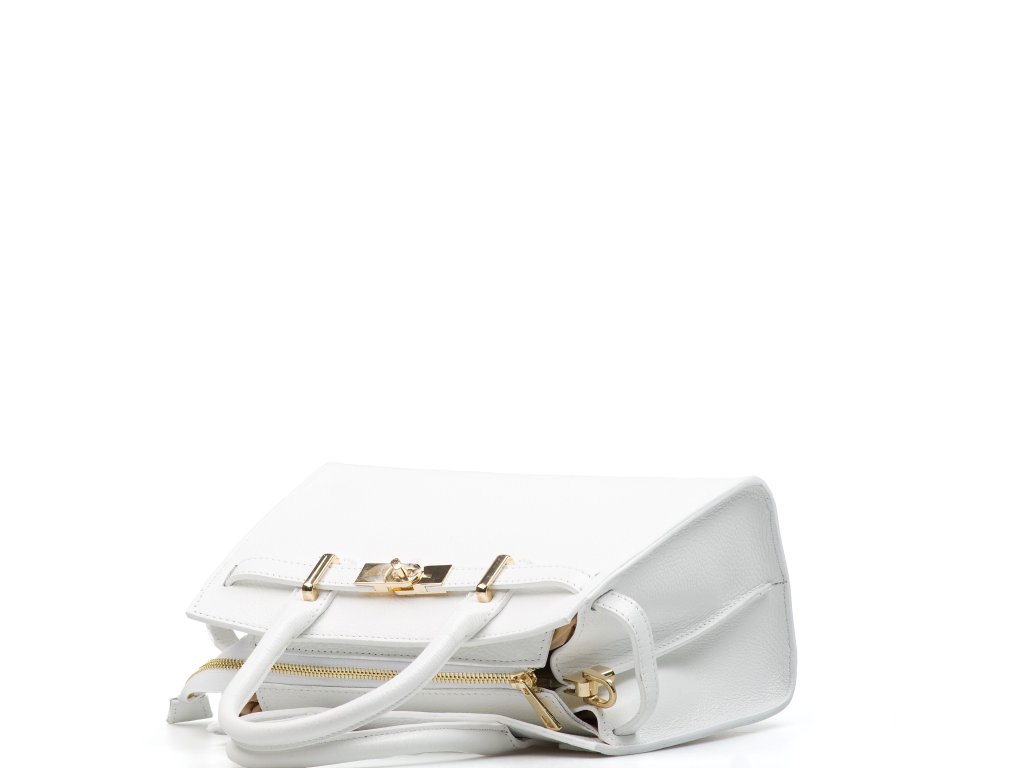 Kožená kabelka do ruky aj cez rameno v bielej farbe. Interiér kabelky disponuje tromi úložnými vreckami, pričom jedno je uzatvárateľné na zips a dvoma malými bočnými. Súčasťou kabelky je prídavný popruh s karabínami s nastaviteľnou dĺžkou. Hornú časť kabelky zdobí kožený popruh so zlatými sponami.