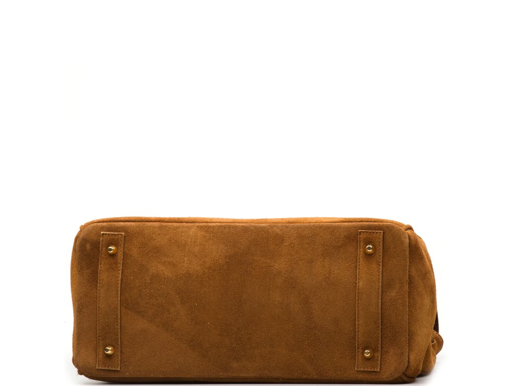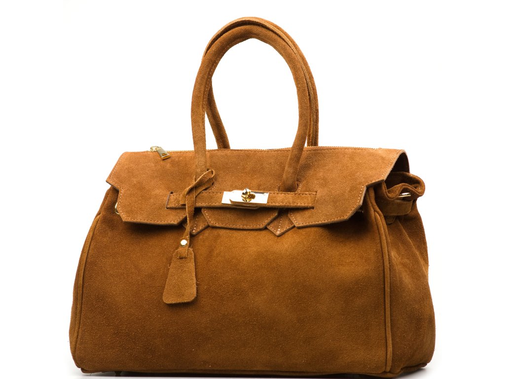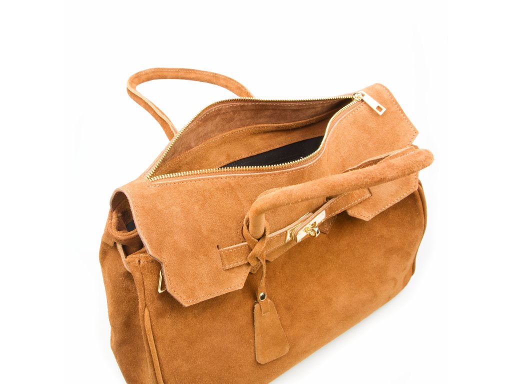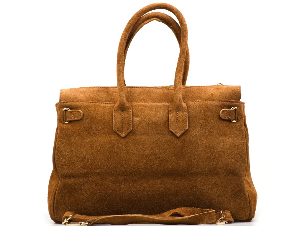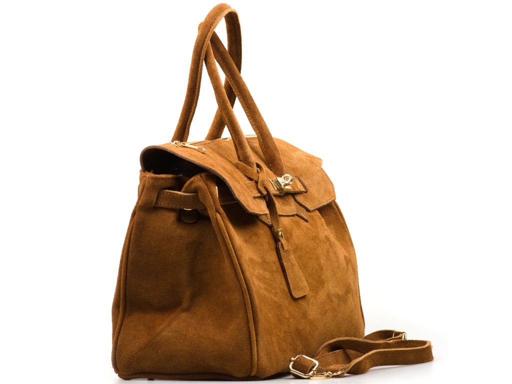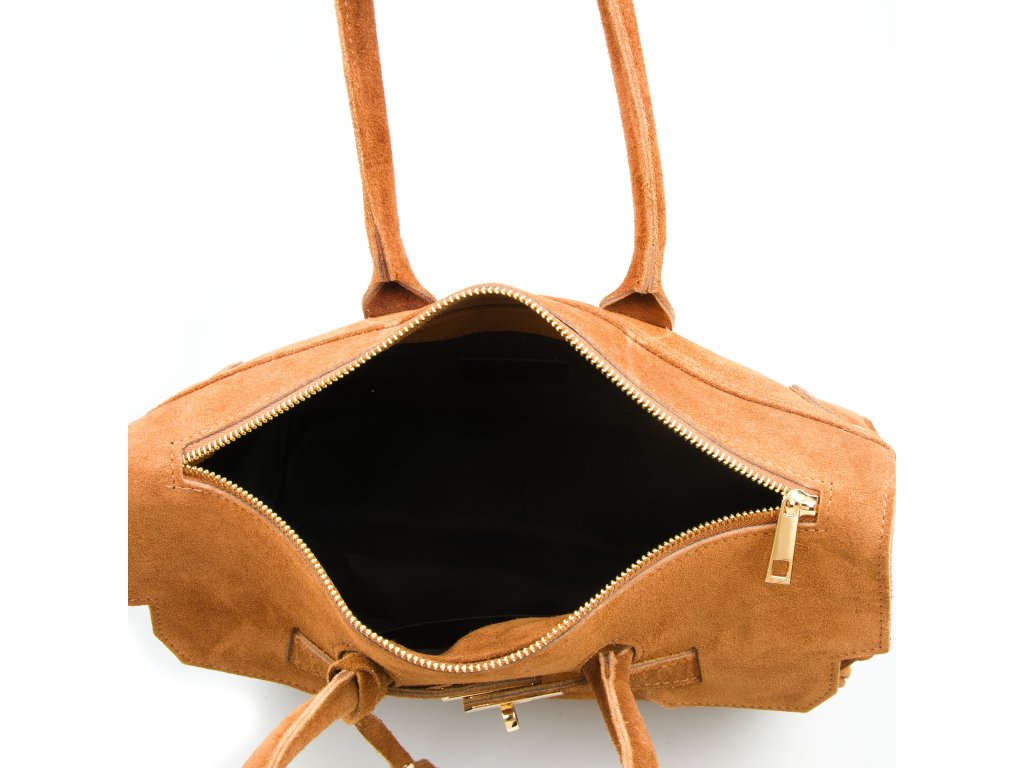 Semišová kožená kabelka do ruky aj cez rameno v koňakovo hnedej farbe. Interiér kabelky disponuje jedným hlavným úložným vreckom a jedným malým bočným. Hornú časť kabelky zdobí kožený popruh so zlatými sponami. Súčasťou kabelky je prídavný popruh na nosenie cez telo. Kabelka sa uzatvára pomocou zipsu alebo chlopne.