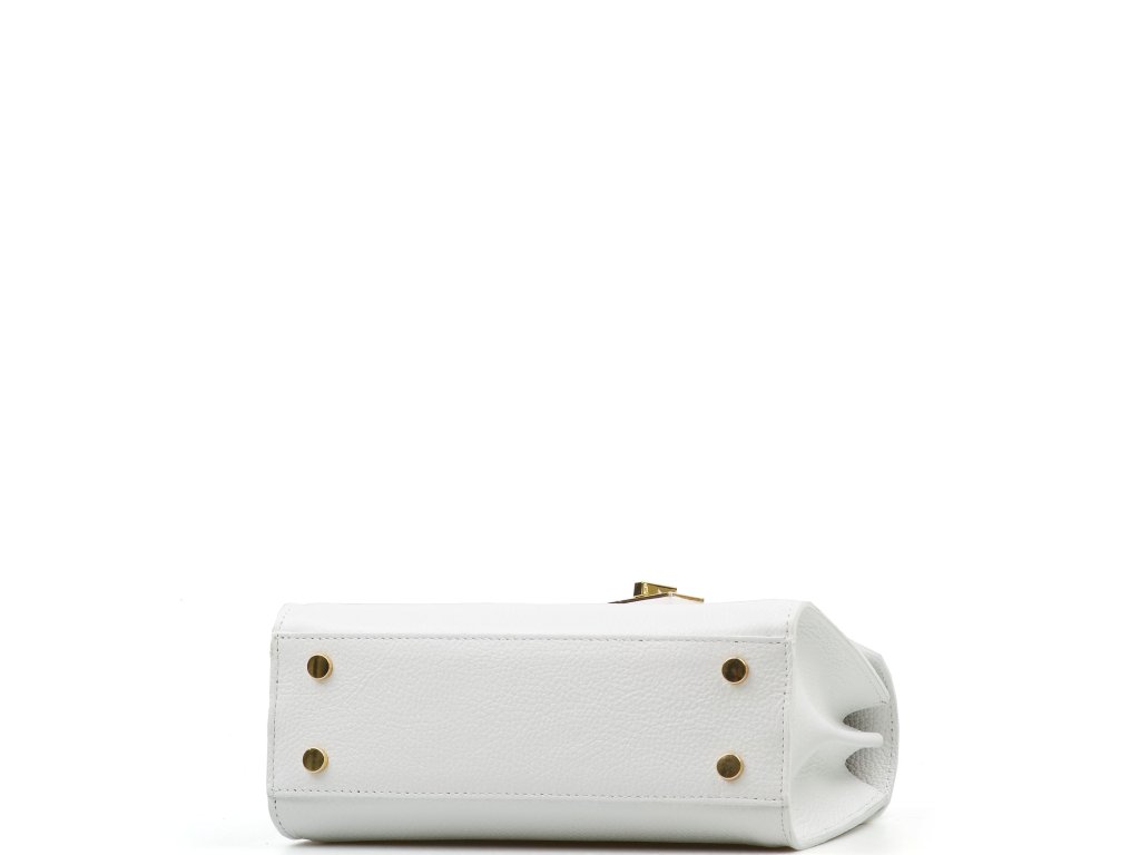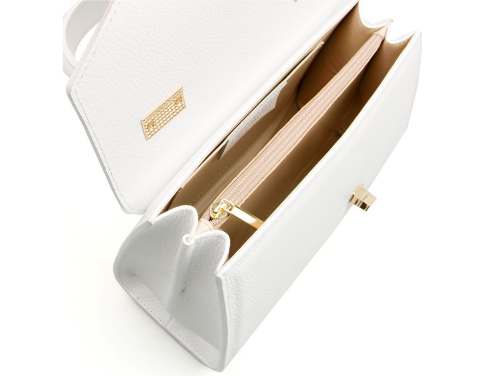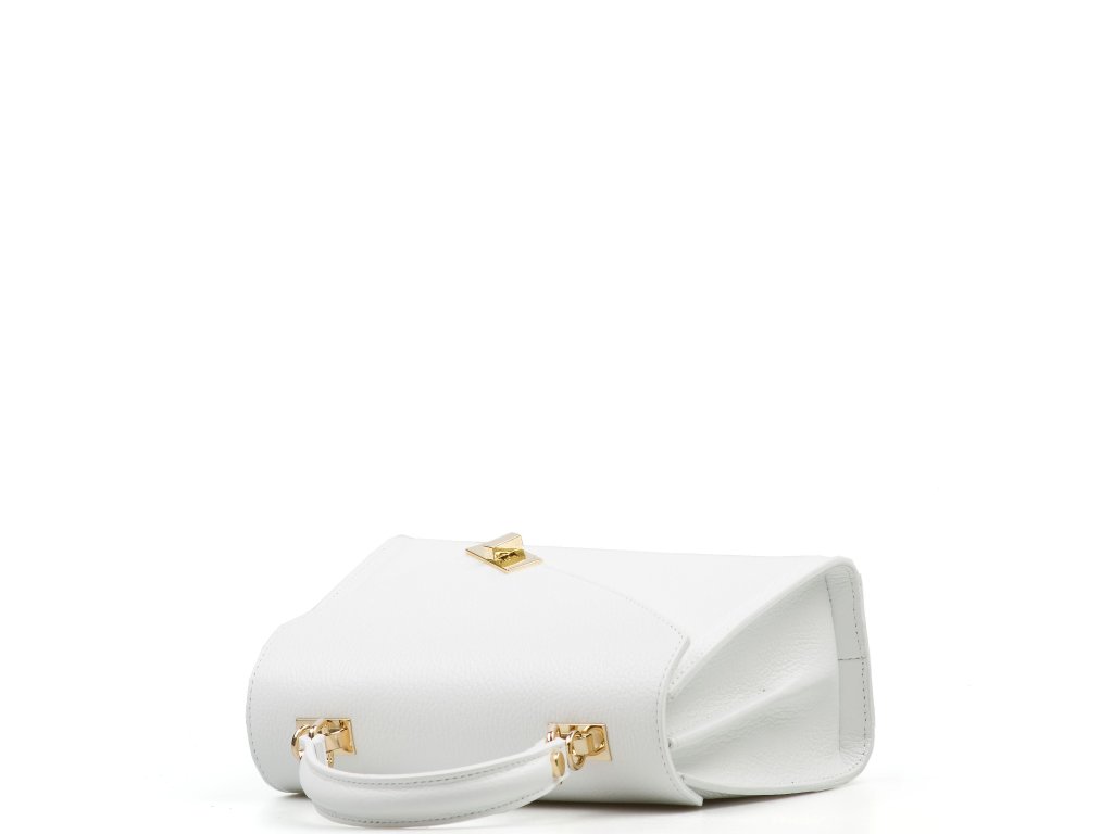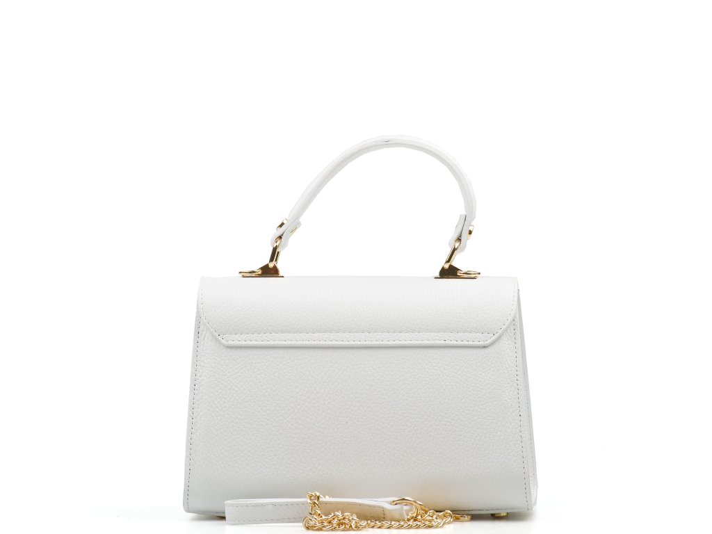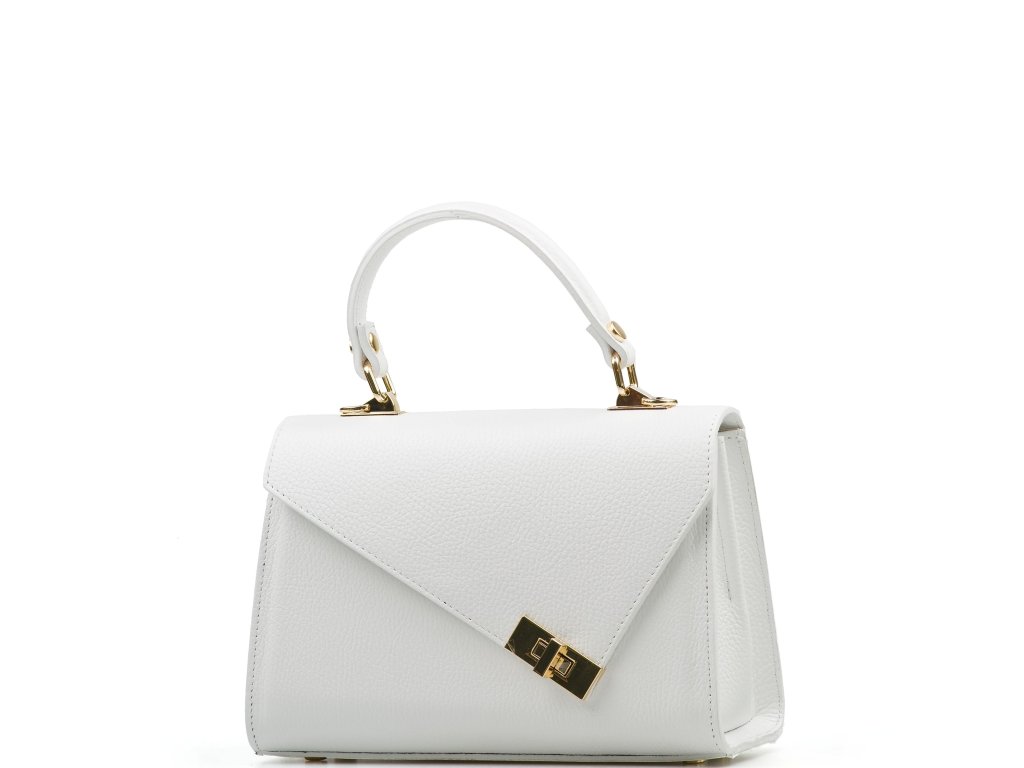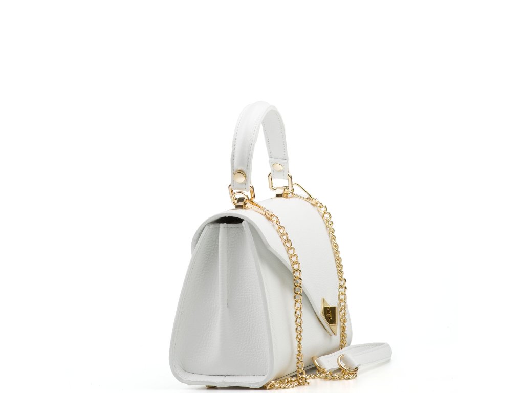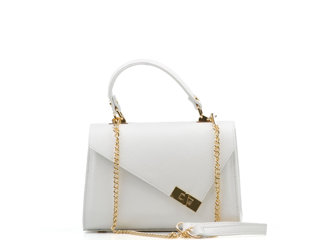 Kožená kabelka do ruky v bielej farbe. Interiér kabelky má k dispozícii tri úložné vrecká, uprostred na zips. Kabelku môžete nosiť v ruke alebo cez telo, pomocou prídavného retiazkového popruhu. Kabelku zdobí zlaté kovanie a asymetrická klopa. Kabelka je uzatvárateľná chlopňou.