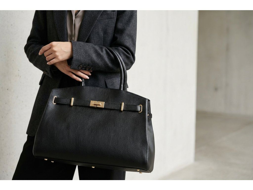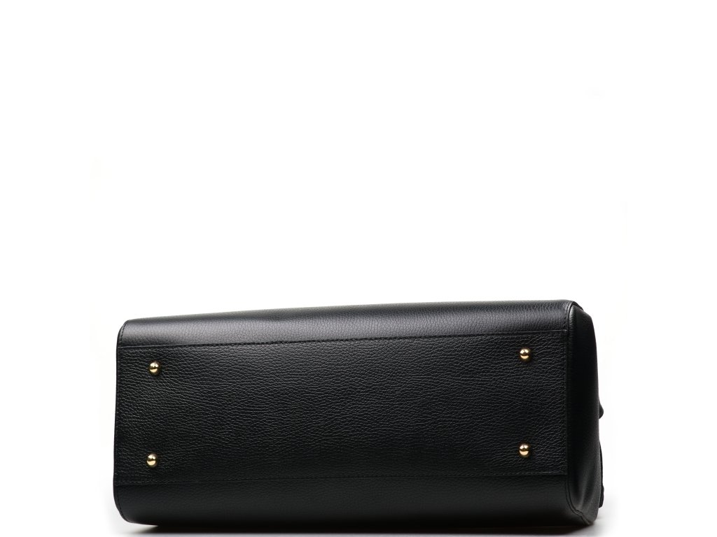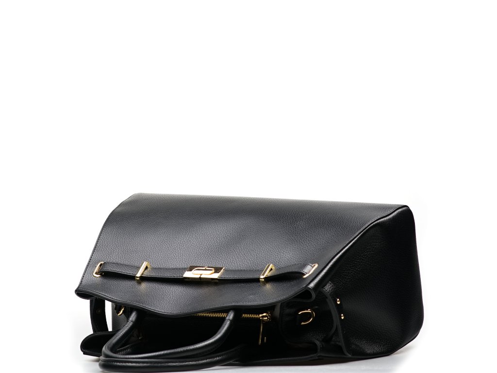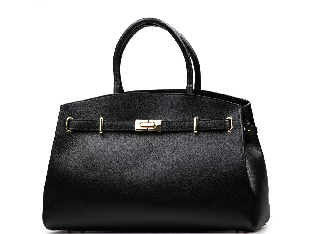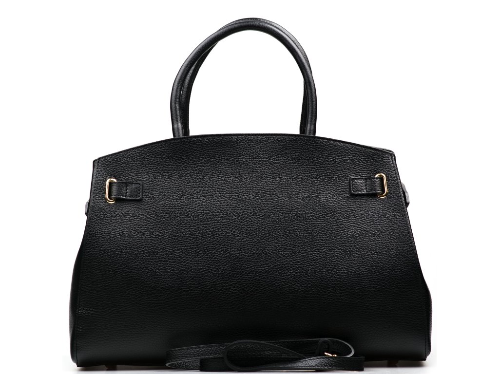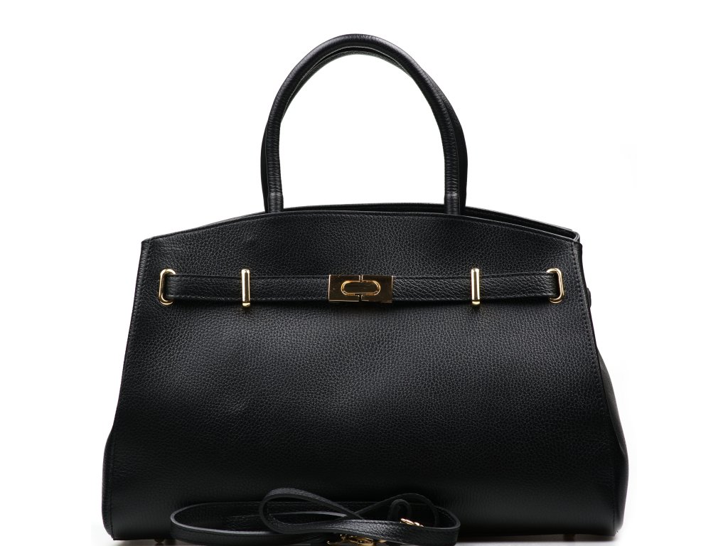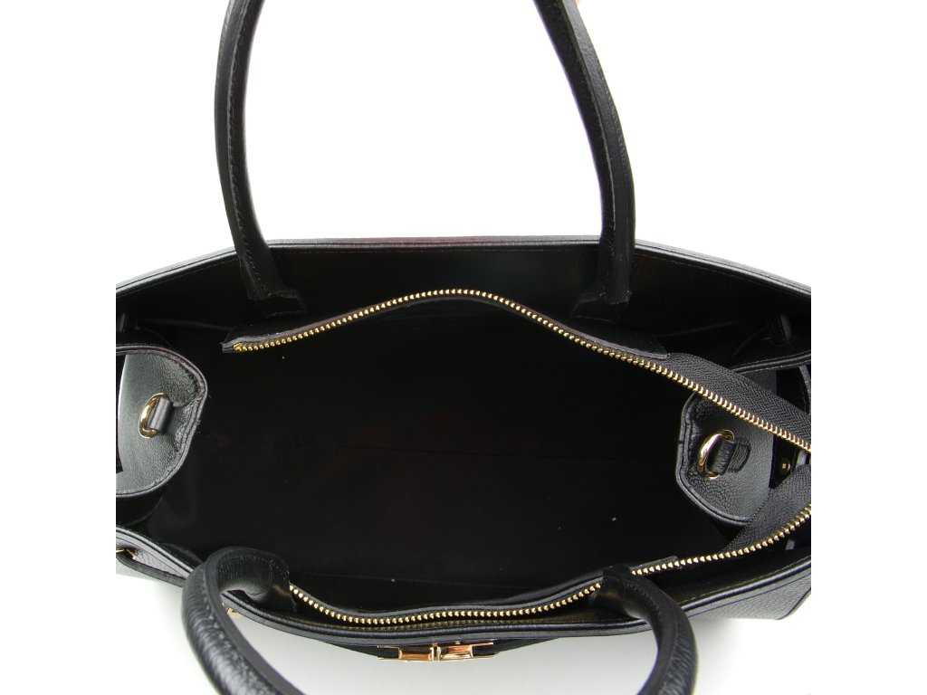 Kožená kabelka v čiernej farbe je elegantným a nadčasovým doplnkom, ktorý je možné nosiť v ruke aj cez rameno. Interiér ponúka jedno priestranné hlavné vrecko a menšie bočné vrecko na prehľadné uloženie drobností. Hornú časť kabelky zdobí kožený popruh so zlatými sponami, ktorý podčiarkuje jej sofistikovaný vzhľad. Uzatváranie na zips zaisťuje, že všetky osobné veci zostanú bezpečne uložené. Kabelka disponuje prídavným popruhom. Štýlový a praktický kúsok, ktorý ľahko doplní každý outfit.