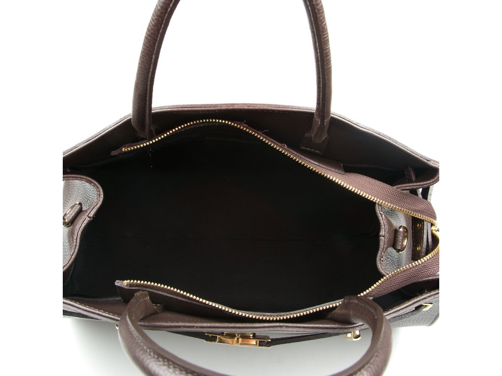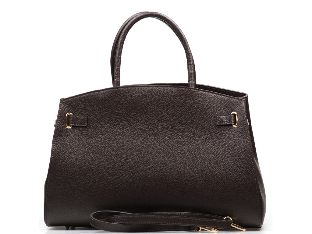 Kožená kabelka v tmavo hnedej farbe je elegantným a nadčasovým doplnkom, ktorý je možné nosiť v ruke aj cez rameno. Interiér ponúka jedno priestranné hlavné vrecko a menšie bočné vrecko na prehľadné uloženie drobností. Hornú časť kabelky zdobí kožený popruh so zlatými sponami, ktorý podčiarkuje jej sofistikovaný vzhľad. Uzatváranie na zips zaisťuje, že všetky osobné veci zostanú bezpečne uložené. Kabelka disponuje prídavným popruhom. Štýlový a praktický kúsok, ktorý ľahko doplní každý outfit.