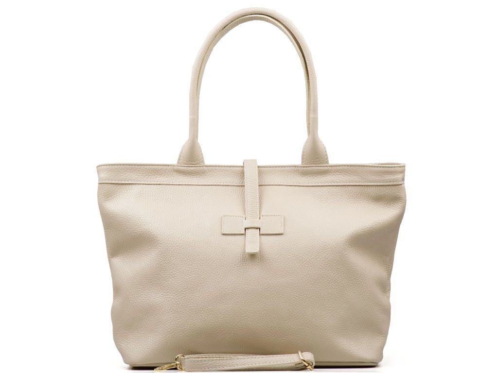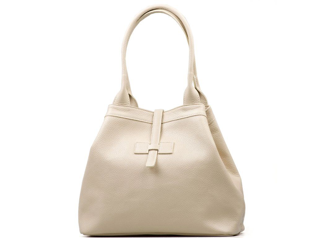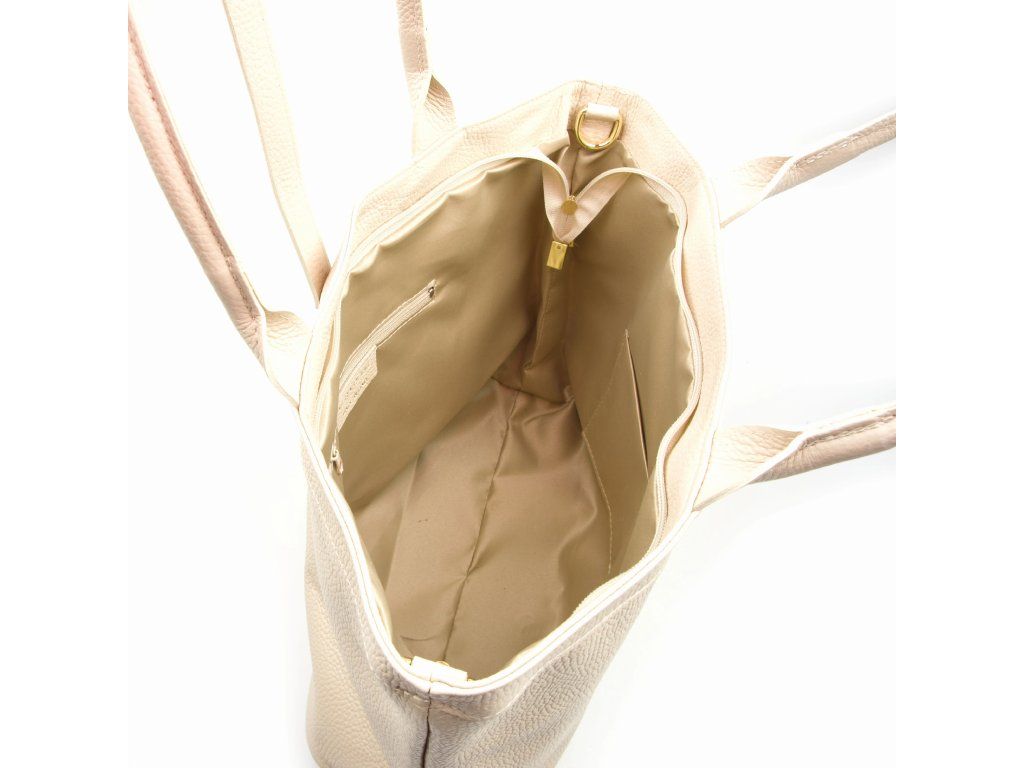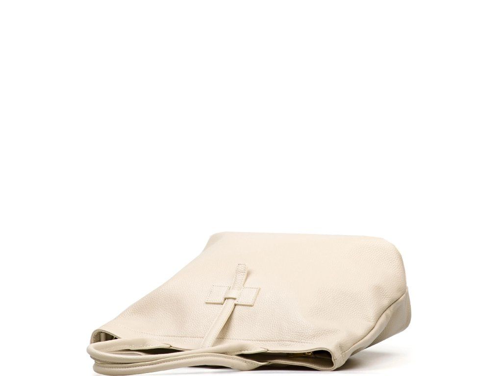 Kožená shopper kabelka do ruky aj cez rameno v béžovej farbe. Vďaka vnútornému zapínaniu karabínou je možné kabelku nosiť v štvorcovom prevedení alebo zopnutú. Súčasťou kabelky je prídavný popruh s karabínami. Interiér kabelky má k dispozícii jedno hlavné úložné vrecko a malé po bokoch. Kabelka sa uzatvára zipsom a koženým pásikom.