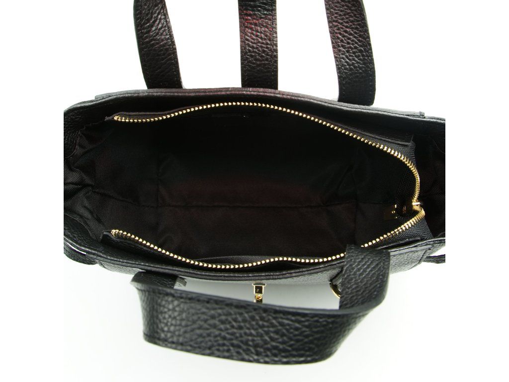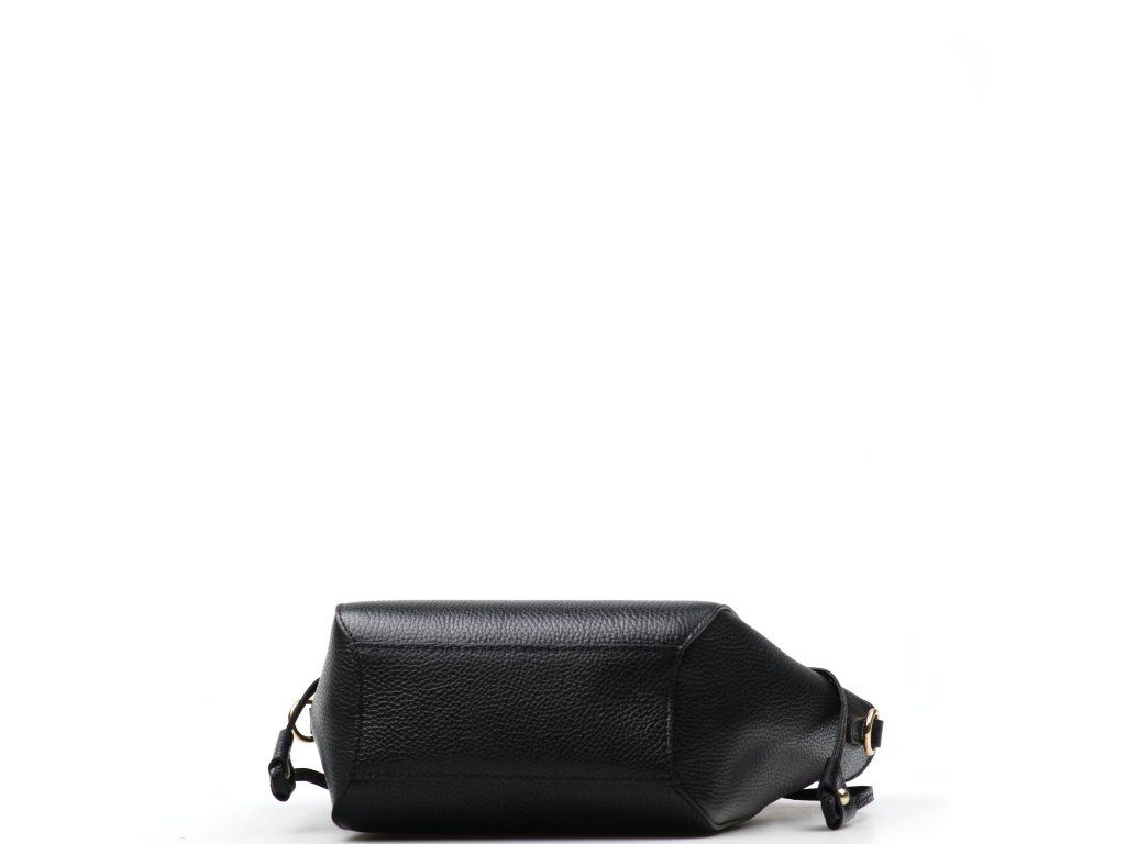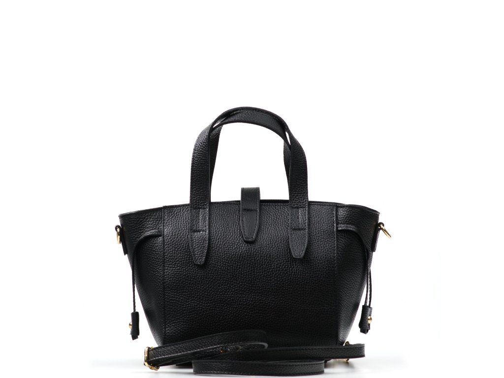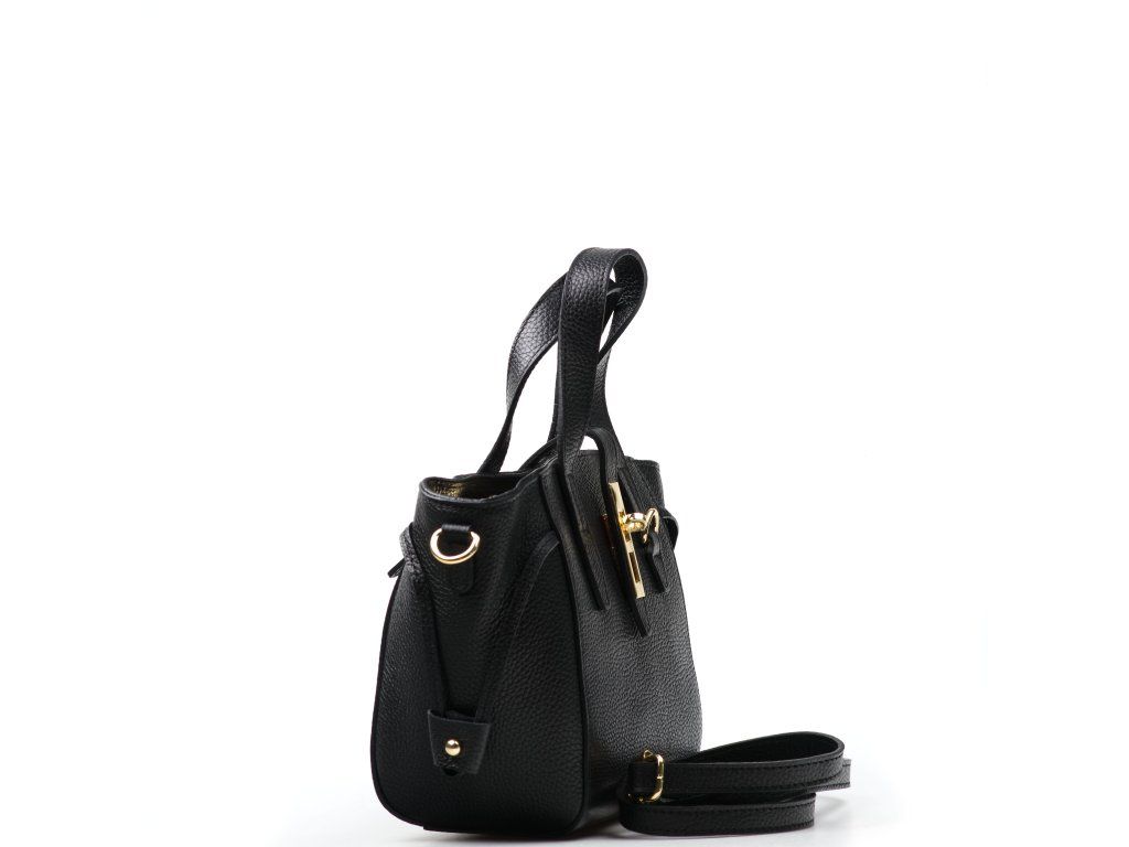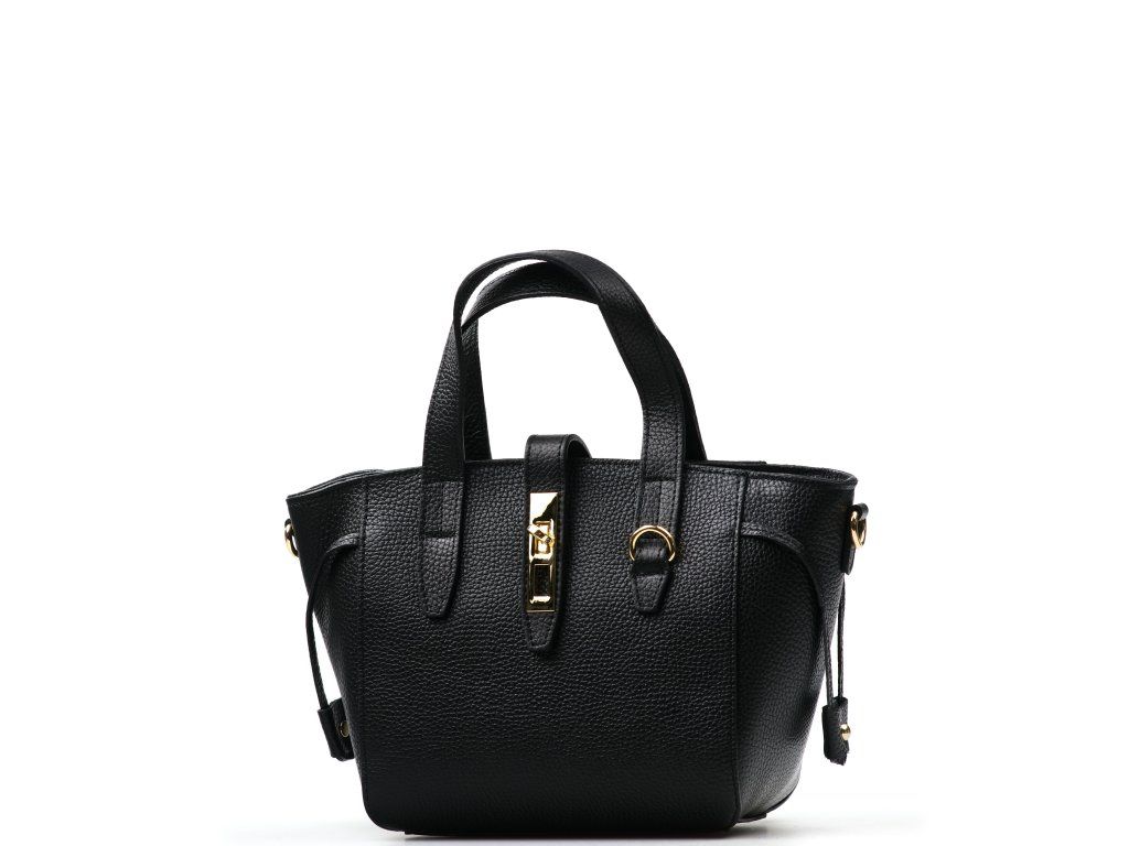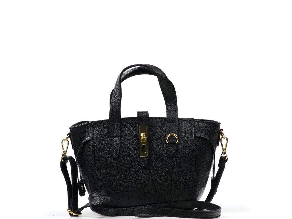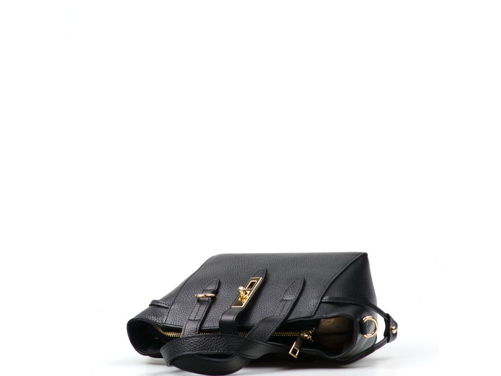 Kožená kabelka do ruky aj cez rameno v čiernej farbe. Interiér kabelky disponuje jedným hlavným vreckom a jedným malým bočným, ktoré je uzatvárateľné zipsom. Súčasťou kabelky je prídavný popruh s karabínami s nastaviteľnou dĺžkou. Hornú časť kabelky zdobí kožený popruh so zlatými sponami.