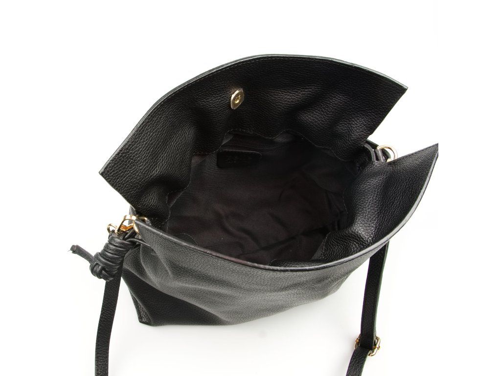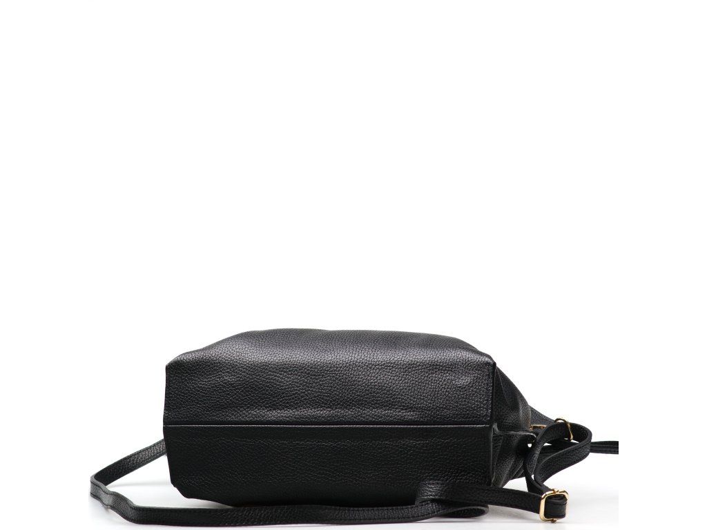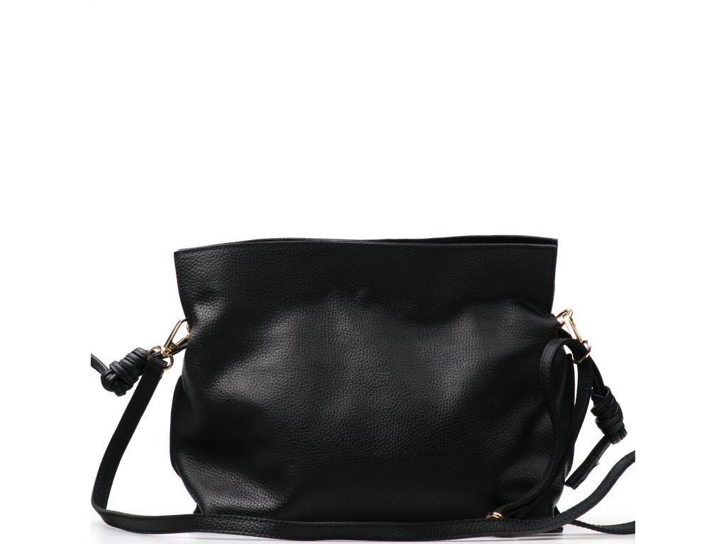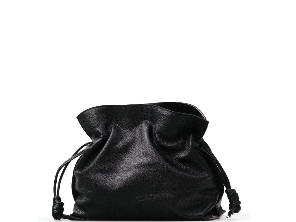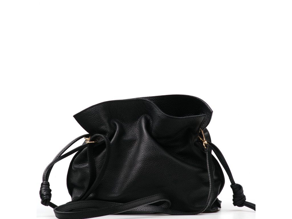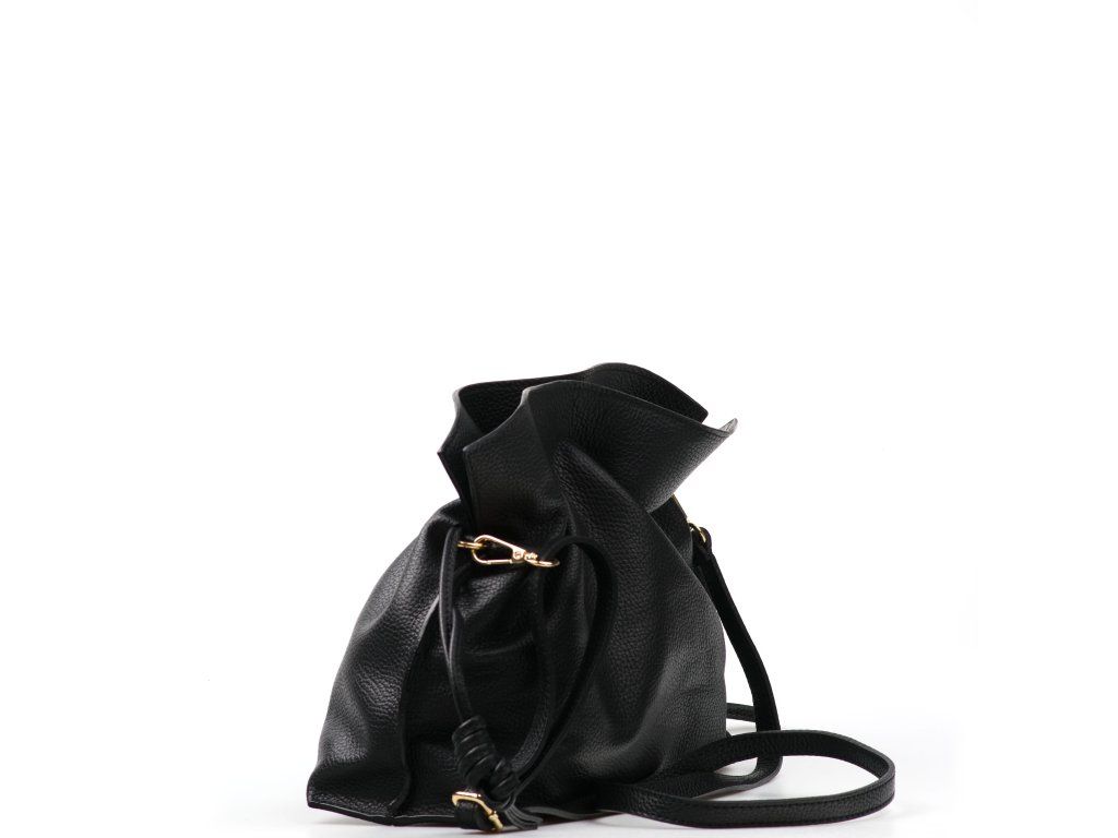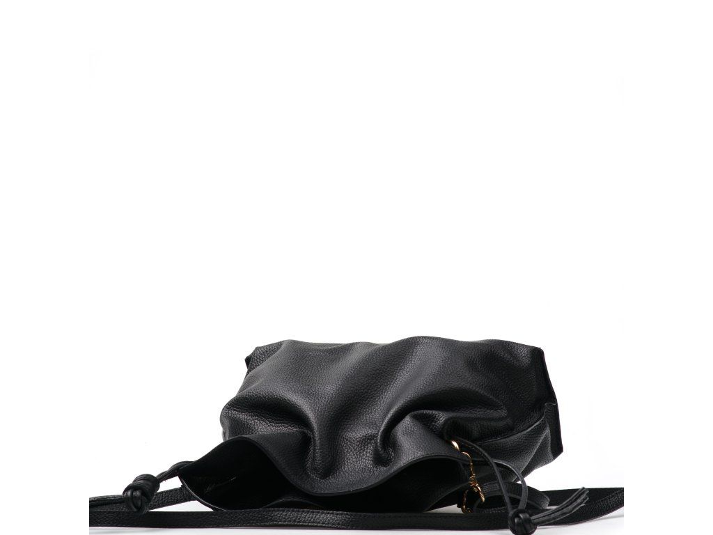Kožená kabelka v tvare vrecúška v čiernej farbe zaujme svojim originálnym dizajnom a jemným spracovaním. V hornej časti sa sťahuje koženou šnúrkou, ktorá vytvára efektné nariasenie kože a dodáva kabelke šarm. Súčasťou je odnímateľný prídavný popruh s karabínami, vďaka ktorému je možné ju nosiť nielen v ruke, ale aj cez rameno či ako crossbody. Interiér ponúka jedno priestranné hlavné vrecko pre všetky nevyhnutnosti. Kabelka sa uzatvára cvočkom a je ideálnym doplnkom pre každodenné nosenie aj špeciálne príležitosti.